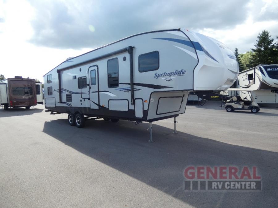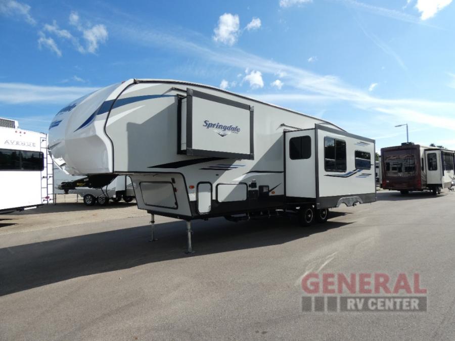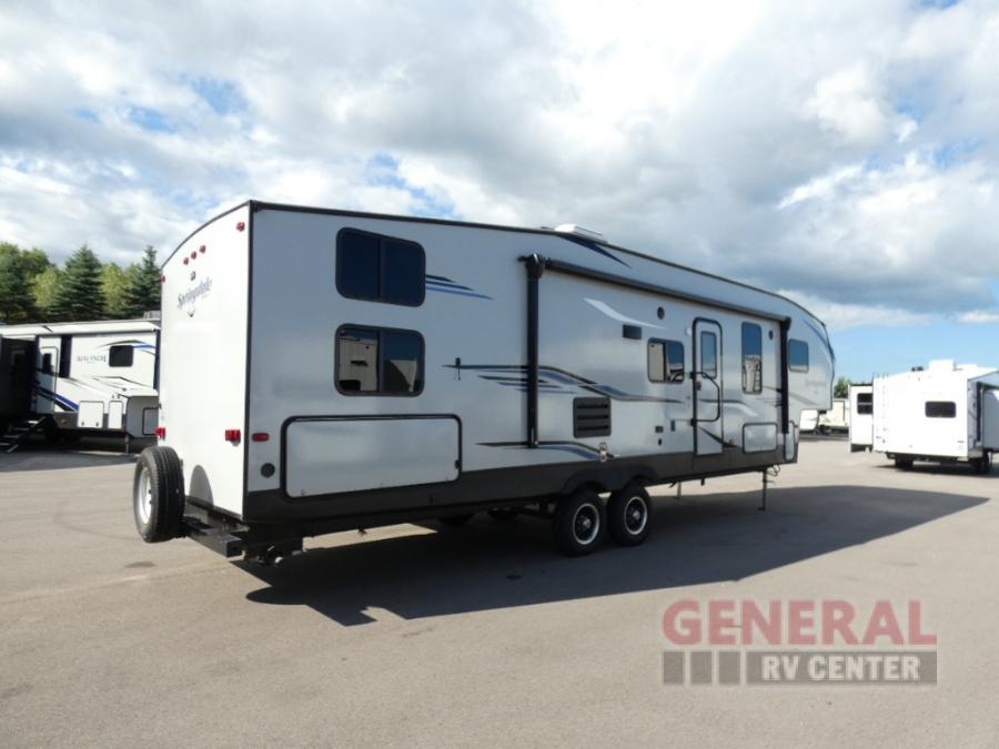 In any Keystone Springdale fifth wheel, you will find premium features to make your camping experience feel like a home away from home. Some of these features are a 7 cu. ft. refrigerator, a reversible bedspread, and a DVD/CD/MP3/Bluetooth stereo. These fifth wheels will provide you and your family with all of the travel conveniences you want and expect without costing you a fortune. Each model includes a fully walkable roof, Dexter E-Z Lube axles, and a mega pass-through storage compartment to hold all of your gear. These are just a few of the standards that create a unit built to last through your adventurous excursions! So come today and pick a Keystone Springdale fifth wheel that best suits you!