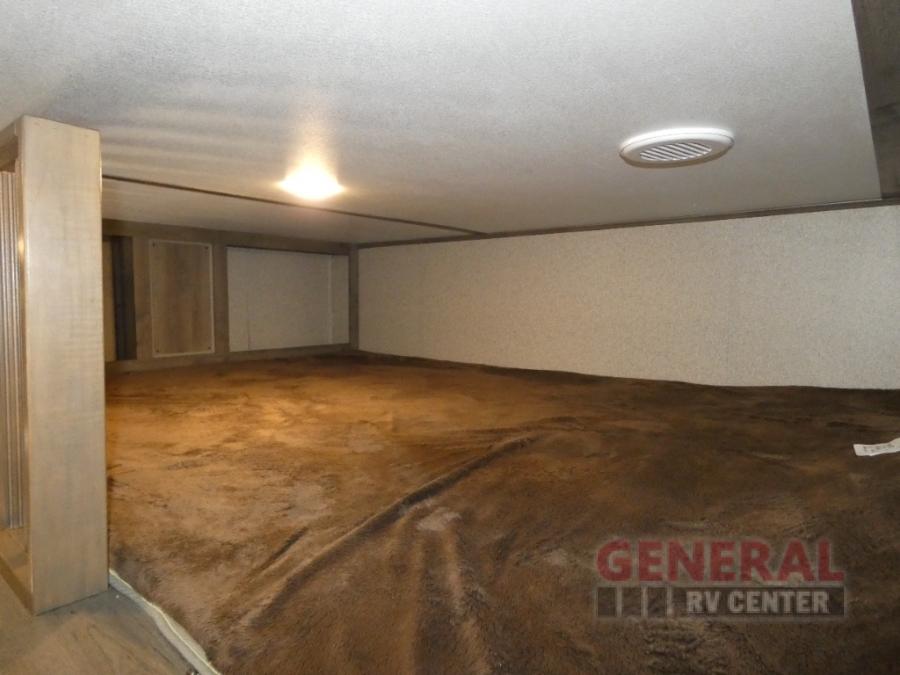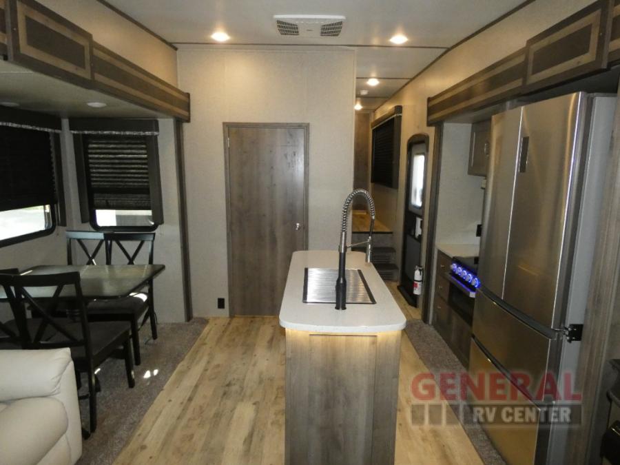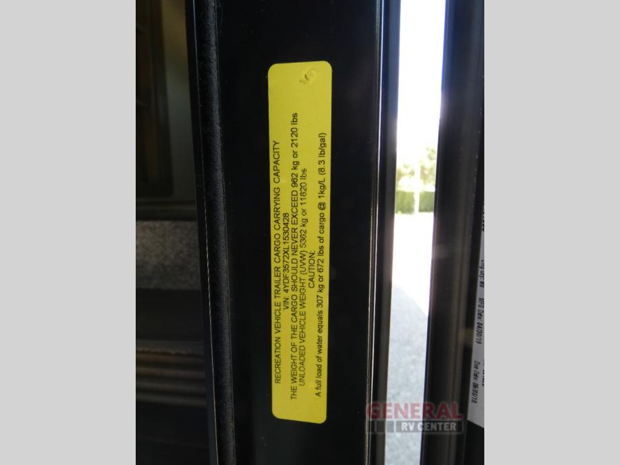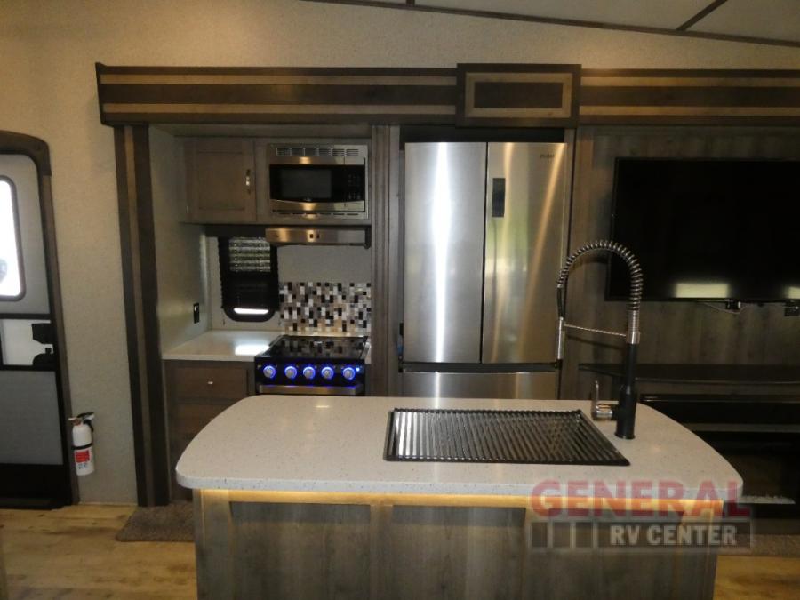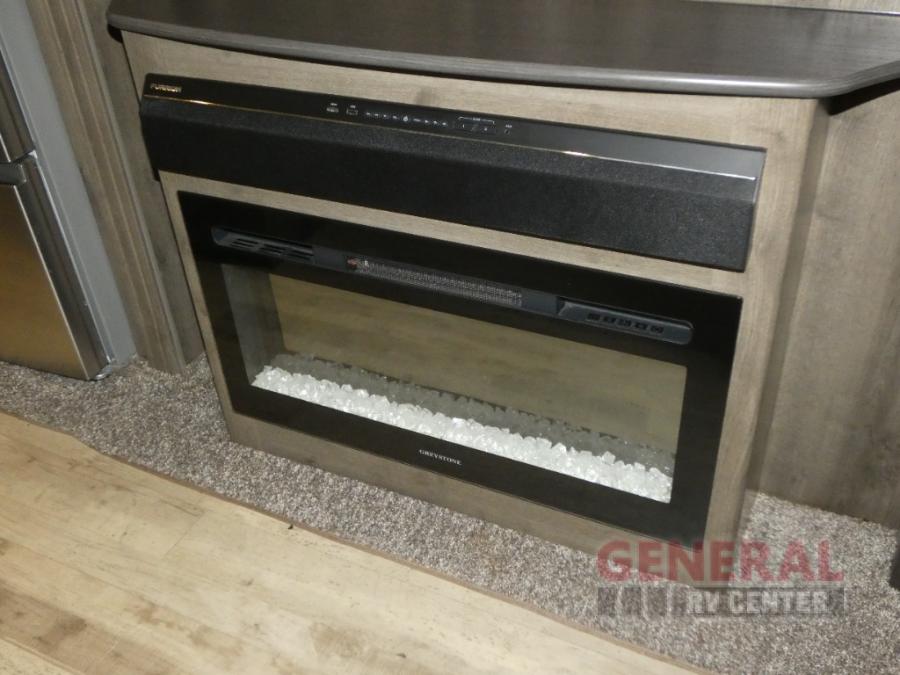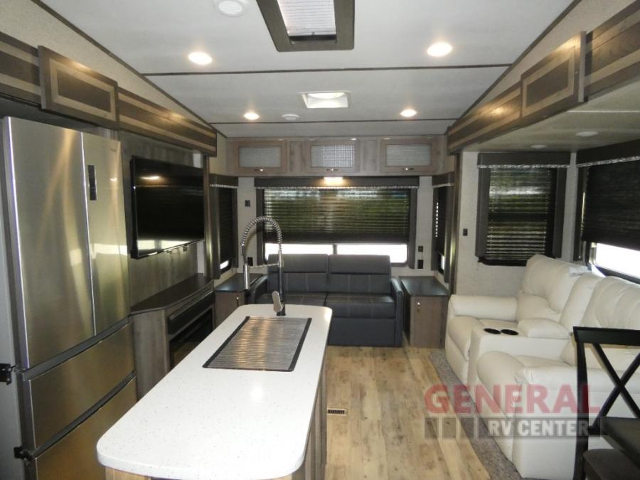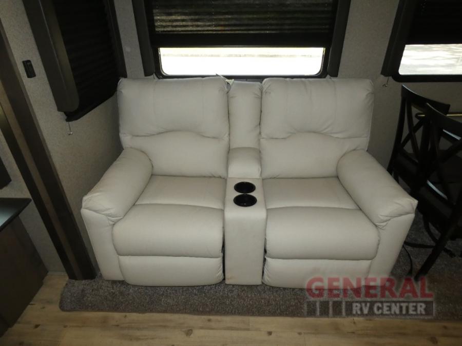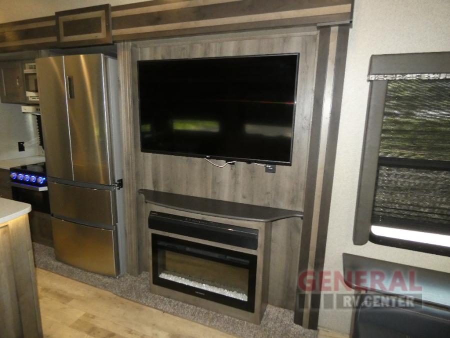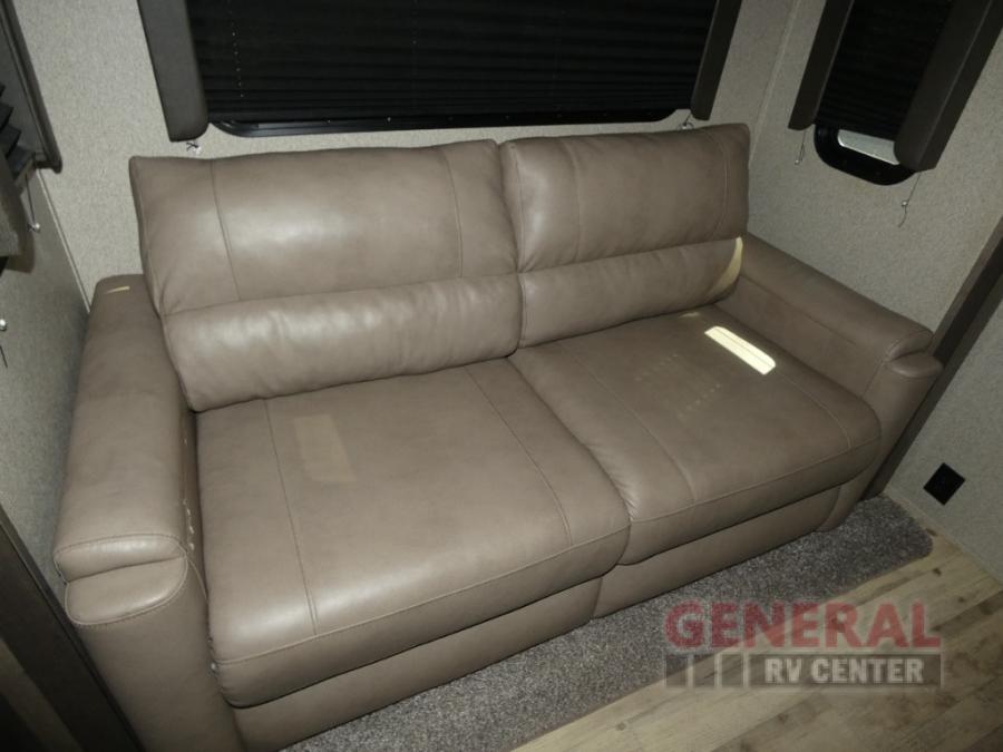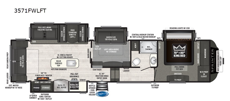 You will find that this 3571FWLFT fifth wheel is very similar to model 3570FLFT, the only difference is that this model features a 16 cu. ft. stainless steel residential refrigerator! There is not only a front private bedroom, but also a second bedroom featuring a tri-fold sofa that can transform into a queen-sized bed and a loft area above it. You will enjoy all of the convenient features this model has to offer like the outlets on either side of the king-sized bed, the residential shower with a seat and skylight above it for natural lighting as you get ready in the mornings, and the closet prepped for you to add a washer and dryer so that you can extend your vacation even longer with clean clothes. The kitchen island features a stainless steel XL sink and faucet with a cutting board to make your meal prep even easier. What better way to wind down your nights than to relax on either the rear tri-fold sofa or the full reclining theater seating across from the 50" TV with a fireplace below it for true comfort!