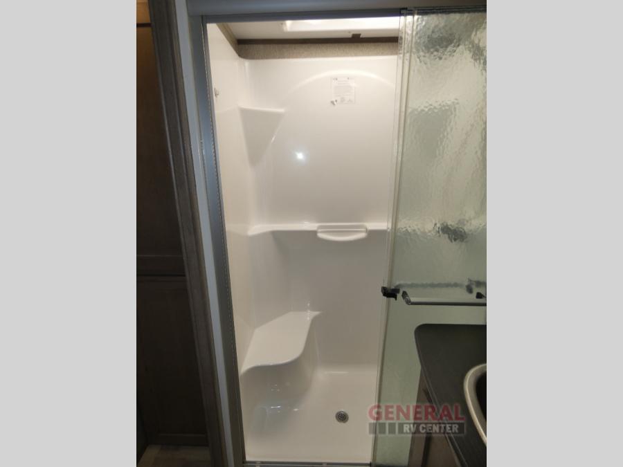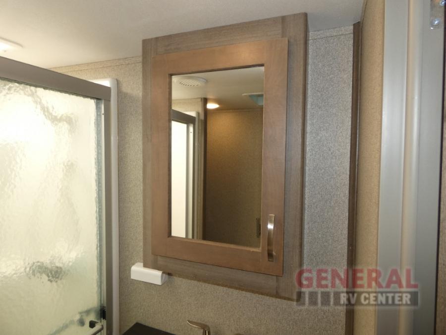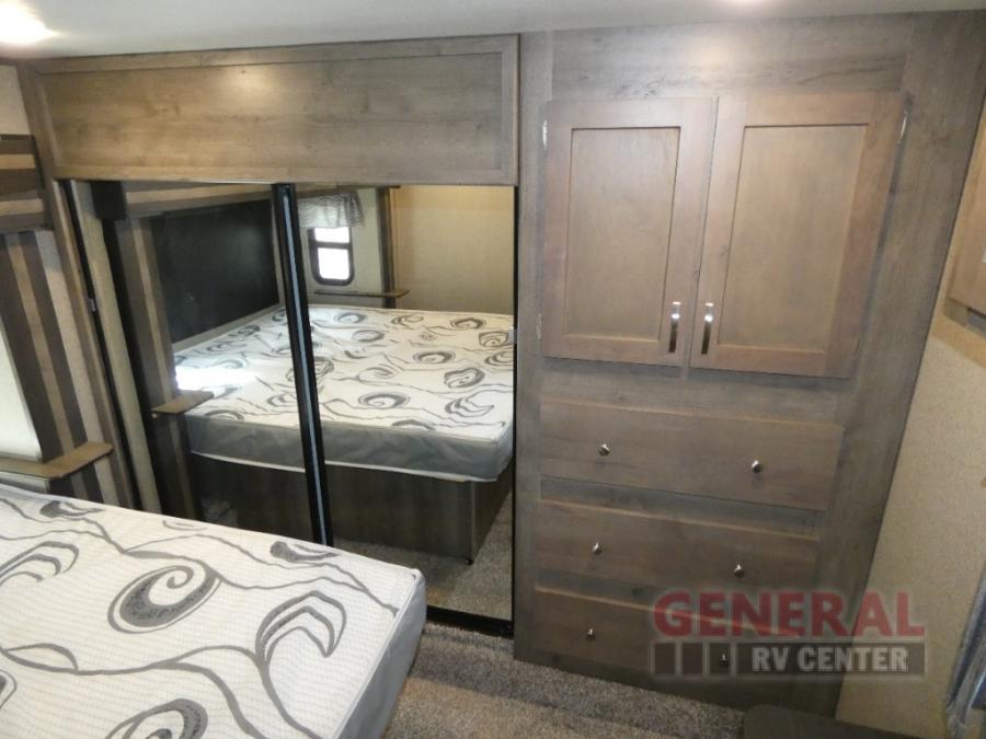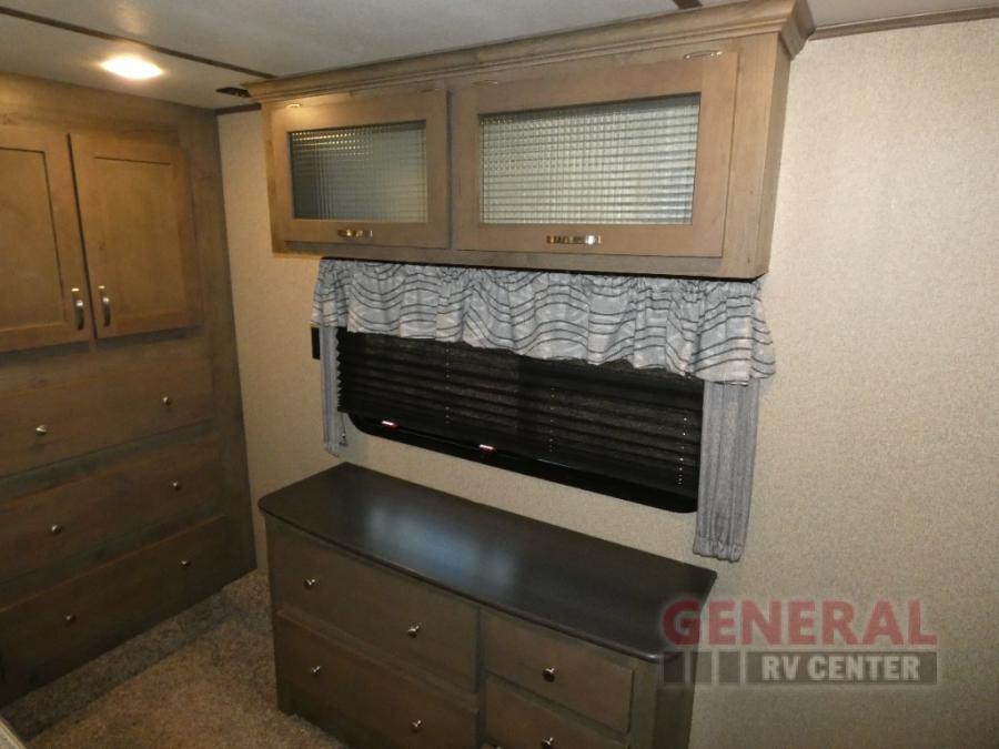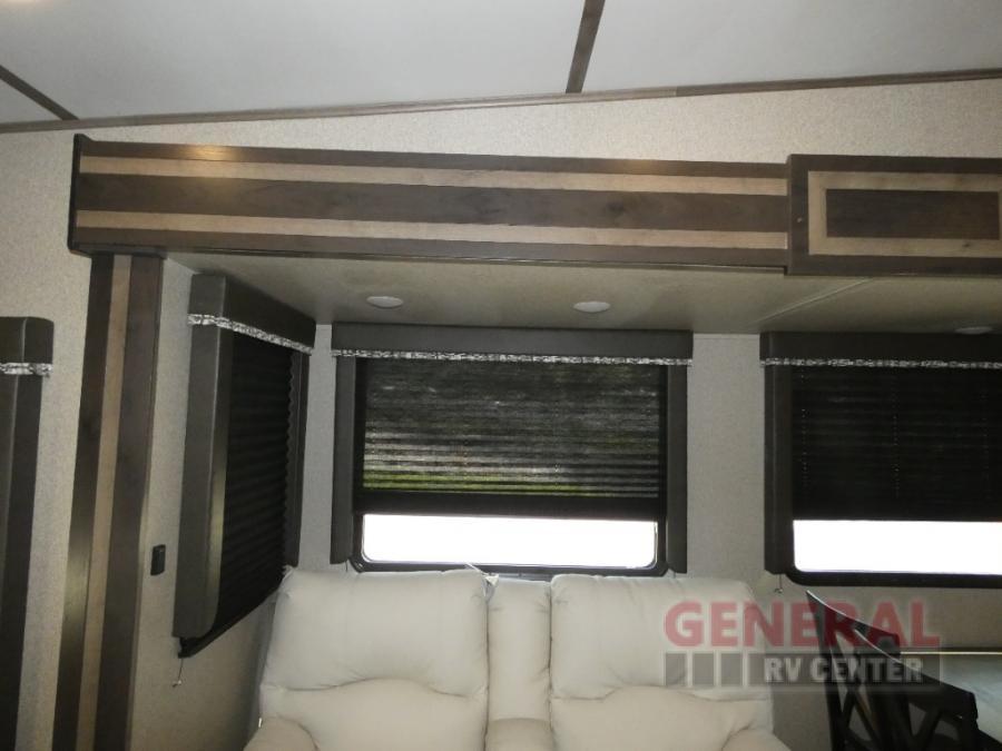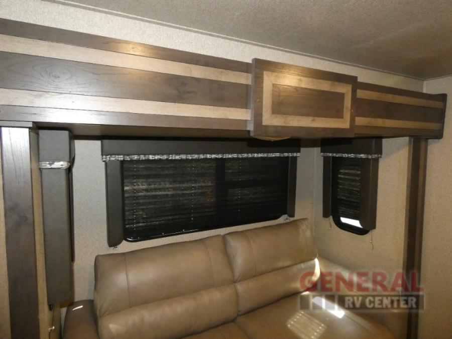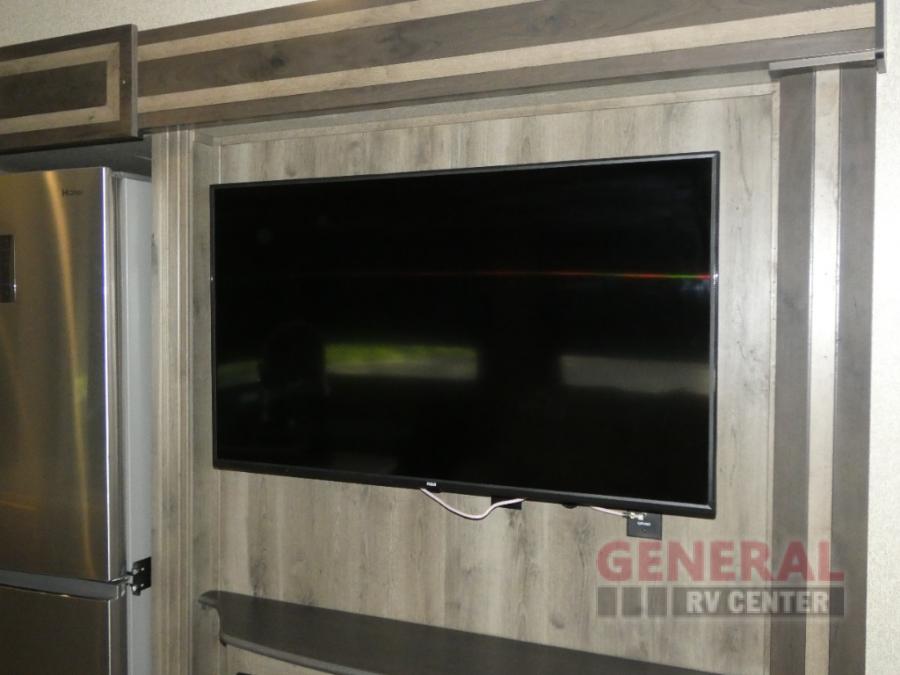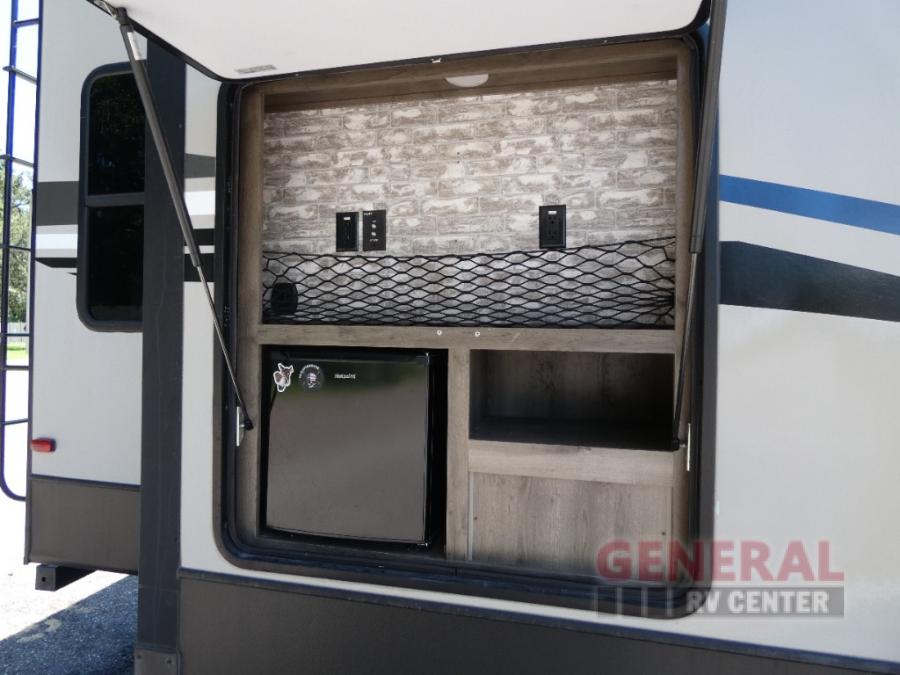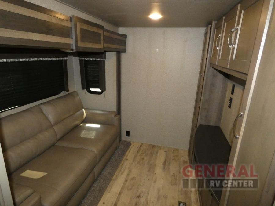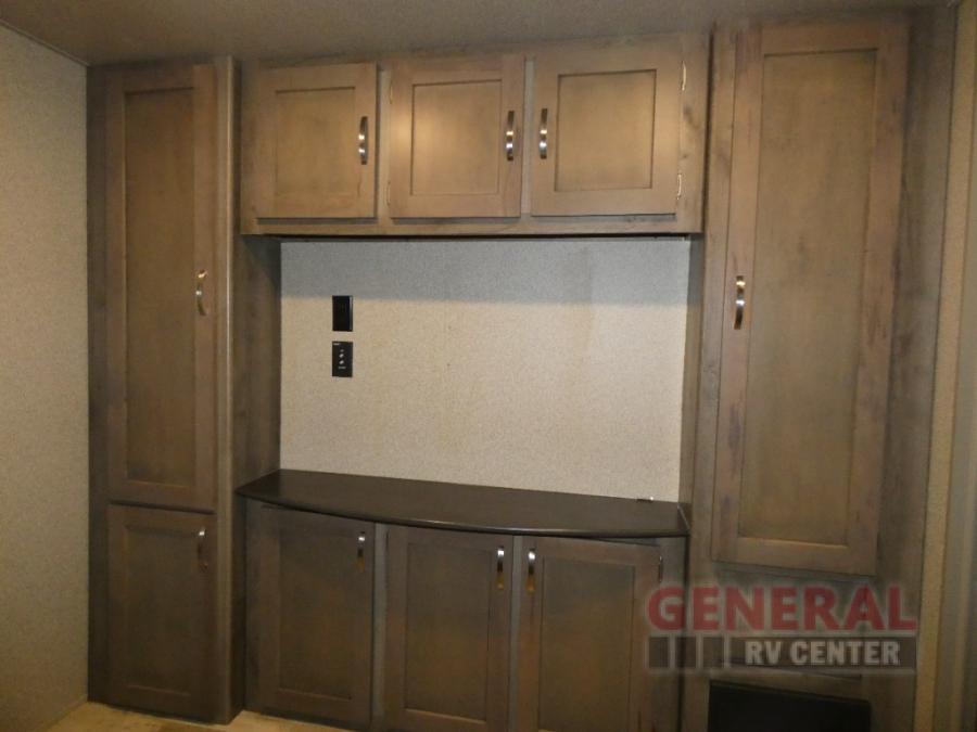 You will find that this 3571FWLFT fifth wheel is very similar to model 3570FLFT, the only difference is that this model features a 16 cu. ft. stainless steel residential refrigerator! There is not only a front private bedroom, but also a second bedroom featuring a tri-fold sofa that can transform into a queen-sized bed and a loft area above it. You will enjoy all of the convenient features this model has to offer like the outlets on either side of the king-sized bed, the residential shower with a seat and skylight above it for natural lighting as you get ready in the mornings, and the closet prepped for you to add a washer and dryer so that you can extend your vacation even longer with clean clothes. The kitchen island features a stainless steel XL sink and faucet with a cutting board to make your meal prep even easier. What better way to wind down your nights than to relax on either the rear tri-fold sofa or the full reclining theater seating across from the 50" TV with a fireplace below it for true comfort!