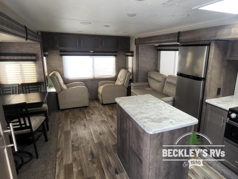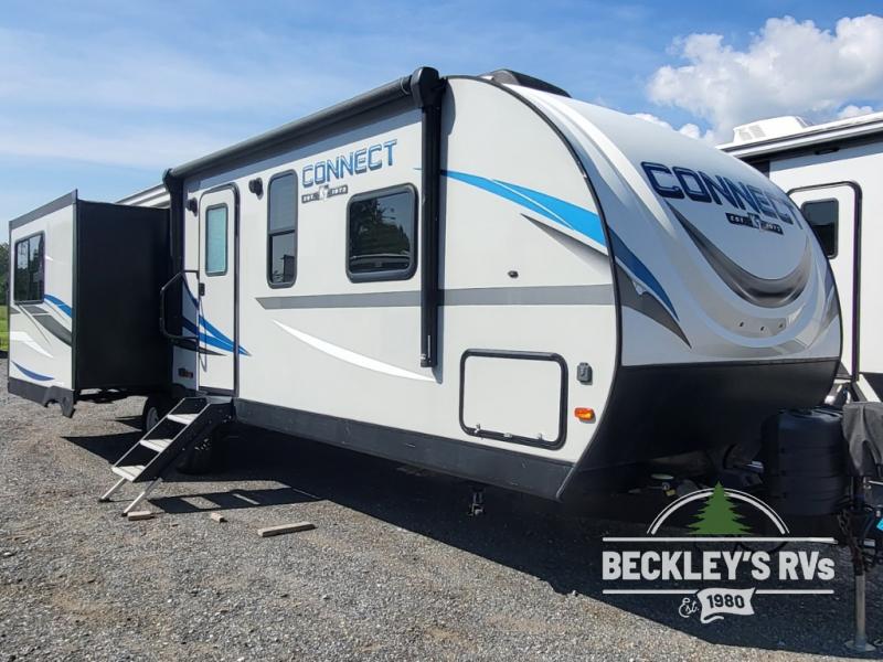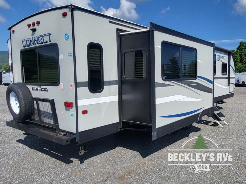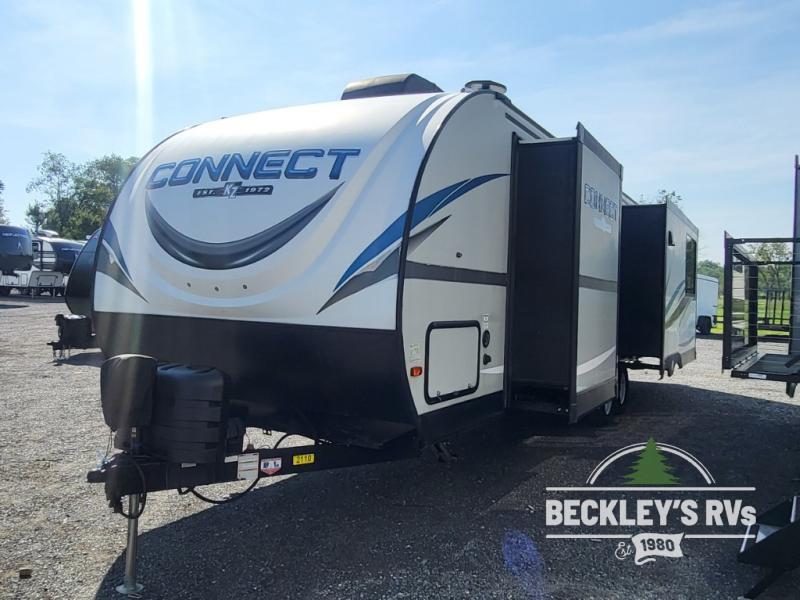 If you are looking for a trailer that is both stylish and comfortable, then you have found what you are looking for in this Connect travel trailer. Because there have been three slides added into this unit, there is plenty of extra floor space to walk around the kitchen and living area, and the bedroom. The kitchen island offers you more space to prepare and serve fabulous meals, and you can eat while sitting on the chairs, the sofa, and/or the booth dinette while watching the LED TV with a multimedia entertainment center. The master bedroom allows you to sleep on a queen bed, plus store your clothing in two wardrobes and inside the closet slide which also includes the bathroom's linen cabinet. You will find more features you will love like the USB port in the living area, the second entry into the bathroom, and all the storage throughout including along the exterior.