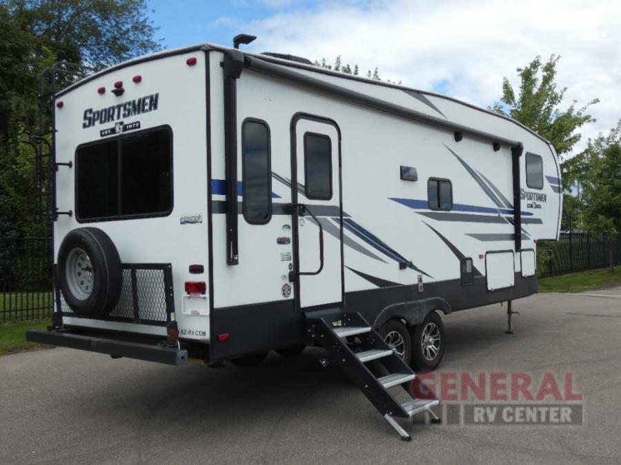 With any KZ Sportsmen fifth wheel there is a one-piece, seamless, walk-on, Tufflex roofing material providing high solar reflectivity, plus puncture and tear resistance offering protection from campground trees and hailstorms, and provides "give" while traveling. You will also appreciate the Climate package allowing you to travel when you like, the flip-up entry step for solid footing, and the rear 71" flip-down storage rack. Not only that, but you will also find interior amenities to match that level of worry-free travel with the KZ Engage powered by OneControl with a 5" screen, the 36" dinette storage bins, the motion-sensor lights, the residential-grade linoleum, and the two skylights.
