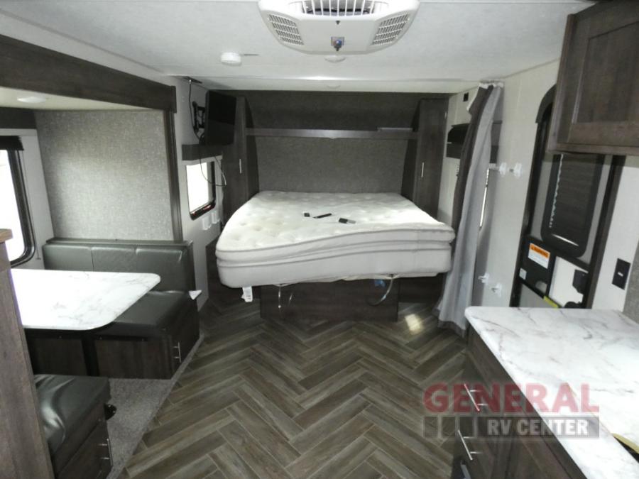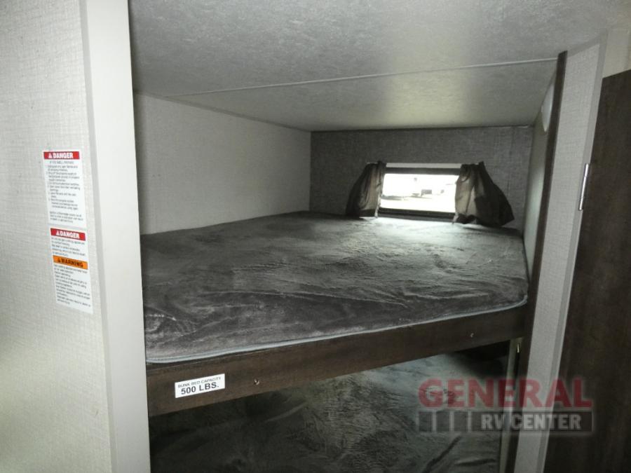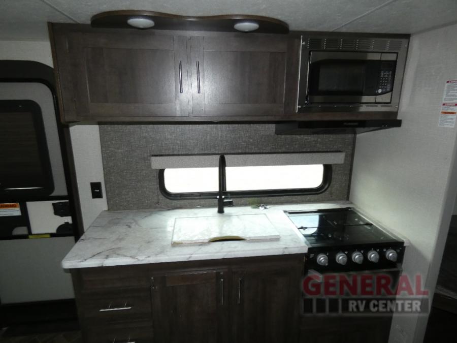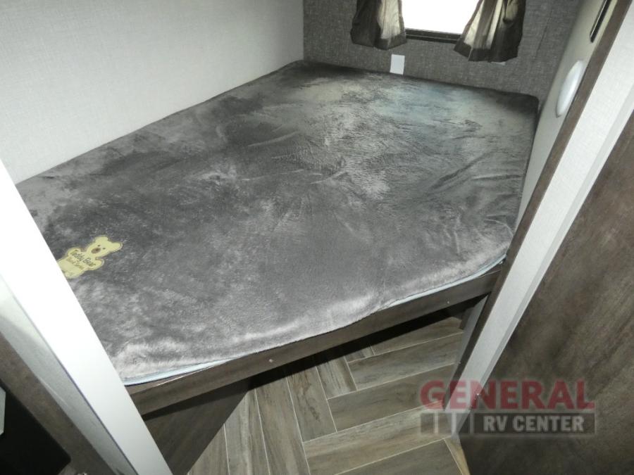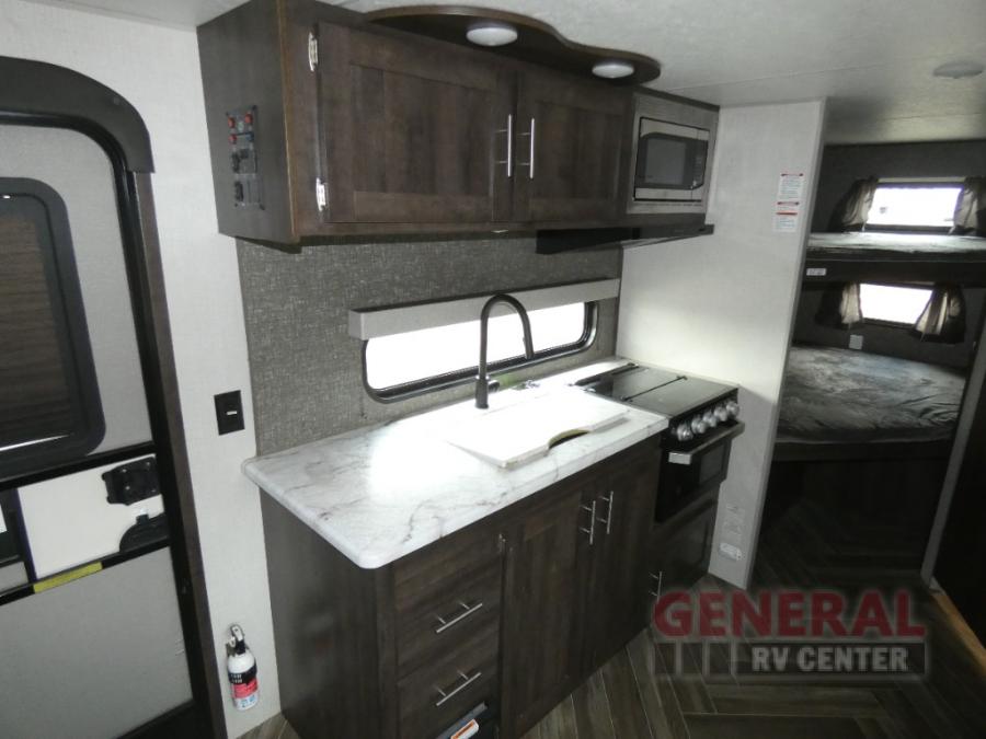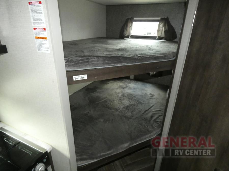 Camping has never been more fun than in this travel trailer that features double-sized bunks for the kids and a front king bed for you and your spouse. The rear corner bath is right next to the bunks for convenience at night and the single slide out provides a little more floor space for the dog to stretch out. The chef of the family will love being able to cook inside on the three burner cooktop or outdoors on the outside kitchen that includes a grill and a refrigerator. Enjoy your meals together under the 18' electric awning with LED lights and after dinner, the kids can play a game at the booth dinette.