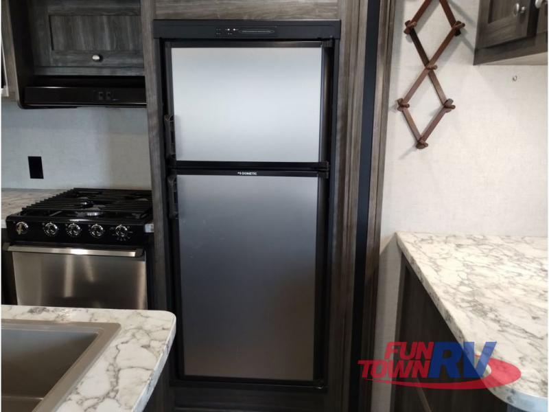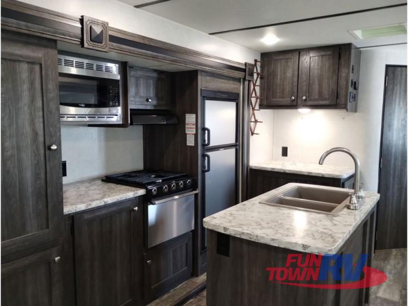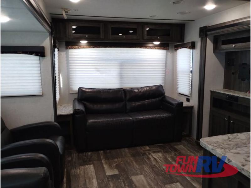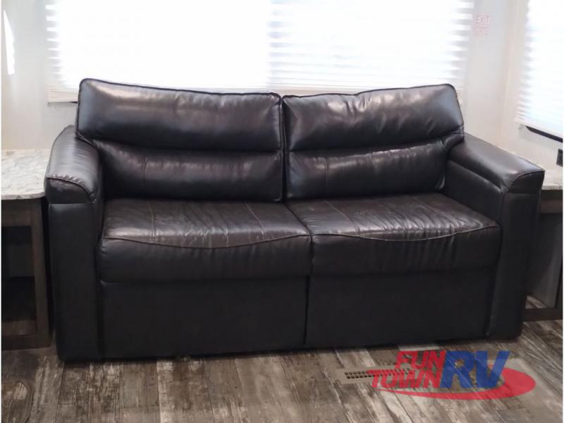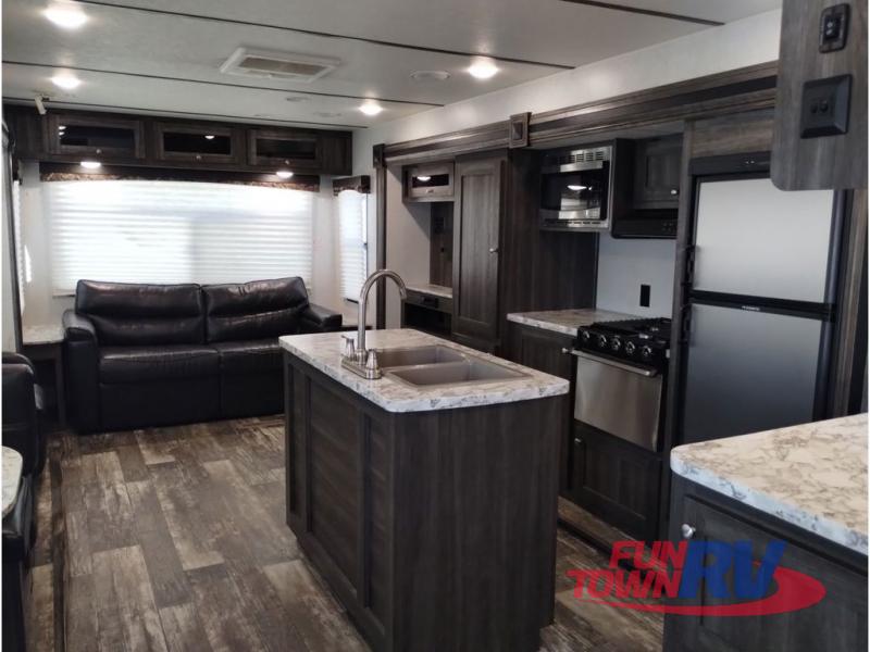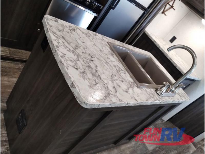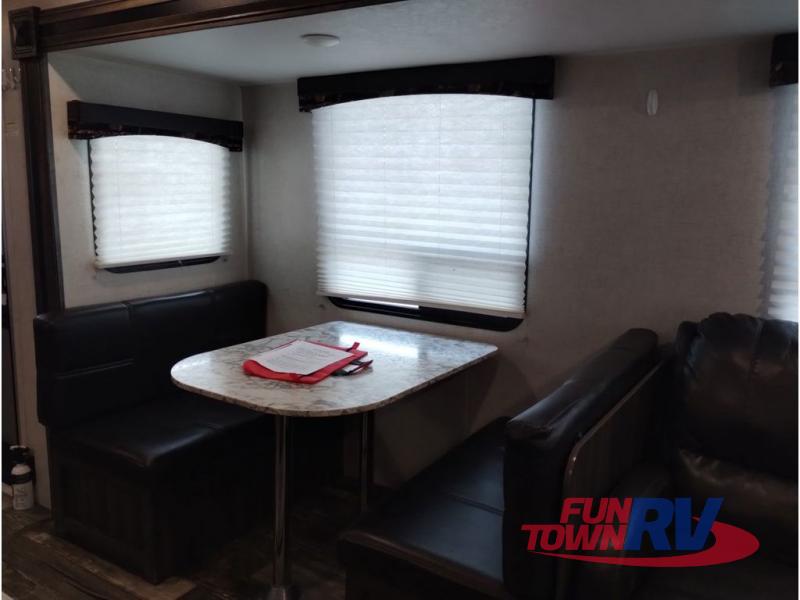 You won't want to go camping any other way after stepping inside this travel trailer! The rear living area is perfect for everyone to socialize together on either the rear sofa with tables on either side to hold your beverage of choice or one of the two recliner chairs. There is even a booth dinette for those who want to play some card games and it can also transform into an extra sleeping space too. The kitchen island will help make not only your meal prep easier, but also your clean up with the double bowl sink. When you're ready to hit the sack, head into the front private bedroom and enjoy a good night's rest on the queen bed!