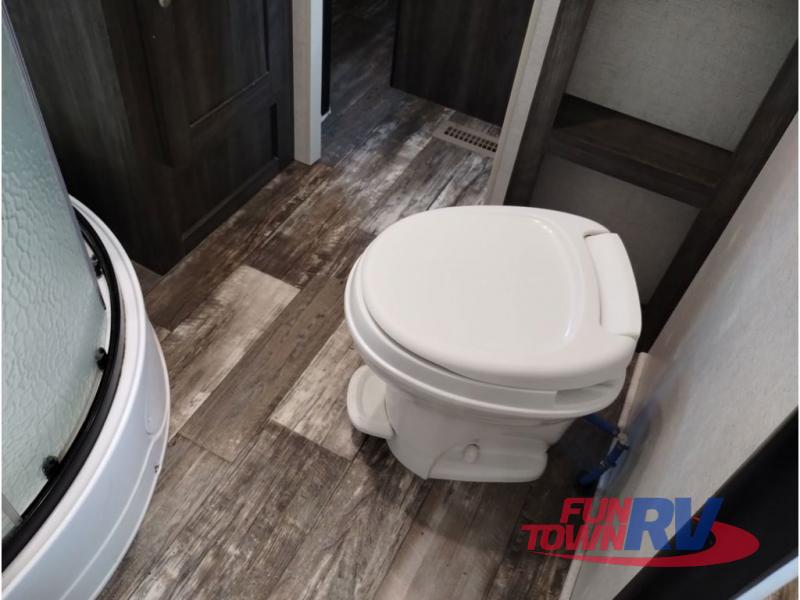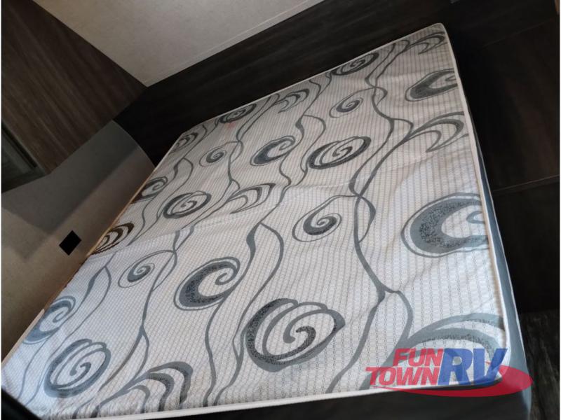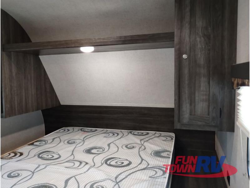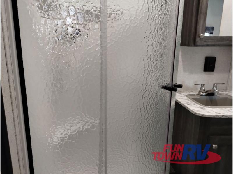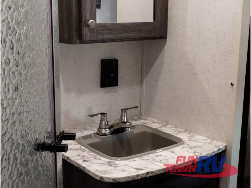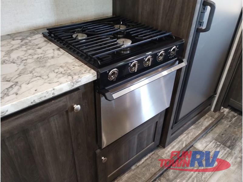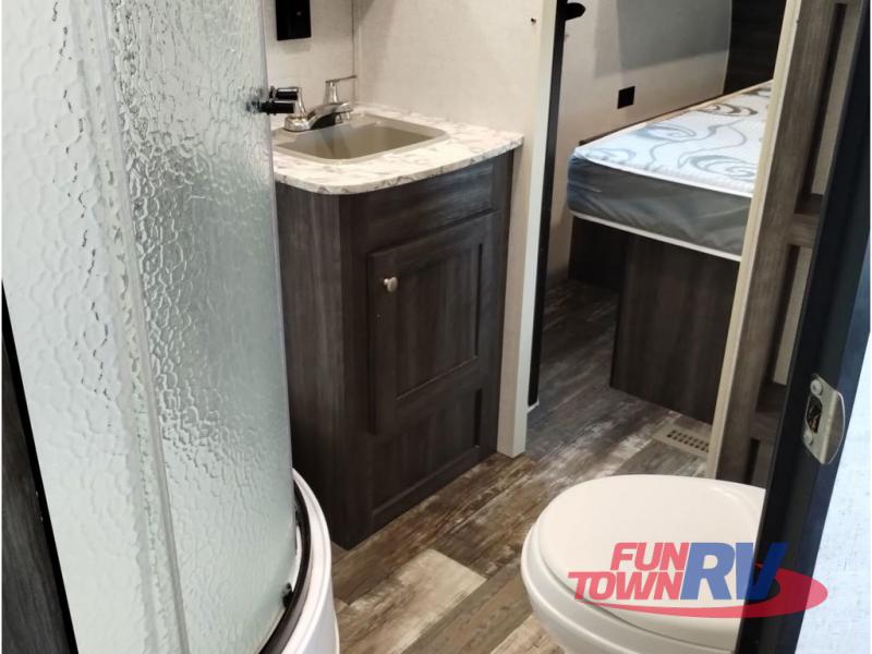 You won't want to go camping any other way after stepping inside this travel trailer! The rear living area is perfect for everyone to socialize together on either the rear sofa with tables on either side to hold your beverage of choice or one of the two recliner chairs. There is even a booth dinette for those who want to play some card games and it can also transform into an extra sleeping space too. The kitchen island will help make not only your meal prep easier, but also your clean up with the double bowl sink. When you're ready to hit the sack, head into the front private bedroom and enjoy a good night's rest on the queen bed!