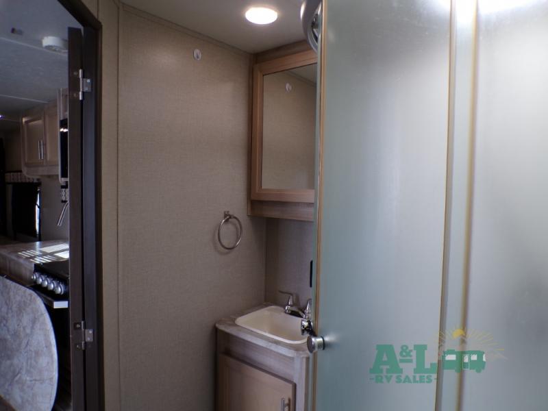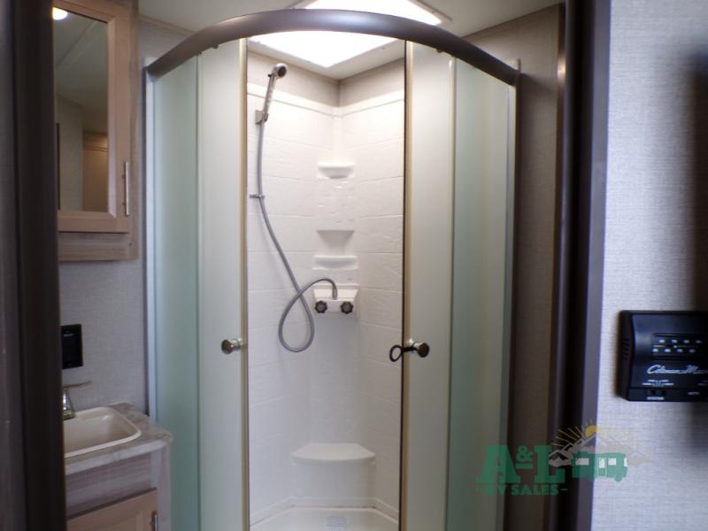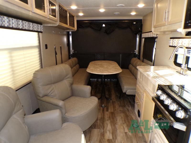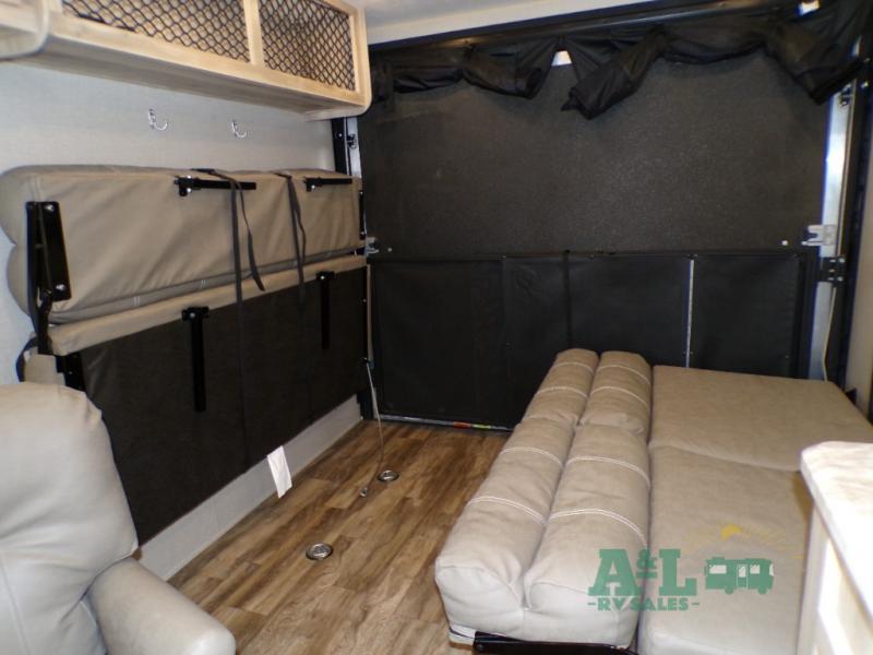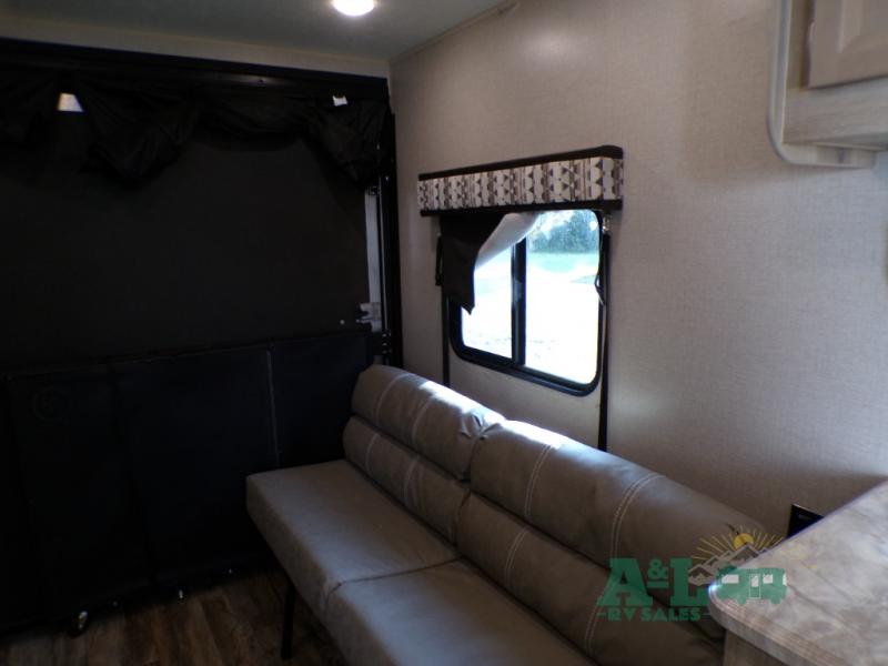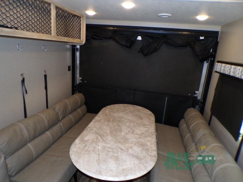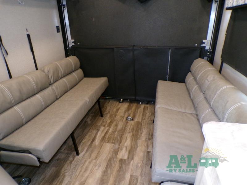 There are many reasons that you will want to own this Catalina Trail Blazer toy hauler, but one of those reasons is the great walk-through bathroom! Since there are entry doors on either side of this bathroom, you can access it from the main living area as well as from the front private bedroom. There is also a little bit of extra space in the bathroom since it spans the width of the trailer, and the shower skylight keeps this area bright. You'll definitely be spending most of your time out on the trails riding your bikes or out on the lake paddling your kayaks, but when you do come back inside this trailer, you will be met with two lounge recliners and two fold-down sofas with a dinette table in between so that you can just relax and recharge.