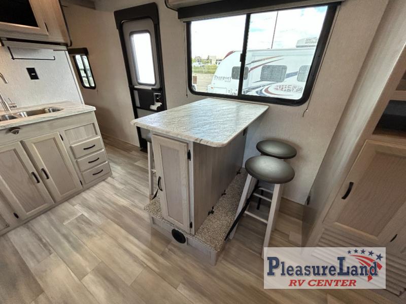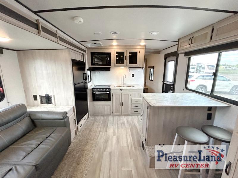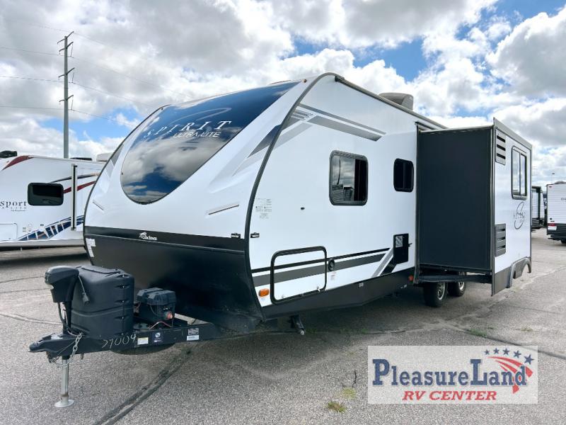 This family-friendly Spirit Ultra Lite travel trailer will make the kids happy thanks to the double-size bunk beds and two kids' convenience centers to call their own! You will have your own privacy in the front bedroom that has a walk-around queen bed with storage underneath as well as on the sides. Once you reach your destination, you can open up the 20' power awning and make lunch on the outside camp kitchen. Inside, you will love to play a game at the bar that includes four bar stools and convenient storage underneath, and you can take a load off on the sofa with end table for your drinks.