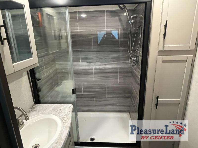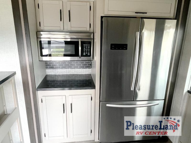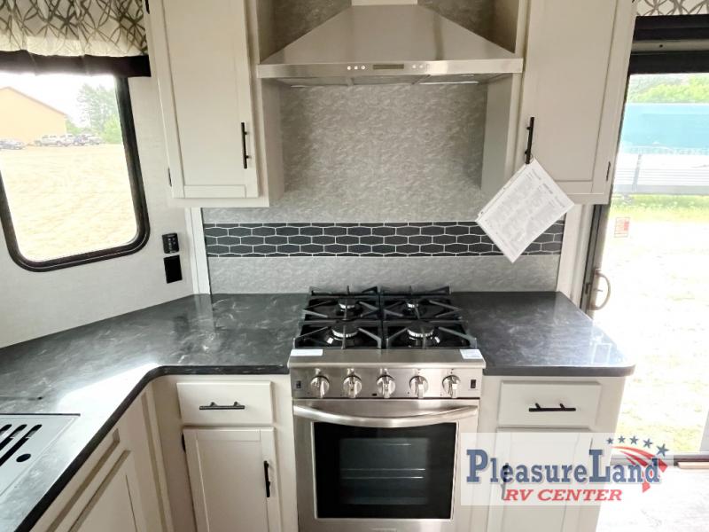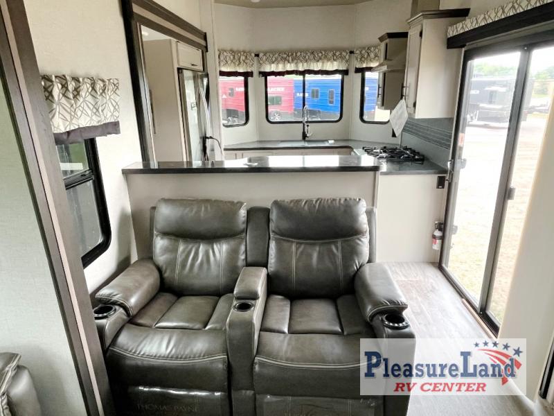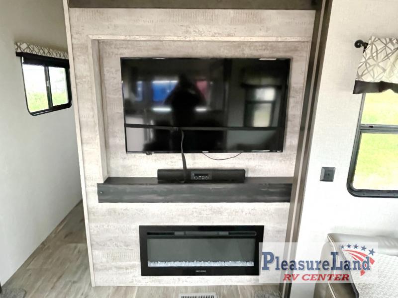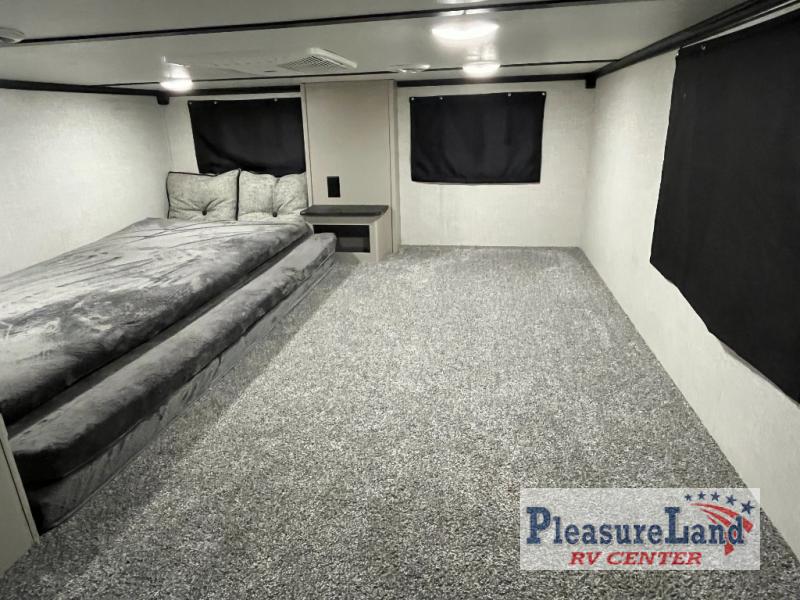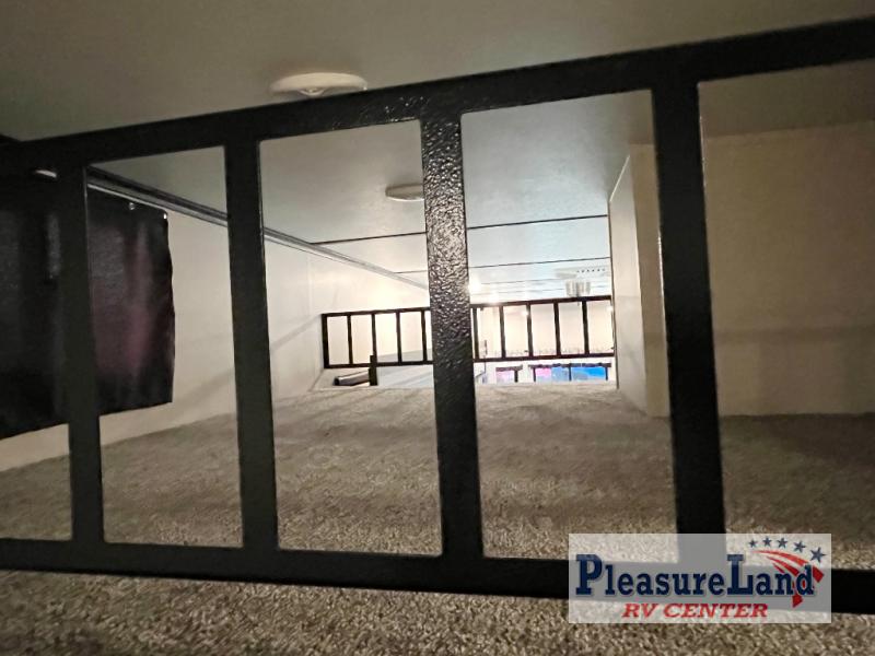 With a double loft area that has three 38" x 74" bunk mats, you can invite all of the grandkids to come on a summer vacation in this destination trailer! Enjoy your own privacy with the rear private bedroom which has a king bed slide, a wardrobe, a dresser, an entertainment center, a closet that is prepped to add an optional washer and dryer, and even one of the dual entry doors. Everyone can freshen up in the full bathroom with the 48" shower, and keep their bellies full with the front kitchen. Inside the kitchen is a three burner cooktop with a range hood above it, plenty of countertop space, a pantry cabinet with microwave, a residential refrigerator, and a bar top with two bar stools that overlooks the middle living area. You can eat your meals together at the free standing table with chairs and bench seating slide then relax on either the 72" sofa slide or theater seating across from the entertainment center with a fireplace and 50" LED HDTV to watch your favorite movies!