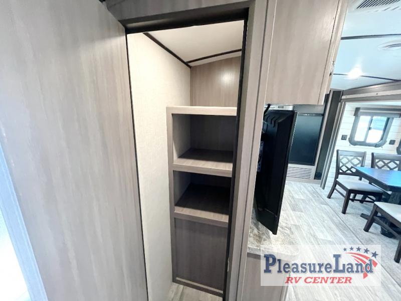 One step inside this travel trailer and you can be sure you've just found your new RV. The large slide out in the main living area will allow the dog to stretch out, and there is a second slide out in the front private bedroom for even more space. The walk-through bath is both spacious and convenient. Your crew can relax on the XL dinette and the standard tri-fold sofa can be replaced with an optional theater seating if you're not needing the additional sleeping space. This model also includes an exterior camp kitchen, plus a power awning with LED lights for the ultimate outdoor living space!