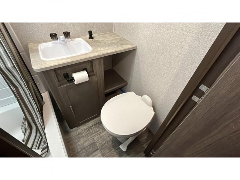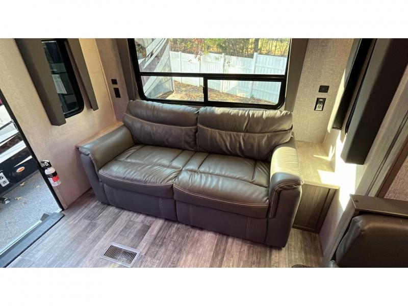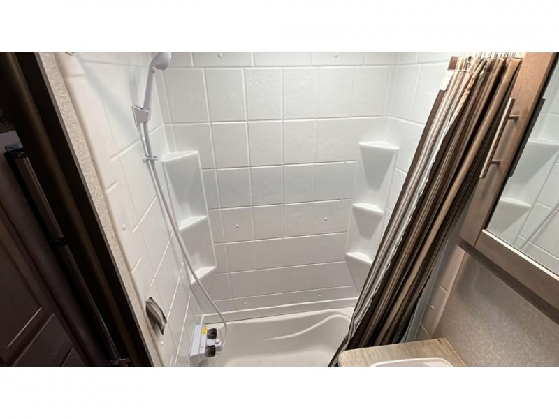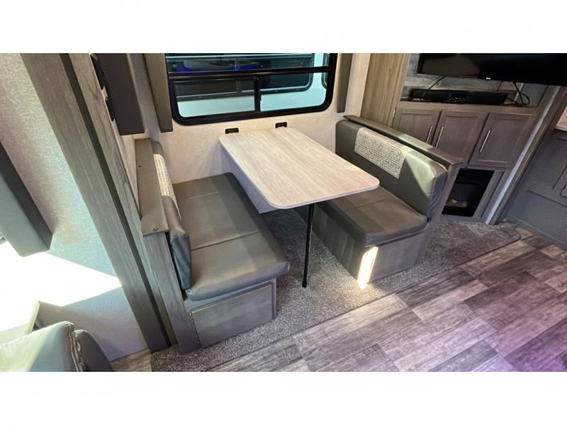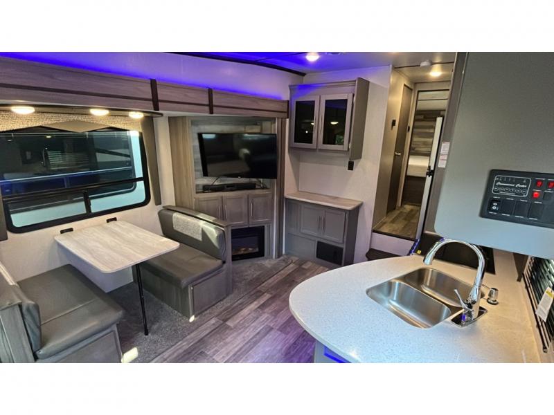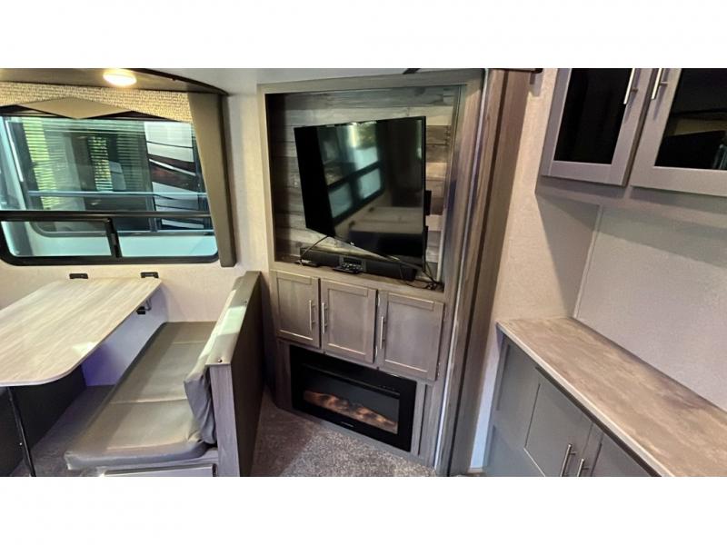 Step into this spacious fifth wheel for a camping trip you won't soon forget. The rear living area includes a tri-fold sofa for your guests to sleep on, plus there is a booth dinette for even more sleeping and seating space. The fireplace is sure to make it feel more like home, and you can bring along your nice dishes to set out on the hutch. This model features a large pantry and a large wardrobe right across the full bath so you can store necessitates and fresh towels. You and your spouse will enjoy the front private bedroom with its queen bed, dual wardrobes, plus overhead space for your special belongings.
