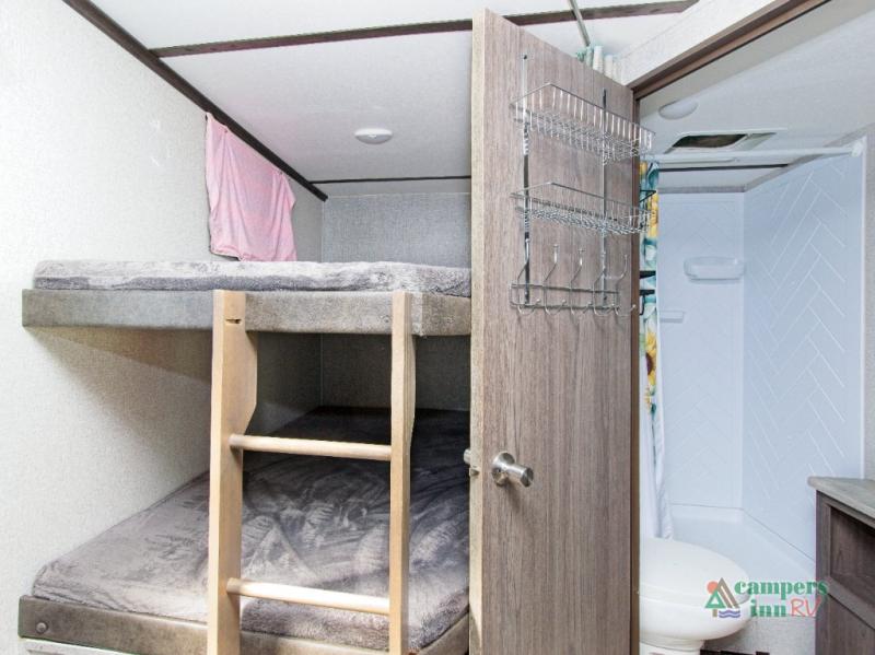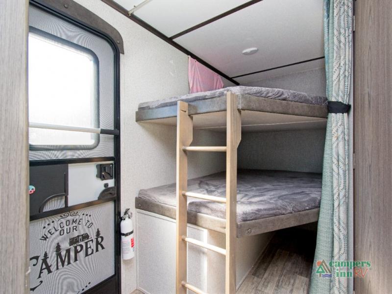 Whether you're planning a weekend getaway or a cross-country road trip, the Volante 28BH makes it easy to bring the whole crew. With sleeping space for up to 10 people, this travel trailer is ideal for families and groups. The private front bedroom offers a peaceful retreat for parents, while the double-size bunks are a hit with kids and guests. The tri-fold sofa and U-shaped dinette in the slide-out provide even more sleeping options.