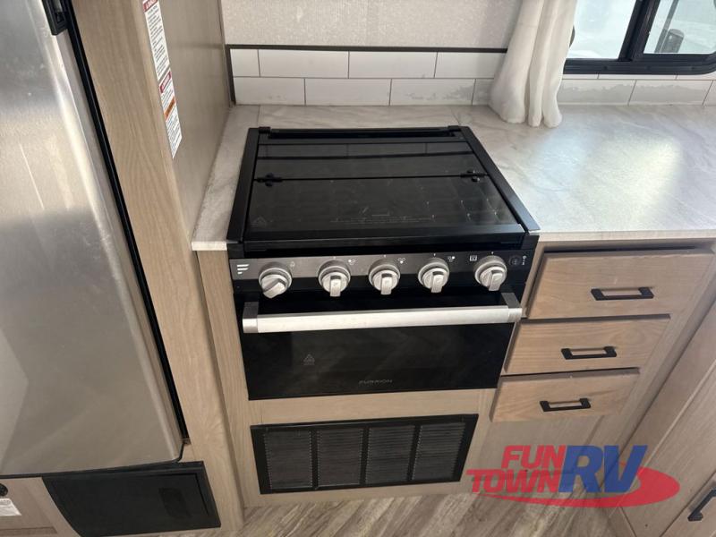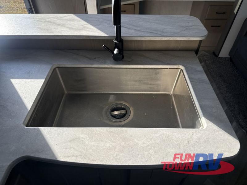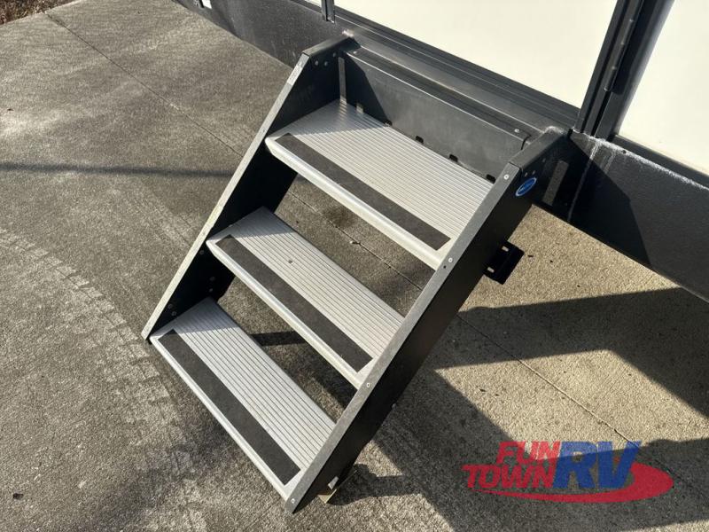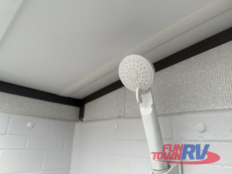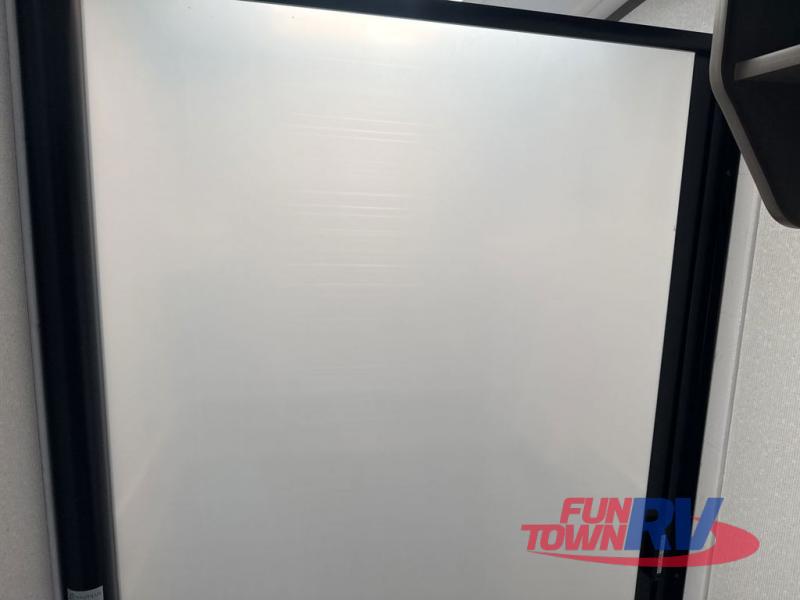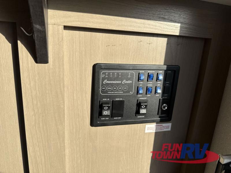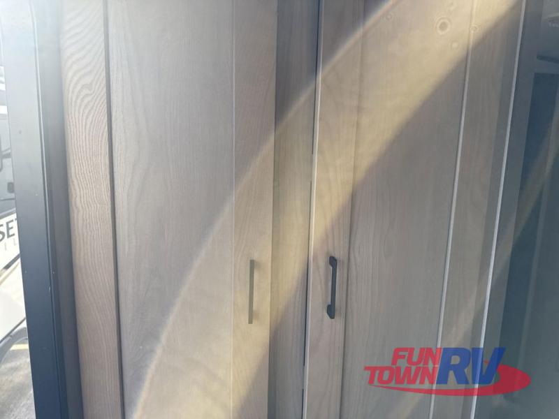 Convenience is found throughout this trailer for you and your spouse, plus your kids or overnight guests. The main entry gives you quick access to the walk-in pantry/wardrobe and living/kitchen area, and the second entry allows you to get into your bedroom and to the walk-through bathroom easily. Once inside you can relax on the sofa and booth dinette, make a meal in the middle kitchen with raised bar, work at the desk with a window for great views, and get clean up in the full bathroom. And you will have a king-size sliding bed at night, two wardrobes to store your clothing, and so much more in this trailer!