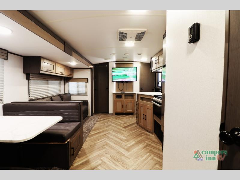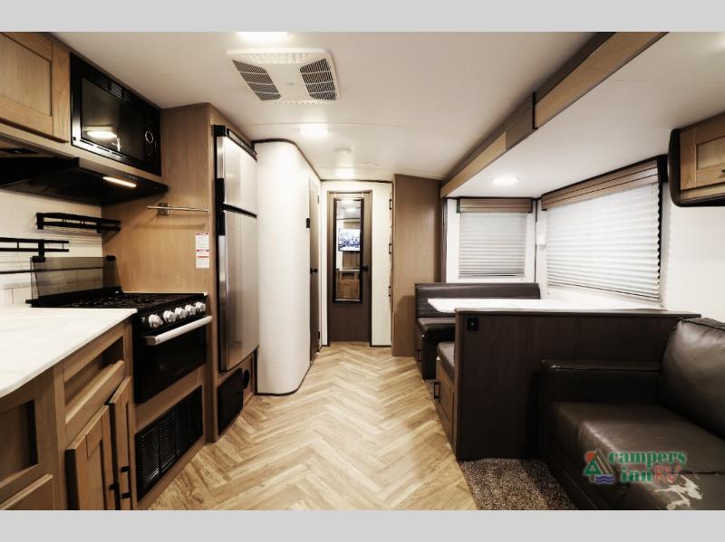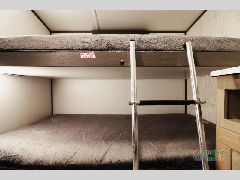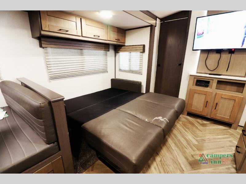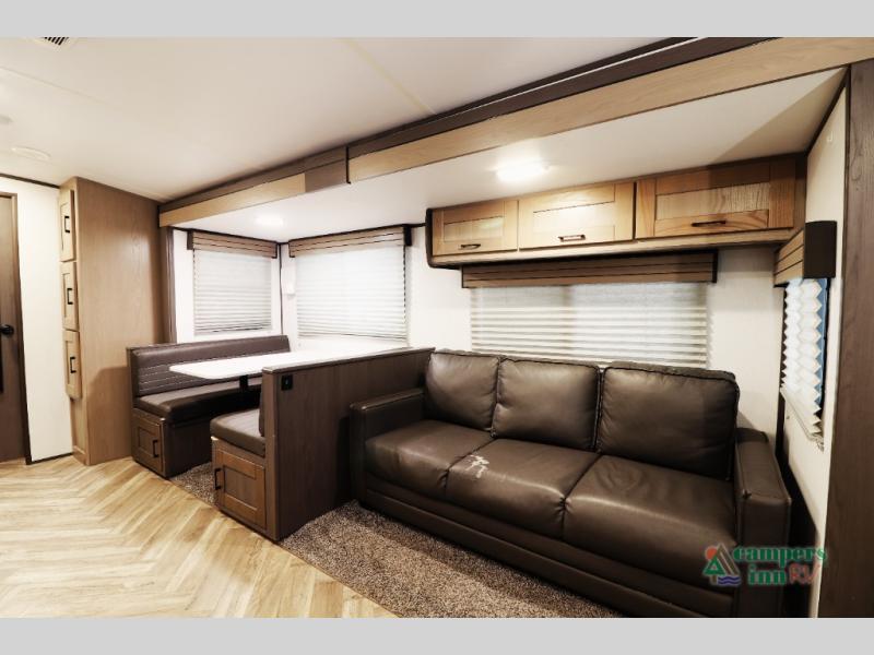 Large U-shaped dinette, tri-fold sofa, and private bunkhouse — ideal for families