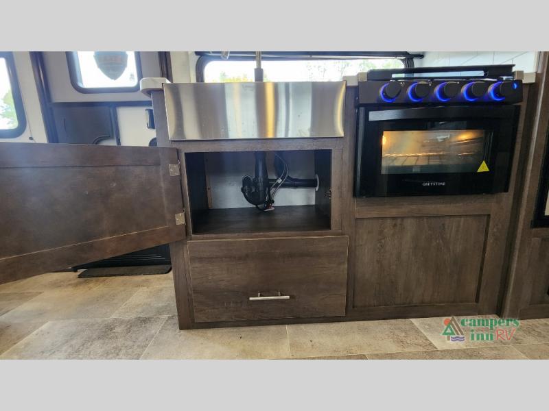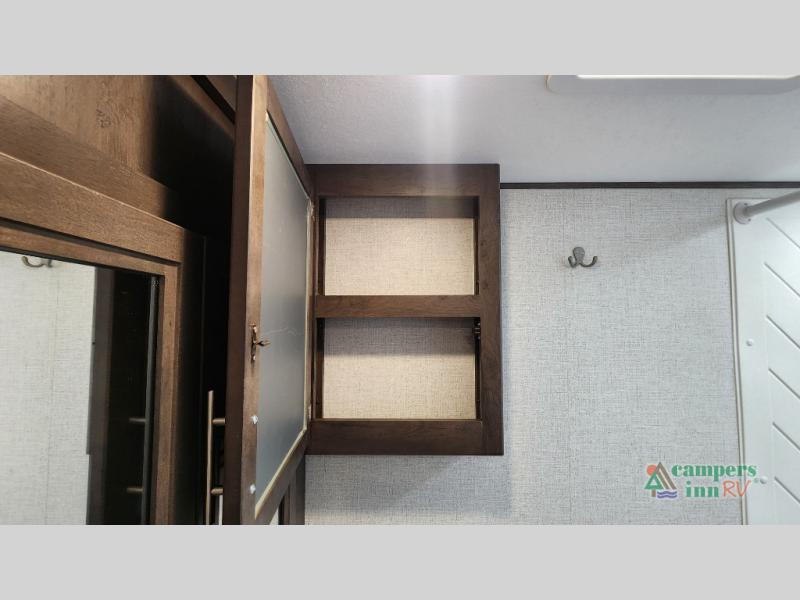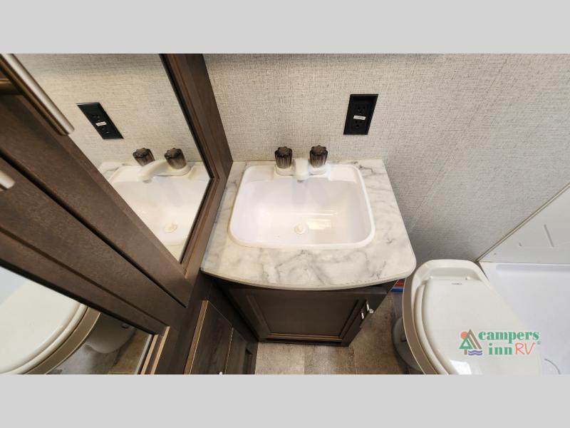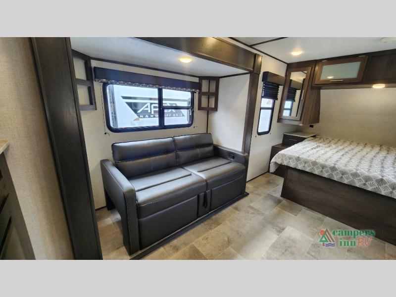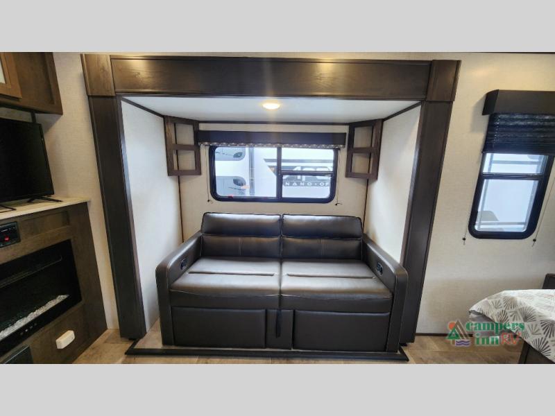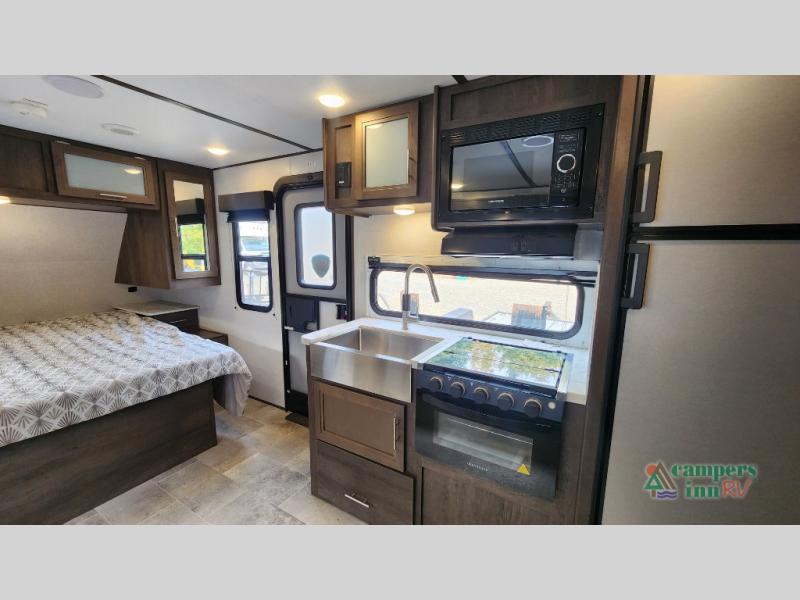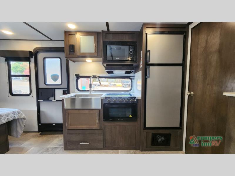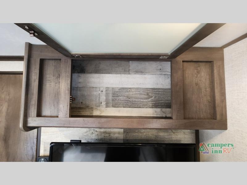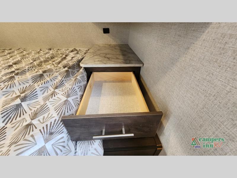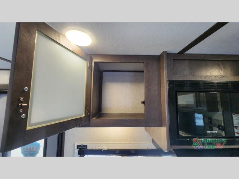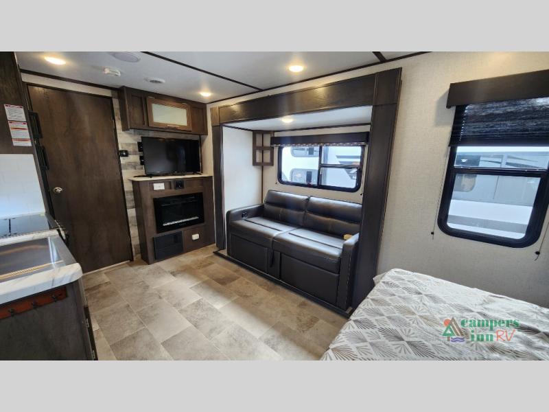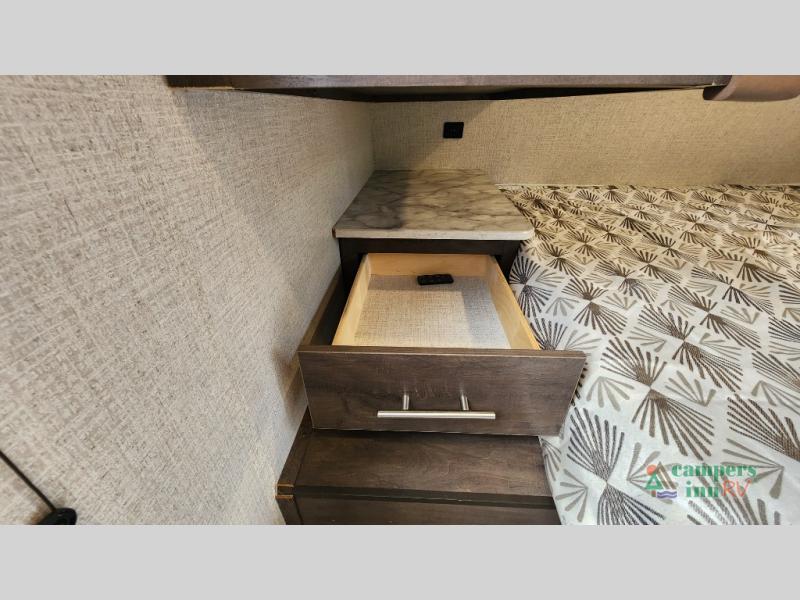 Take one look inside this Coleman Light travel trailer and you will throw away your tent! The handy indoor/outdoor table can be placed in several locations, including in front of the fold-down sofa on theĀ single slide out. The queen bed at the front of this trailer is perfect for a good night's rest, and with nightstands on both sides of the bed, you'll have a place for your things. The rear bathroom is conveniently out of the way, and the kitchen is a great place to spend time cooking dinner or heating up leftovers in the microwave.