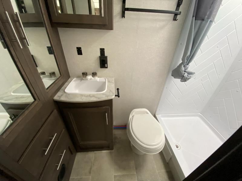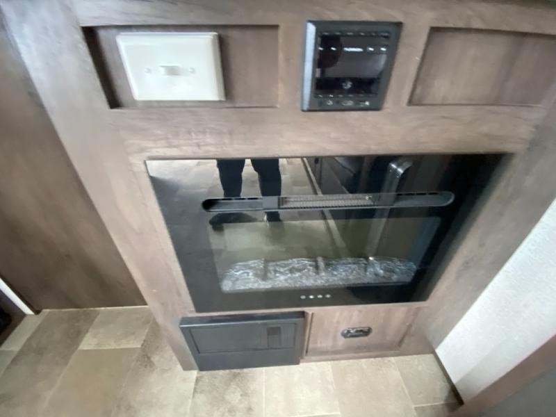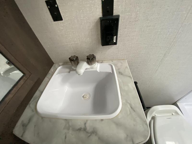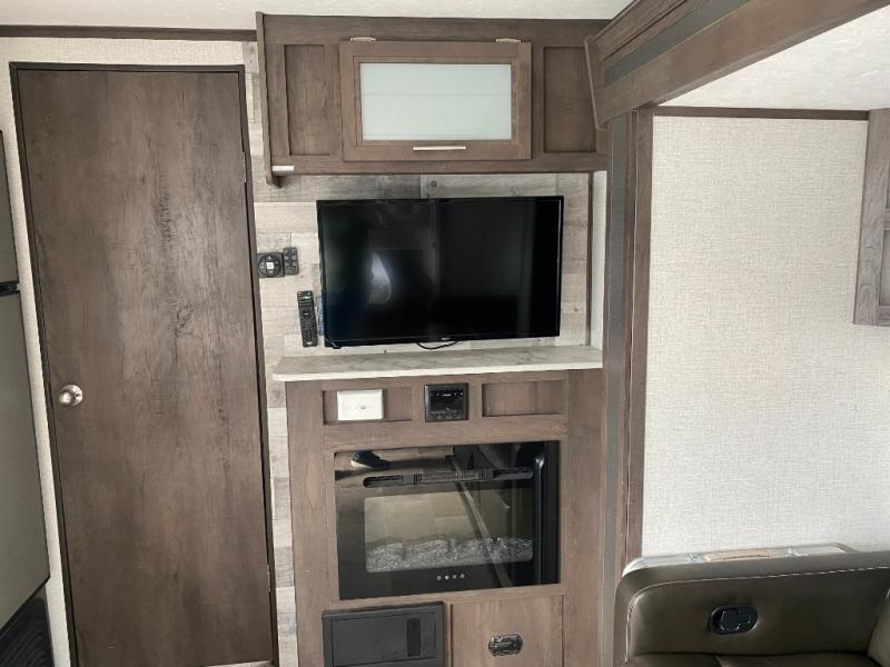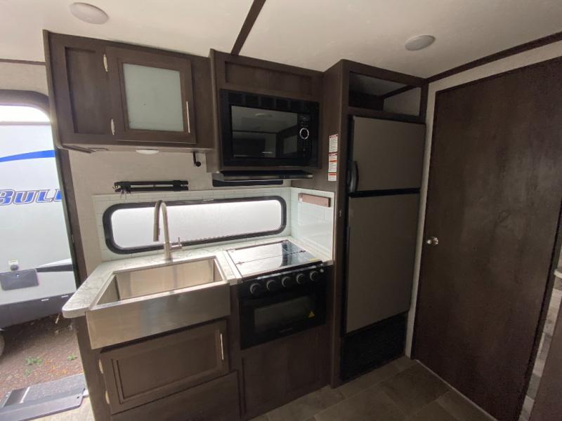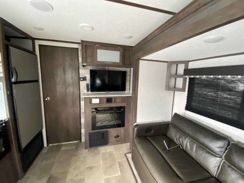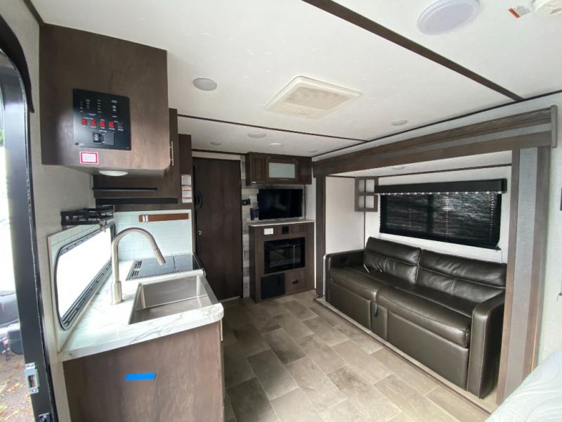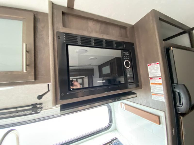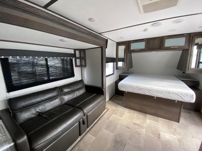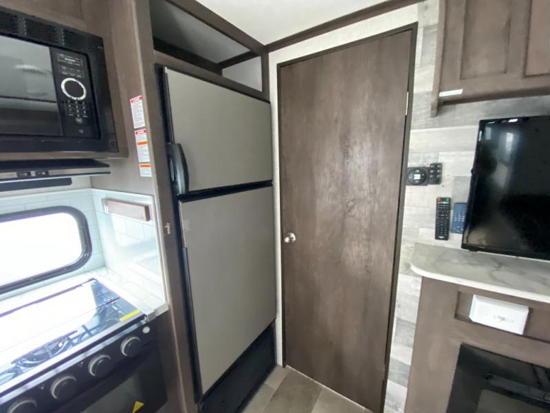 Take one look inside this Coleman Light travel trailer and you will throw away your tent! The handy indoor/outdoor table can be placed in several locations, including in front of the fold-down sofa on theĀ single slide out. The queen bed at the front of this trailer is perfect for a good night's rest, and with nightstands on both sides of the bed, you'll have a place for your things. The rear bathroom is conveniently out of the way, and the kitchen is a great place to spend time cooking dinner or heating up leftovers in the microwave.