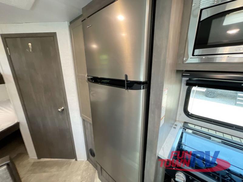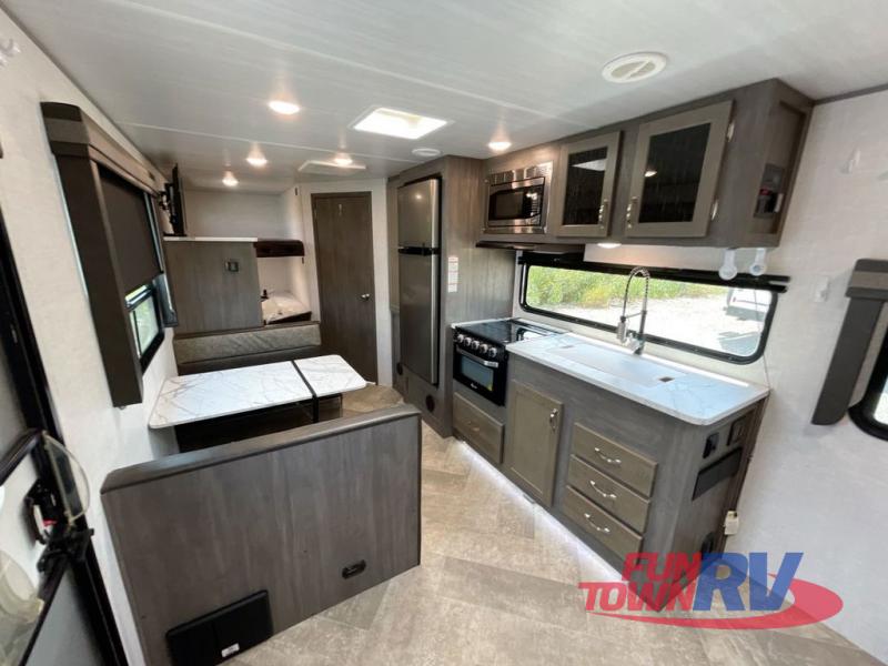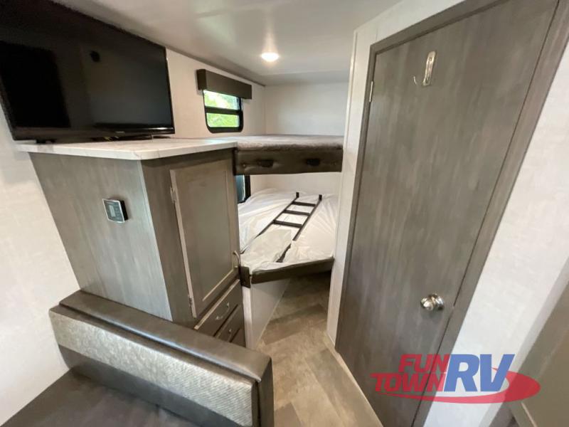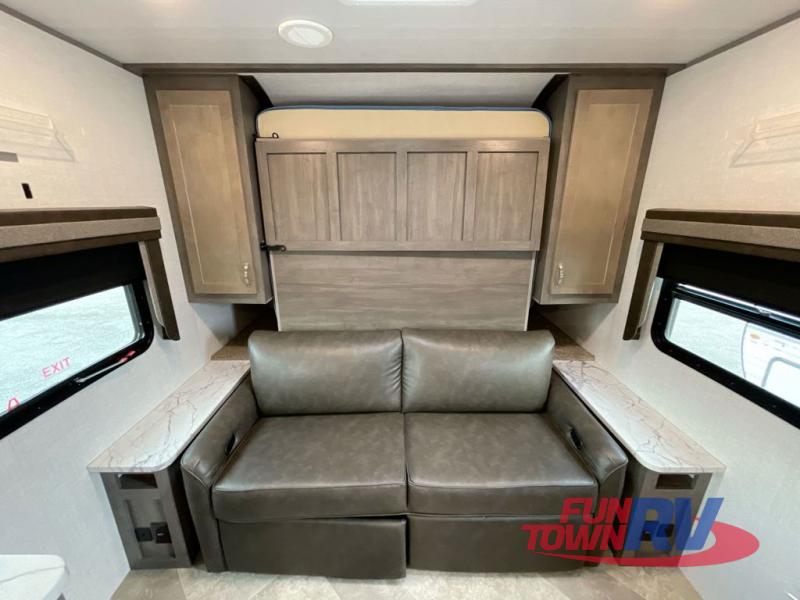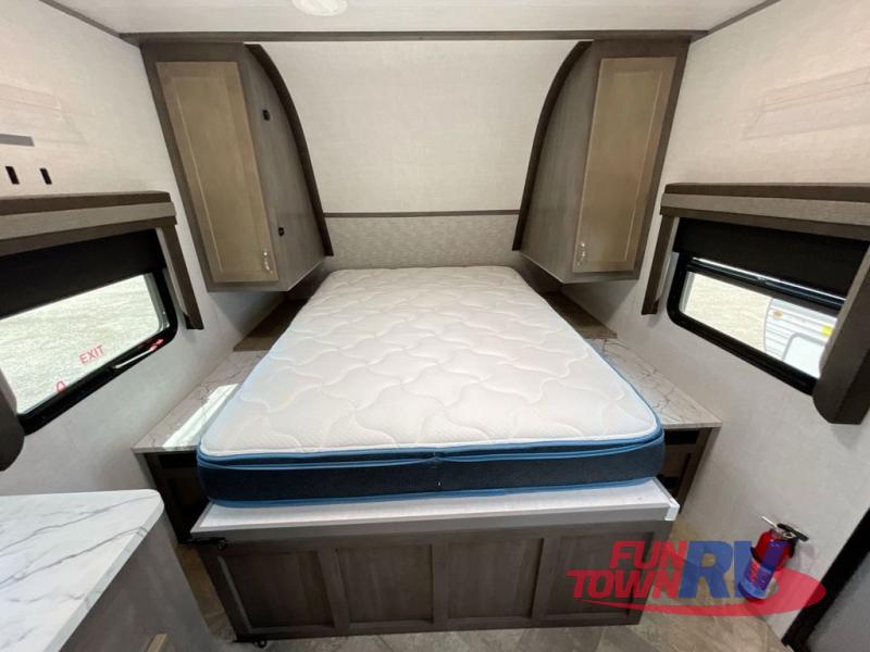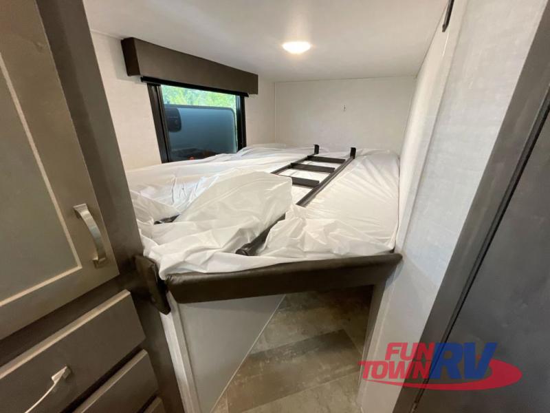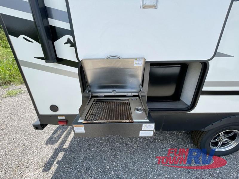 Make plans now for your next camping trip in this Alta travel trailer that can comfortably sleep seven people. The kids will love climbing into the double-sized bunks after a day of playing, and you will love the queen-sized Murphy bed up front. During the day, the sofa in front of the Murphy bed will provide more seating space, and the booth dinette will be great for all your meal times. The chef of the family will have the choice to prepare dinner inside on the cooktop, or use the pull-out grill for hamburgers and hot dogs and the outside refrigerator for more drinks! You will also find plenty of storage, including under the dinette and inside the exterior pass-through storage for items such as fishing poles and tackle boxes.