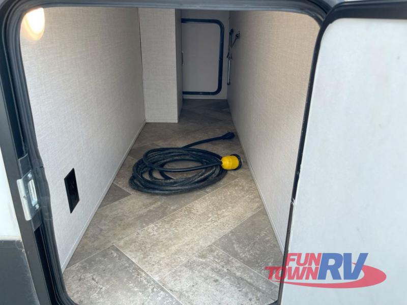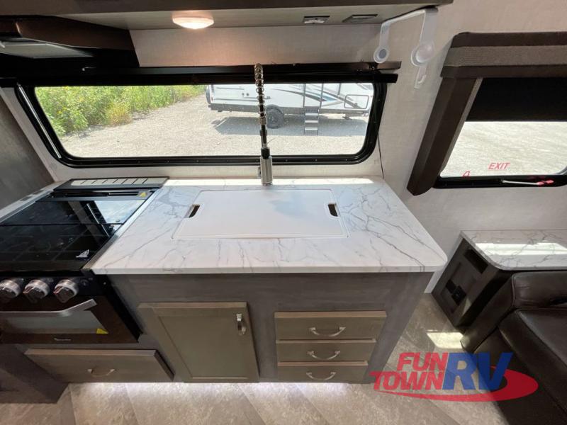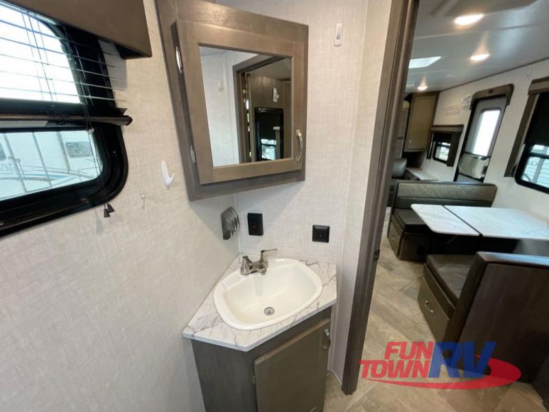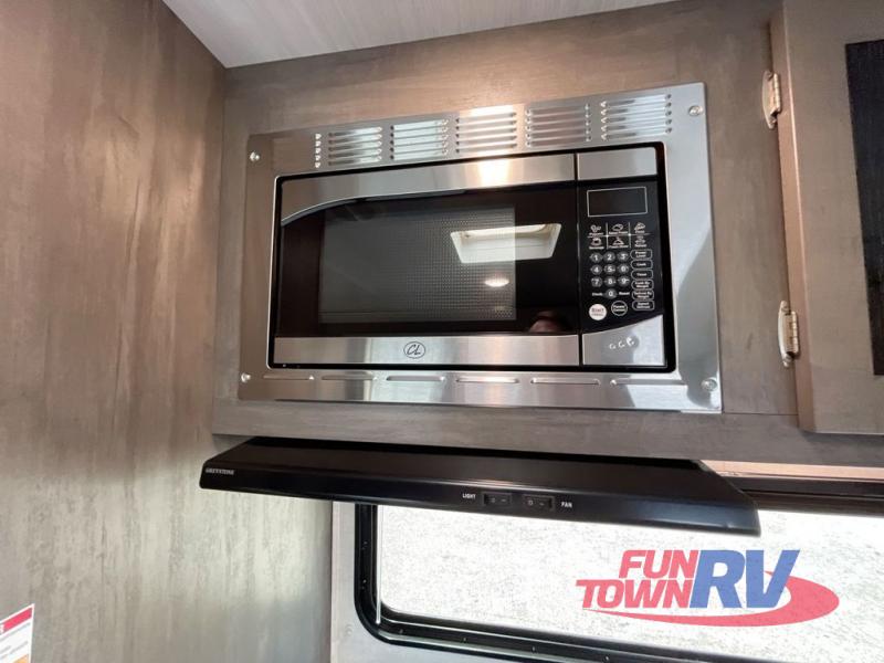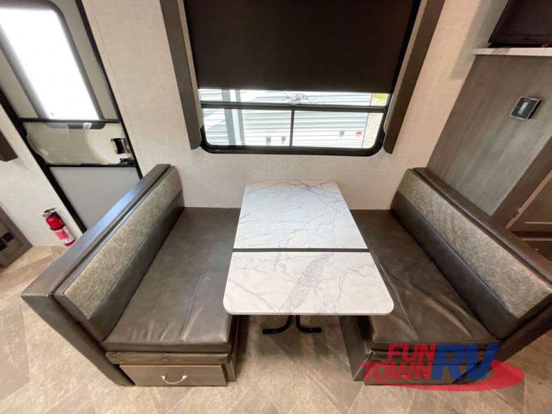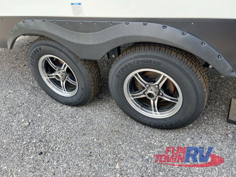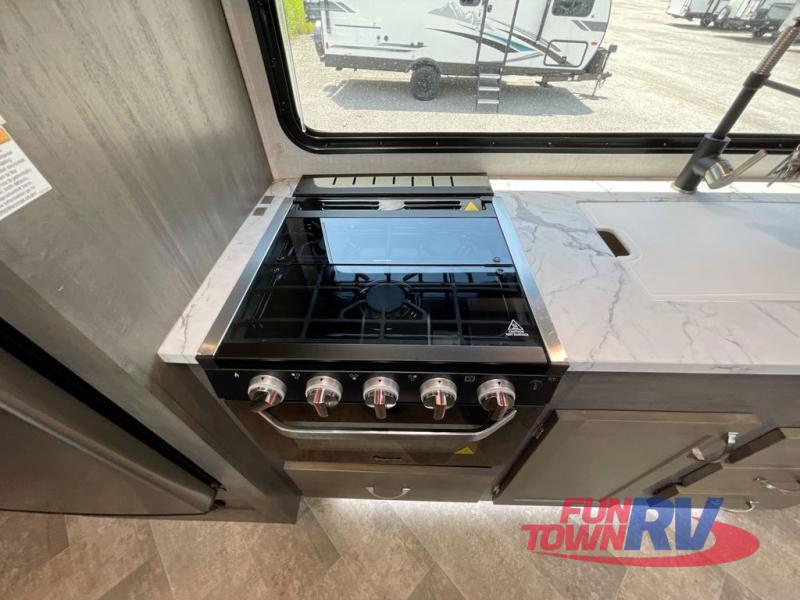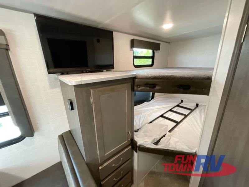 Make plans now for your next camping trip in this Alta travel trailer that can comfortably sleep seven people. The kids will love climbing into the double-sized bunks after a day of playing, and you will love the queen-sized Murphy bed up front. During the day, the sofa in front of the Murphy bed will provide more seating space, and the booth dinette will be great for all your meal times. The chef of the family will have the choice to prepare dinner inside on the cooktop, or use the pull-out grill for hamburgers and hot dogs and the outside refrigerator for more drinks! You will also find plenty of storage, including under the dinette and inside the exterior pass-through storage for items such as fishing poles and tackle boxes.