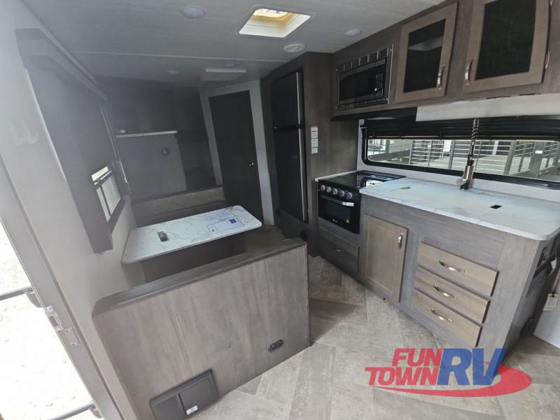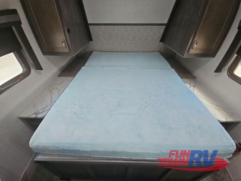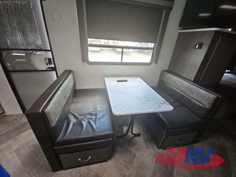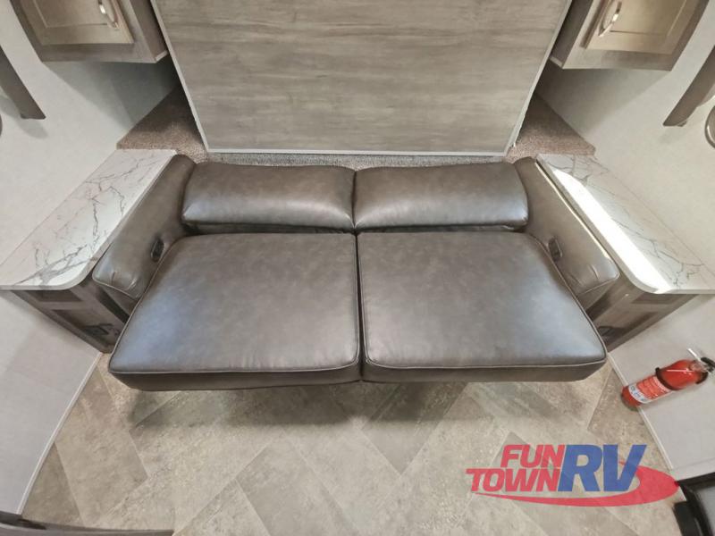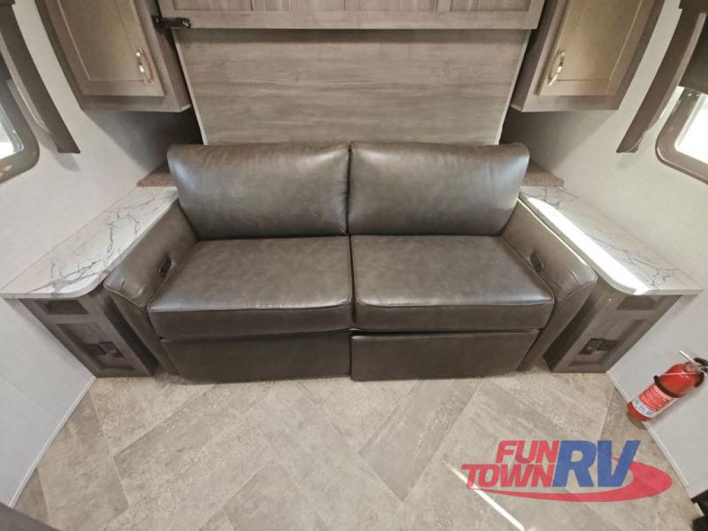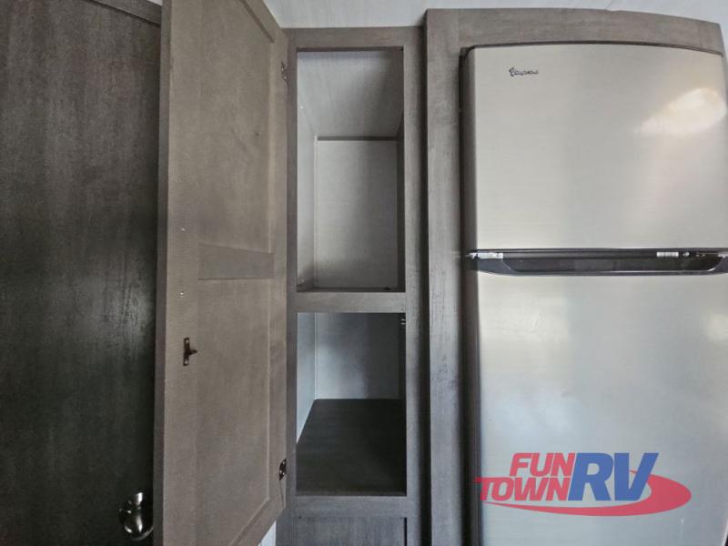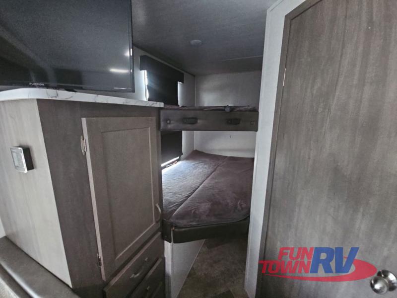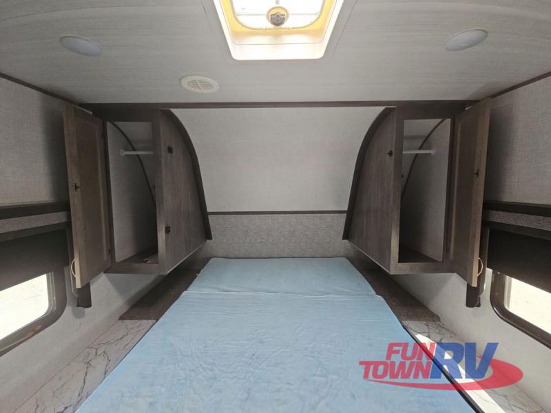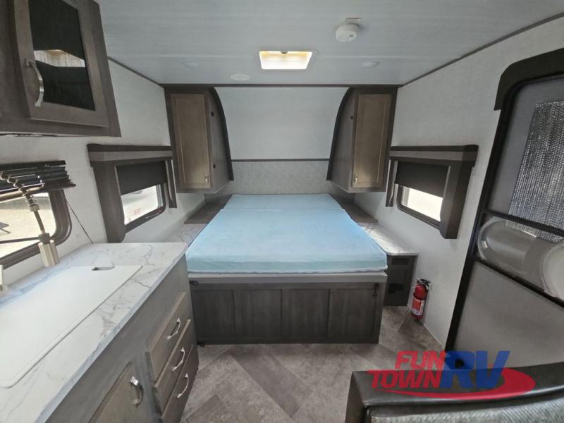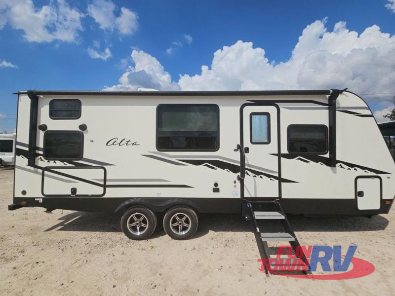 Make plans now for your next camping trip in this Alta travel trailer that can comfortably sleep seven people. The kids will love climbing into the double-sized bunks after a day of playing, and you will love the queen-sized Murphy bed up front. During the day, the sofa in front of the Murphy bed will provide more seating space, and the booth dinette will be great for all your meal times. The chef of the family will have the choice to prepare dinner inside on the cooktop, or use the pull-out grill for hamburgers and hot dogs and the outside refrigerator for more drinks! You will also find plenty of storage, including under the dinette and inside the exterior pass-through storage for items such as fishing poles and tackle boxes.