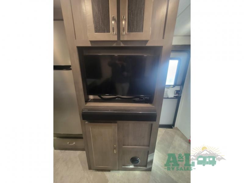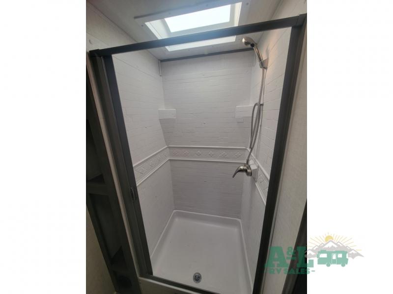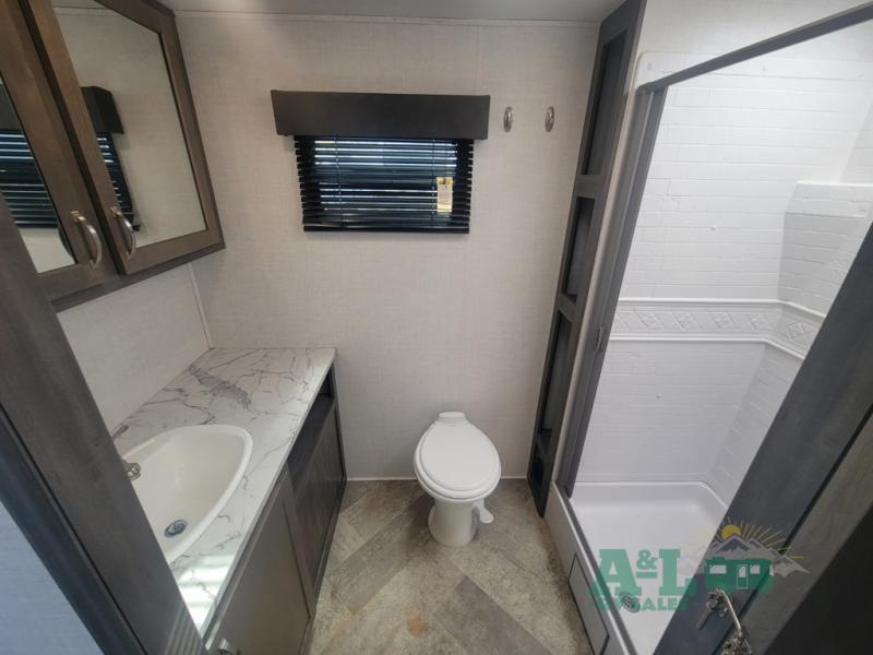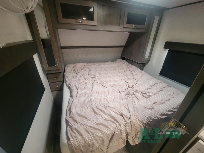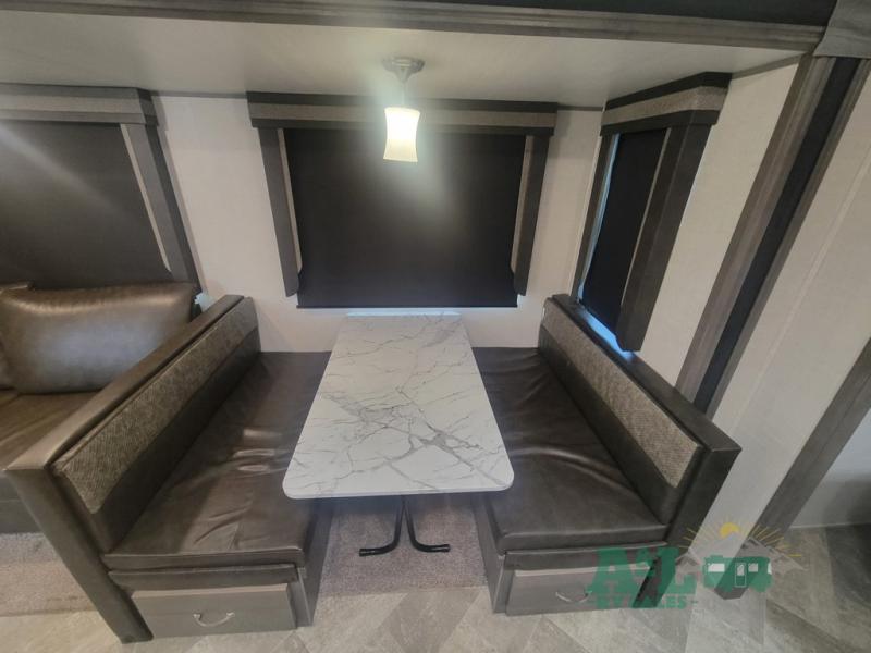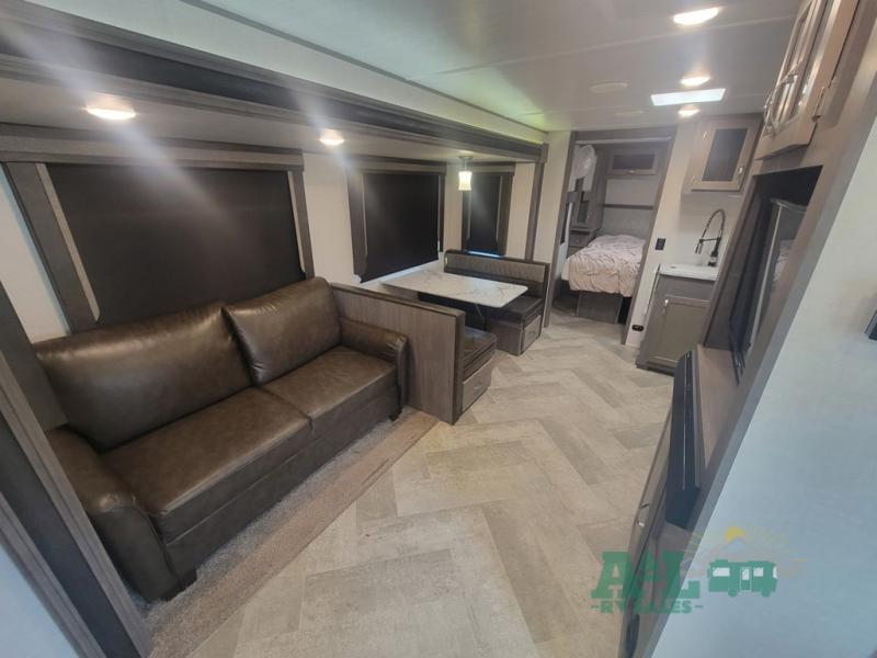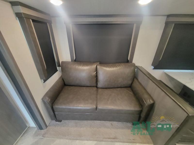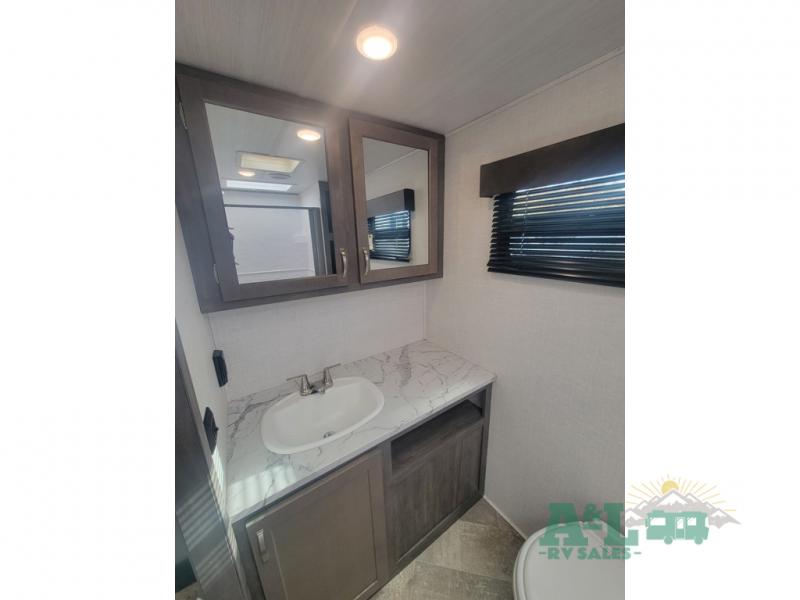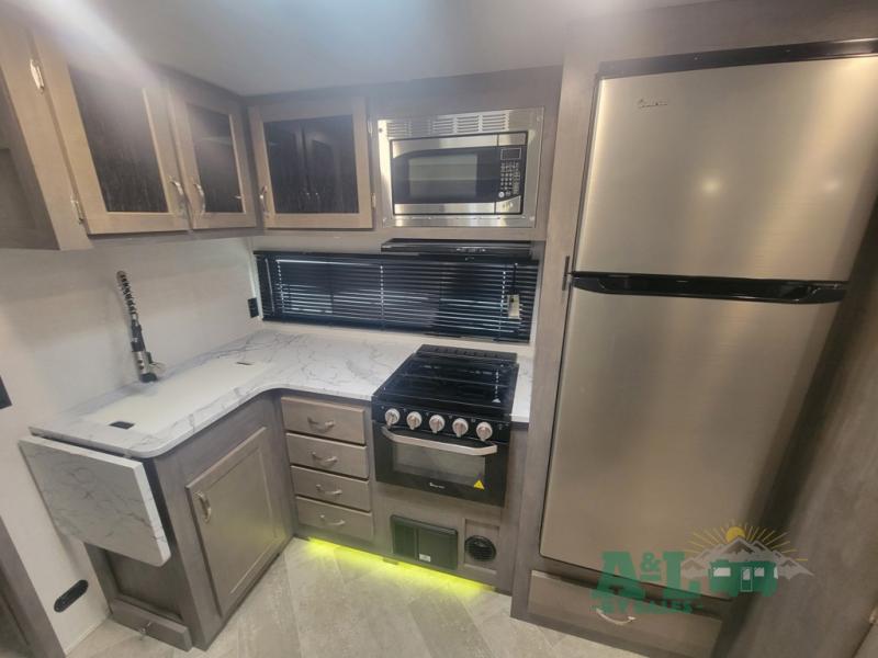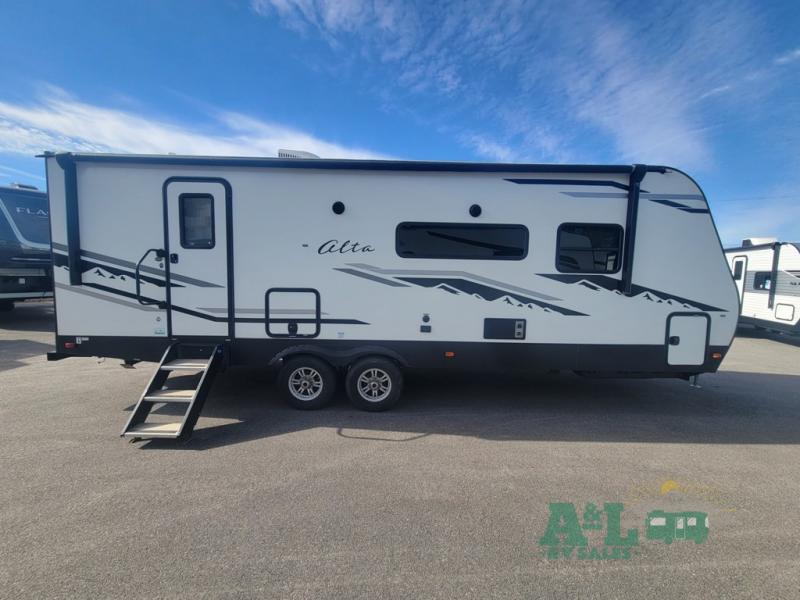 If you're looking for a travel trailer with a little more space, take a look at this Alta that features a large slide out in the living/kitchen area. The tri-fold sofa and booth dinette within the slide provide plenty of seating and can be converted into sleeping space for the kids or your guests. You can also choose the theater seat option in place of the tri-fold sofa. This unit has everything you need to prepare meals each day: a three-burner cooktop, a microwave oven, and a countertop extension for more prep space. Spend your days hiking, biking, or swimming and then clean up in the large rear bath just like you do at home. And, you will love the front bedroom for extra privacy, and the king bed will provide a great night's rest!
