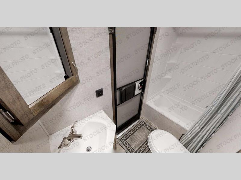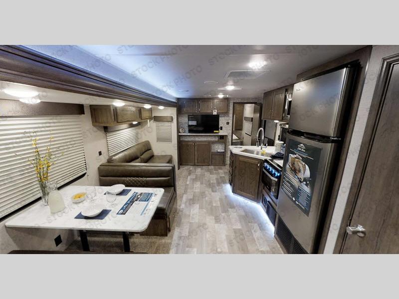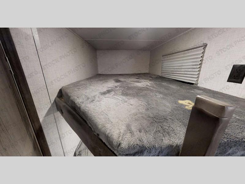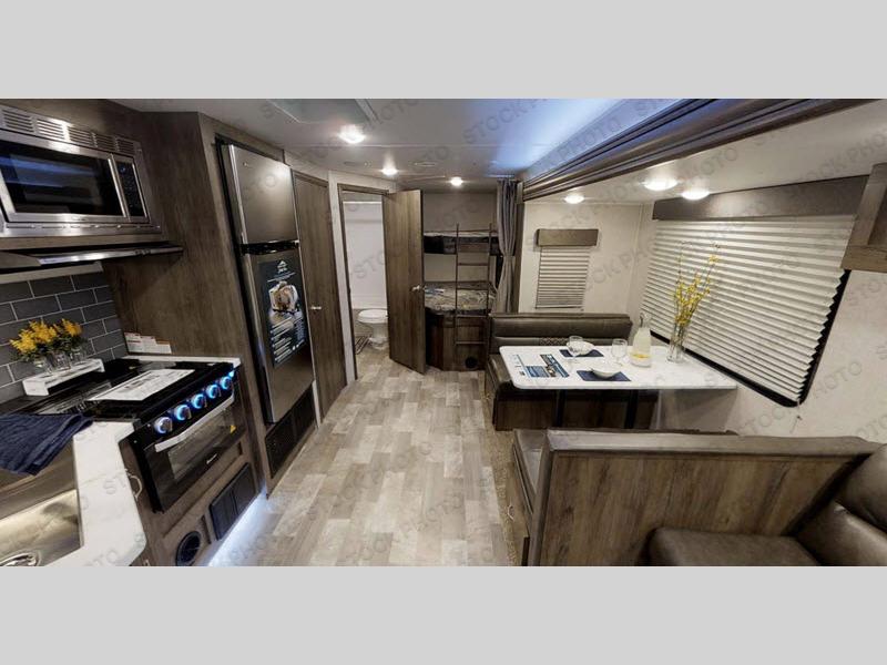 Whether you're entering from the front entry door in this Della Terra travel trailer, or you're using the second entry door that leads directly into the full bathroom, you will be so happy to have the choice! Once you have gotten to the inside, you will notice that there is extra floor space once the large slide has been pushed out into place, plus it allows the cook more space to make warm meals in the kitchen. Each night when you know it is time for bed, you can head to the front private bedroom to sleep on the king-size bed while the kids head to the bunks. If you find yourself to be a night owl, you can stay outside underneath the 15' electric awning and grab some extra lawn chairs from the pass-through storage compartment for anyone else that joins you.