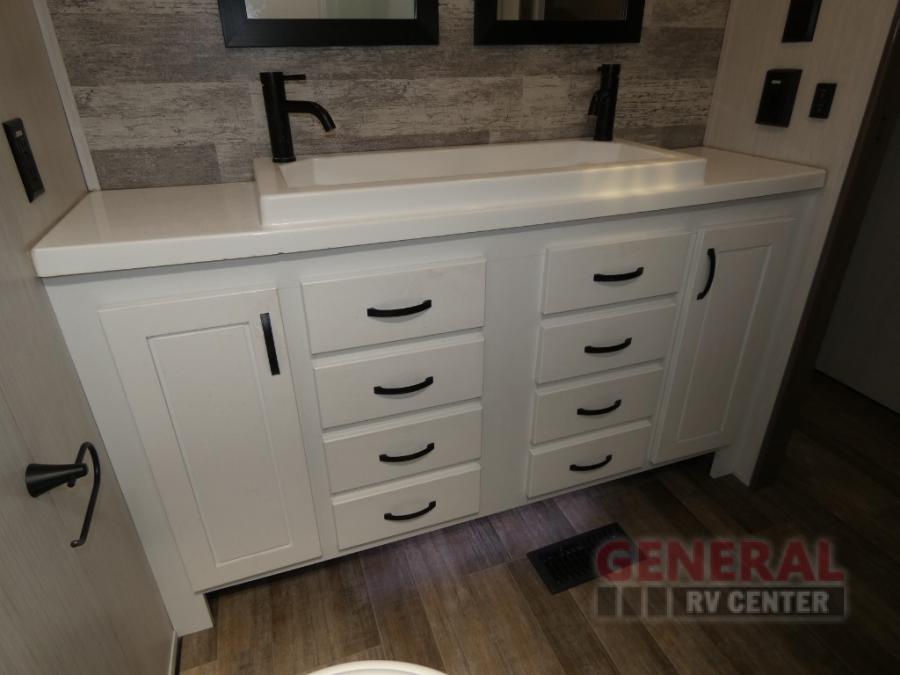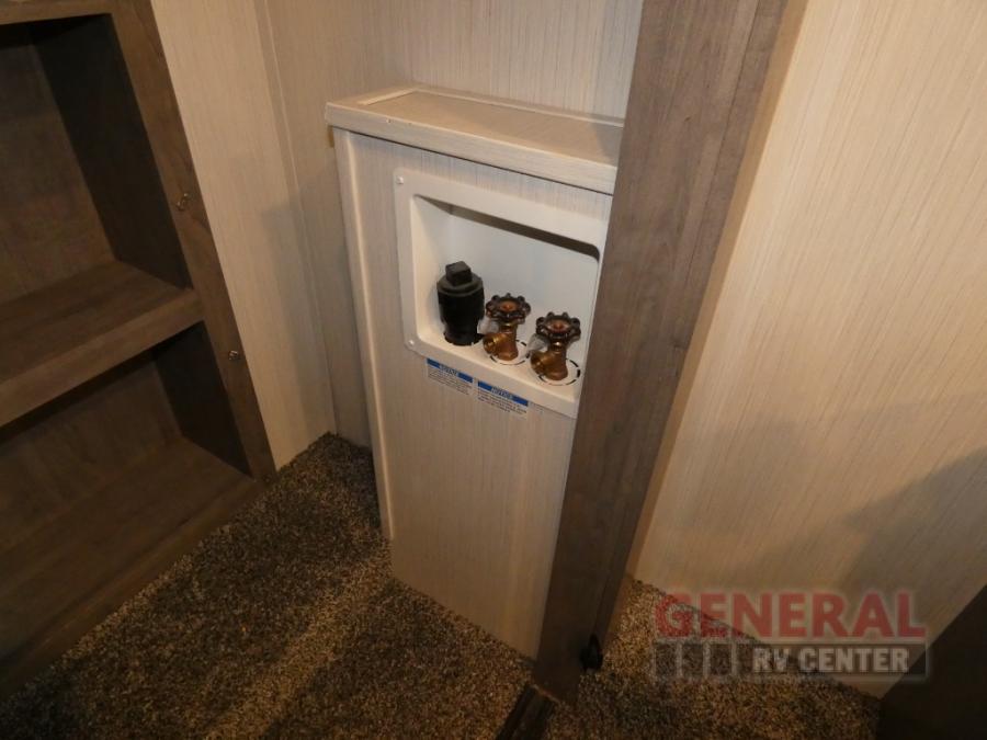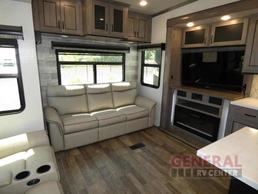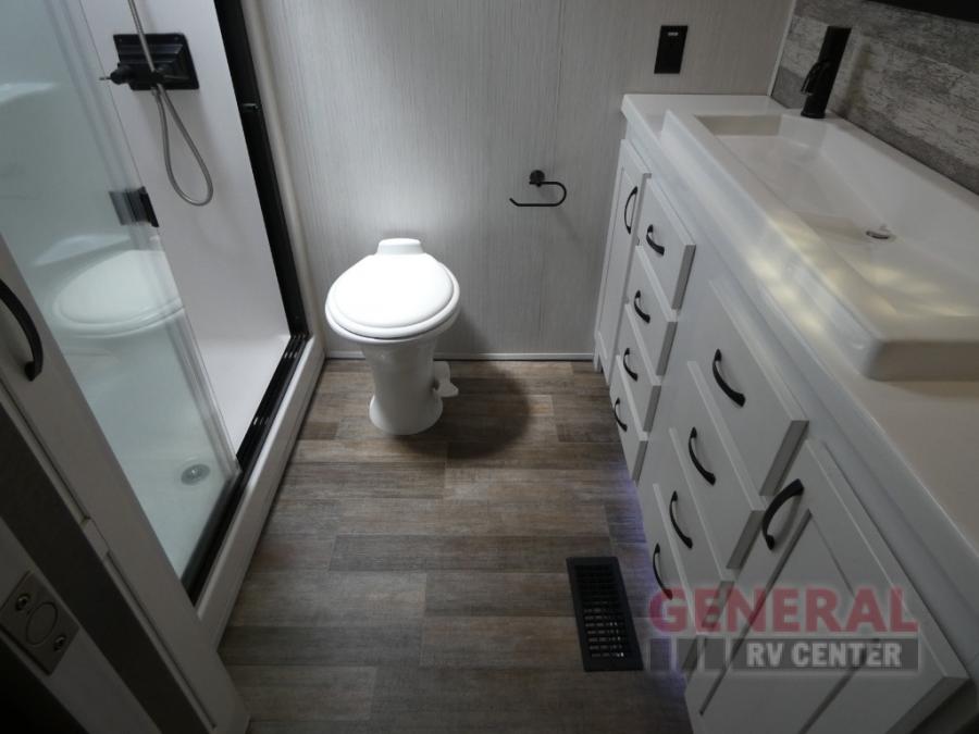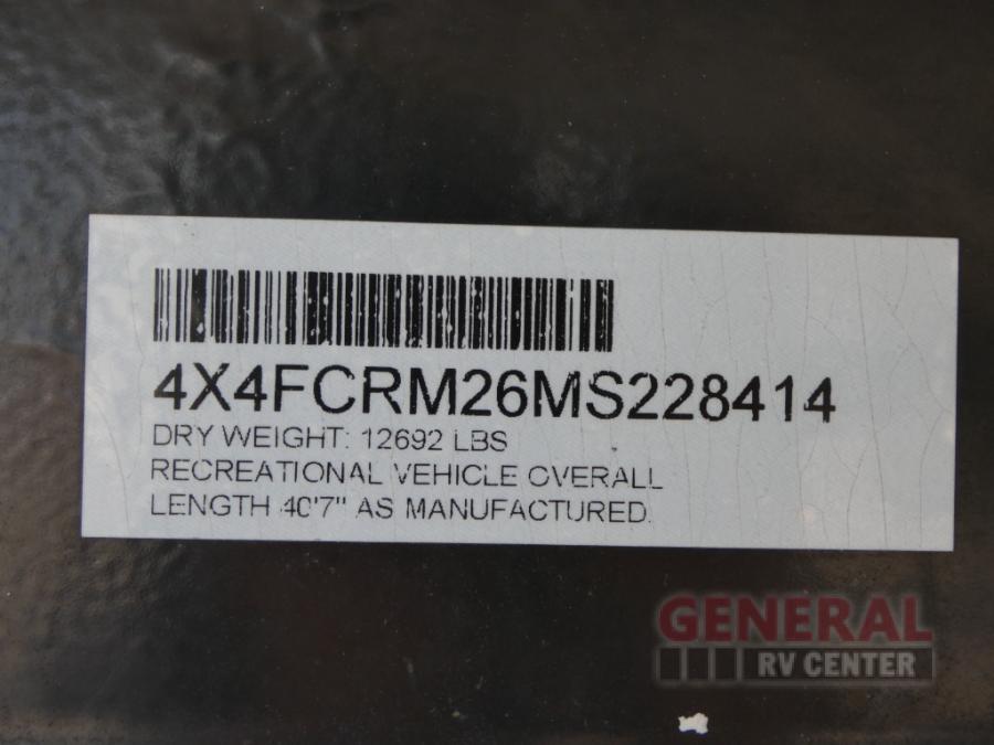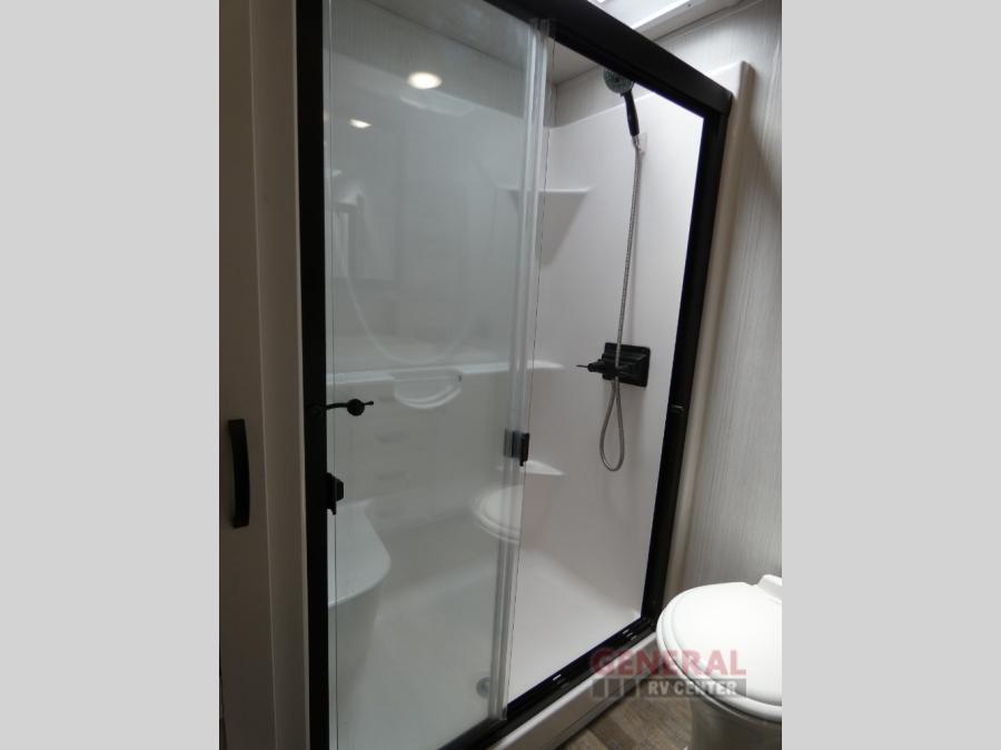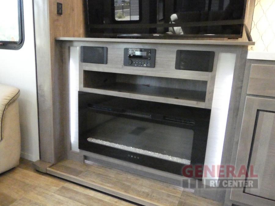 Do you wish to escape the mundane lifestyle? Well then, pick your favorite campsite and hitch up this Cedar Creek fifth wheel! The rear living area has a hide-a-bed sofa for you to bring an extra guest or two and power theater seating across from the entertainment center with a fireplace. The kitchen island will make your meal prep easy. The large kitchen pantry is big enough to store your favorite snacks, and the free-standing table is a great place to enjoy your meals. Just outside the full bathroom is a closet to use as you wish, and inside is a shower with a seat, a linen closet, and a large sink with two faucets.