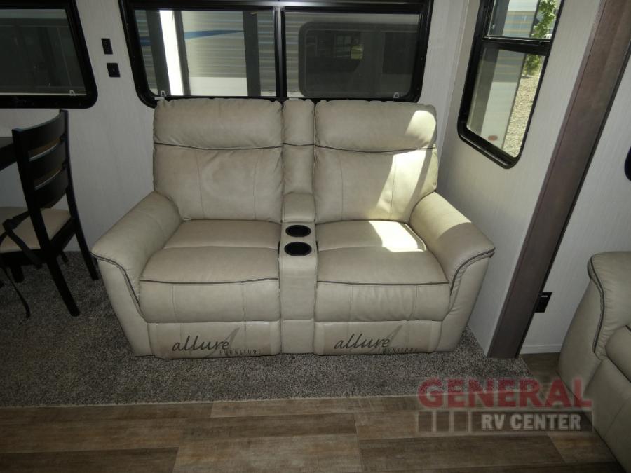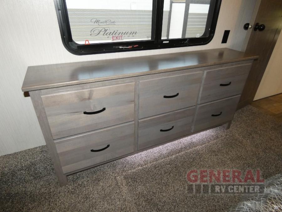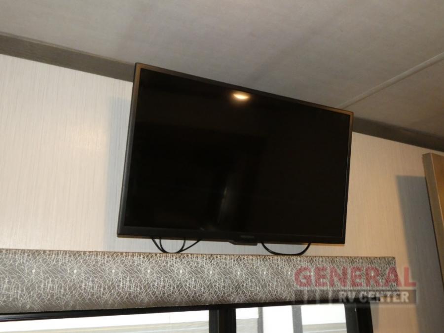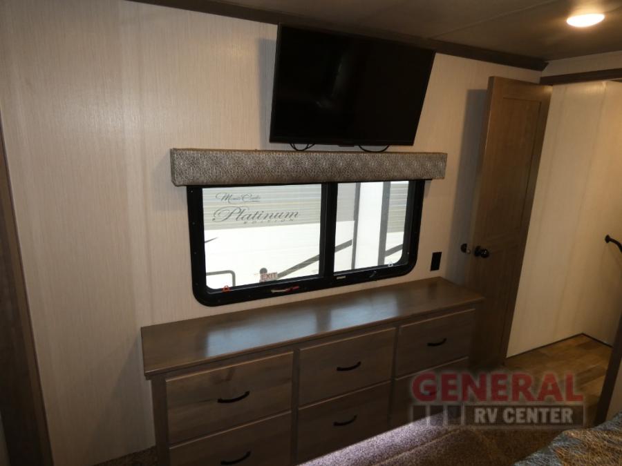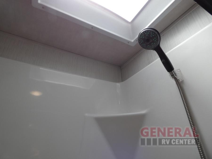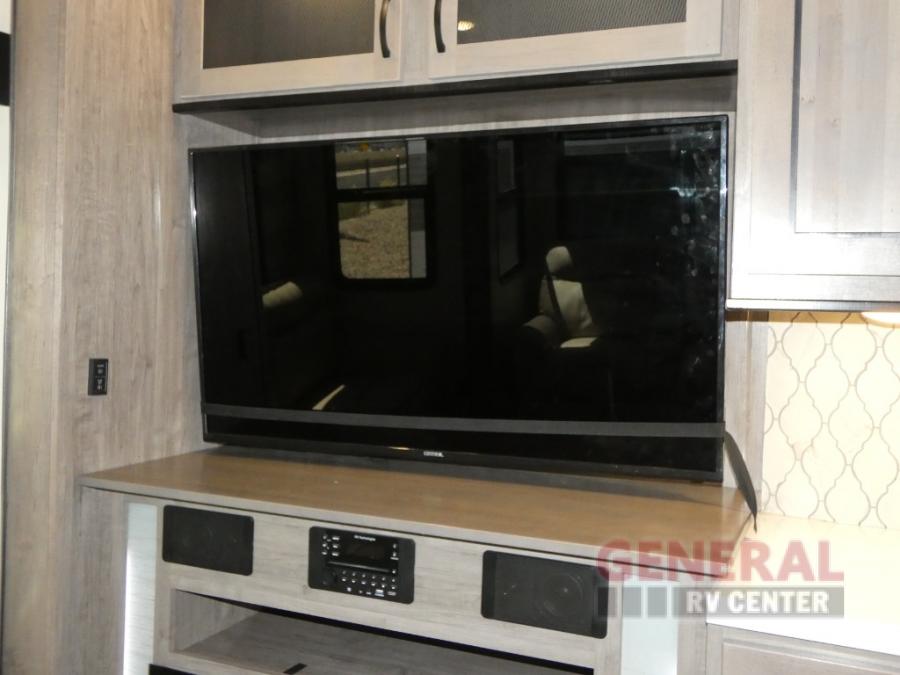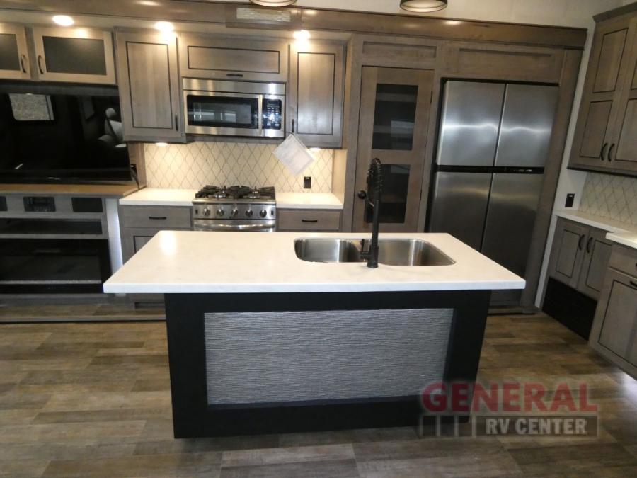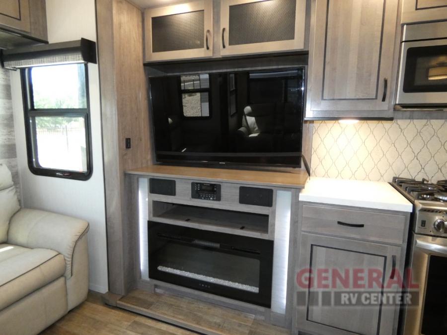 Do you wish to escape the mundane lifestyle? Well then, pick your favorite campsite and hitch up this Cedar Creek fifth wheel! The rear living area has a hide-a-bed sofa for you to bring an extra guest or two and power theater seating across from the entertainment center with a fireplace. The kitchen island will make your meal prep easy. The large kitchen pantry is big enough to store your favorite snacks, and the free-standing table is a great place to enjoy your meals. Just outside the full bathroom is a closet to use as you wish, and inside is a shower with a seat, a linen closet, and a large sink with two faucets.