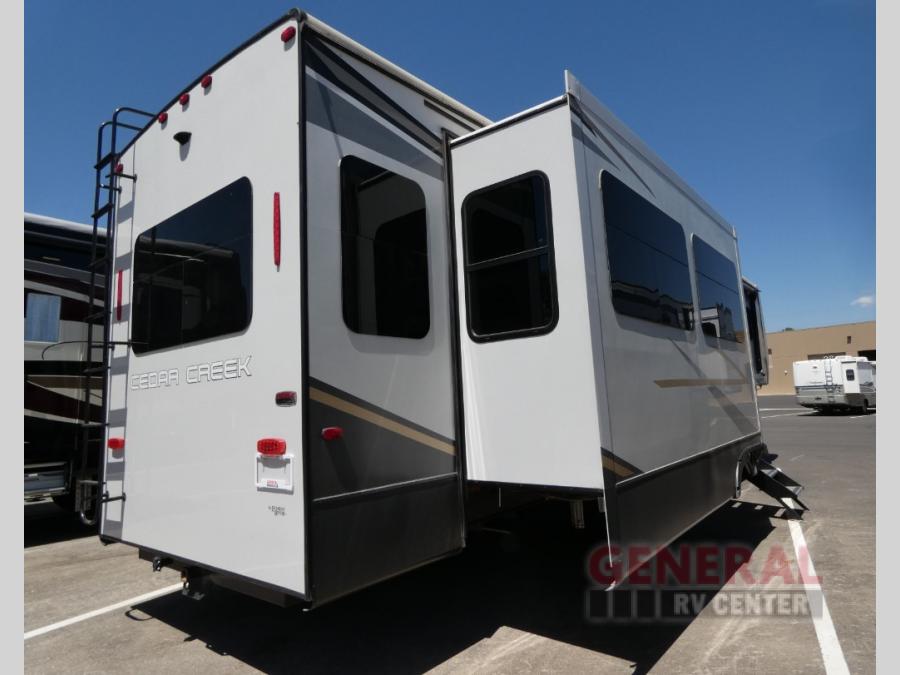 See where the road leads with any one of these Forest River Cedar Creek fifth wheels! They are constructed with the famous Cedar Creek all-aluminum superstructure on 16" centers, a "True" gelcoat exterior, and Silaprene® bonded sidewalls that are resilient, grow stronger with age, and also have an outstanding resistance to UV, heat, cold, moisture, oil/gas, and highway chemicals. The Dexter Performance and Safety Package will give you a peace of mind while driving down the road. You can also bring your furry friend with the animal leash latch, and enjoy your privacy with the Hehr frameless, tinted automotive-style windows. A few other convenient features you are sure to love are the Intervac central vacuum system with a front storage compartment port and interior automatic dustpan, the Congoleum® flooring (carpet mandatory in dining slide), and the USB plug-ins on each side of the king bed. Come choose the model that best suits you today!