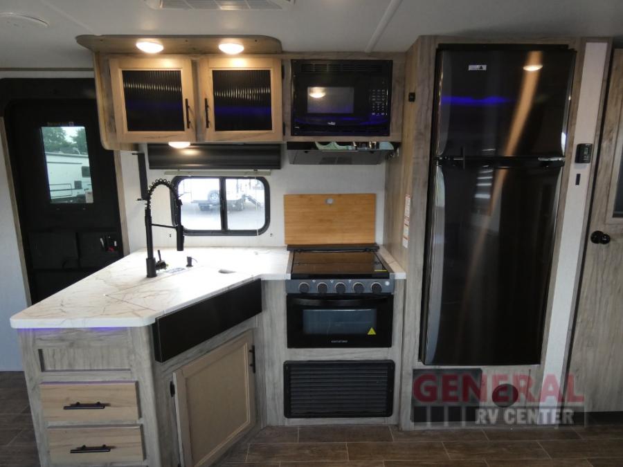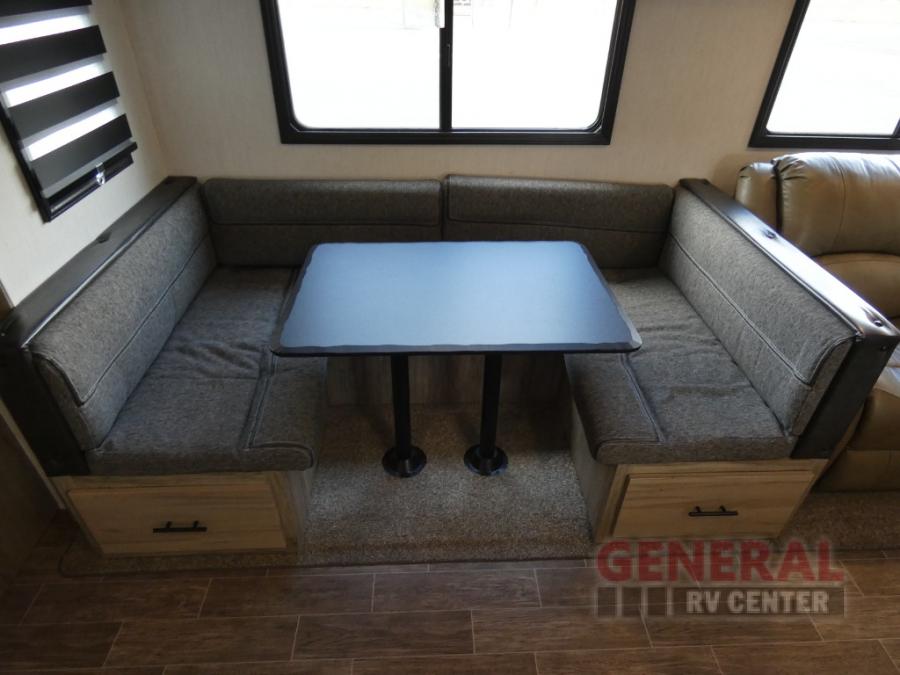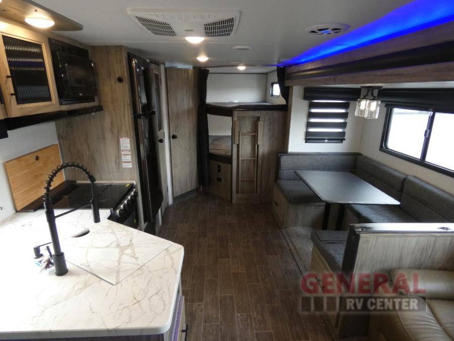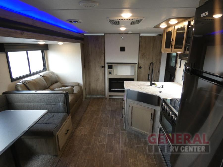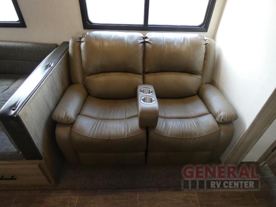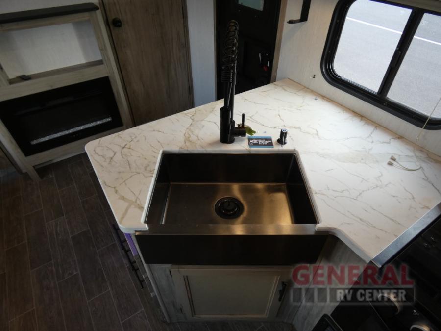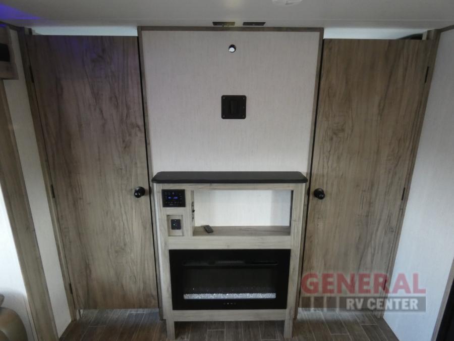 Spend your weekends with the whole family in the most popular multi-sleeper with this travel trailer! The dual entry doors make for a smooth flow of traffic in and out of the unit, plus one of the doors leads directly into the rear corner bathroom so you can get back to playing outdoors fast. The oversized U-shaped dinette is big enough for everyone to gather around at meal times and to play games. If mother nature is raining on your parade then you can relax on the theater seats and enjoy the electric fireplace, just grab a snack from the large pantry and a drink from the 12V residential refrigerator.. If you're feeling brave then you can head outdoors and watch the rain poor down as you stay protected underneath the oversized 20' awning, plus there is a deluxe outside kitchen for you to cook while you watch the kids play when the sun is shining!