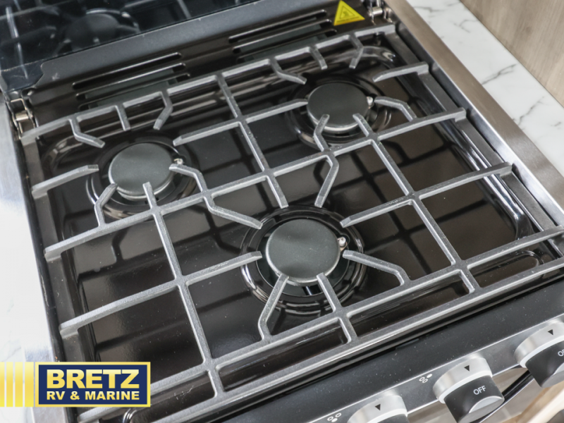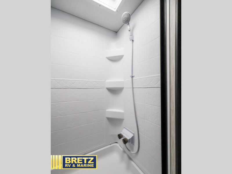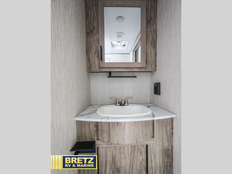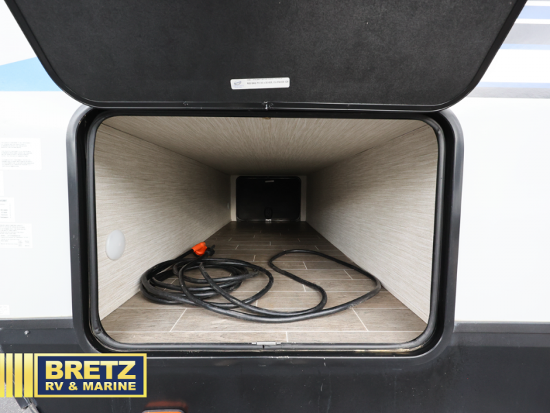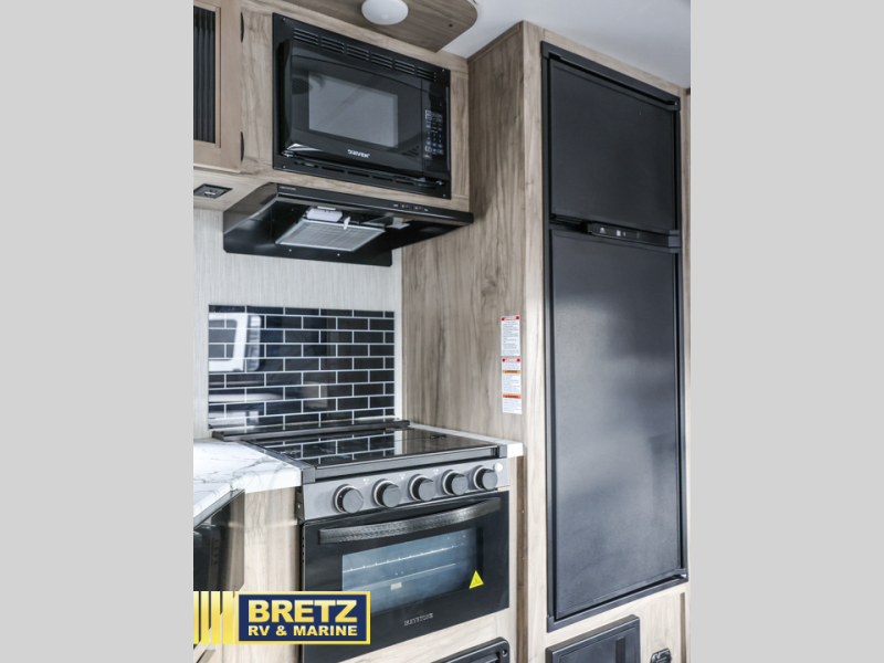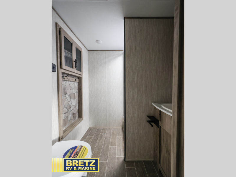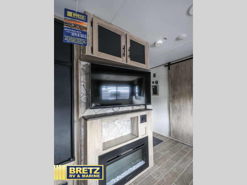 Spend the summer at your favorite campsite in this travel trailer! You will find an abundance of storage throughout between the walk-in pantry, the overhead cabinets, the shirt closets on either side of the queen bed, and the linen closet in the bathroom, plus the exterior full pass-through storage area is big enough to store all of your camping gear. The full rear bathroom has a robe/towel drop zone for your convenience and a stylish barn-style door to close it off for privacy. The jackknife sofa and oversized U-shaped dinette slide is the perfect place to wind down your nights in true comfort with the fireplace going while you play a card game or watch a movie if you choose to add the optional TV. The chef of your group will love cooking indoors with the three burner cooktop, but love cooking outdoors even more with the outside kitchen which even has a sink and a residential refrigerator for you to enjoy a cold beverage without going inside!
