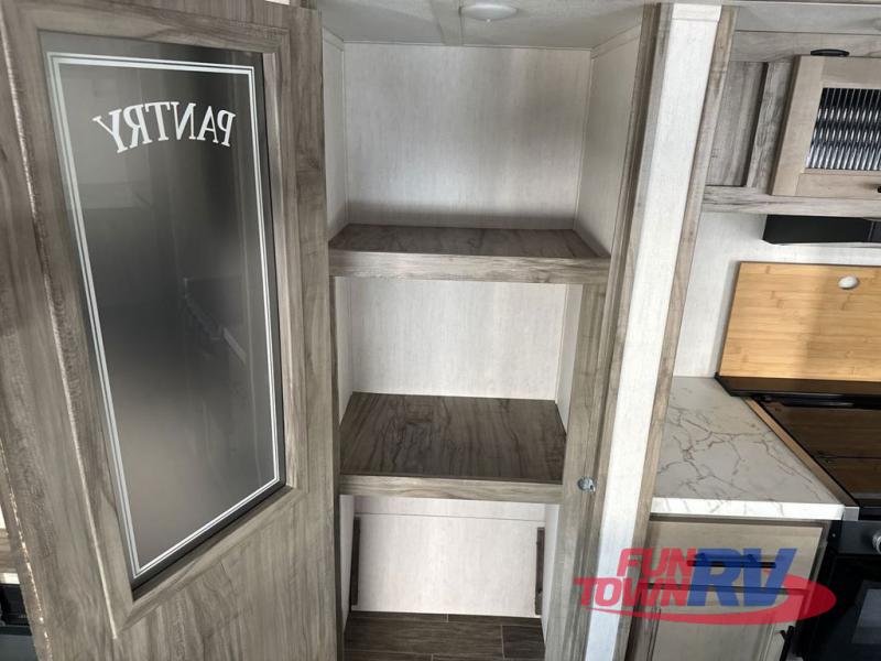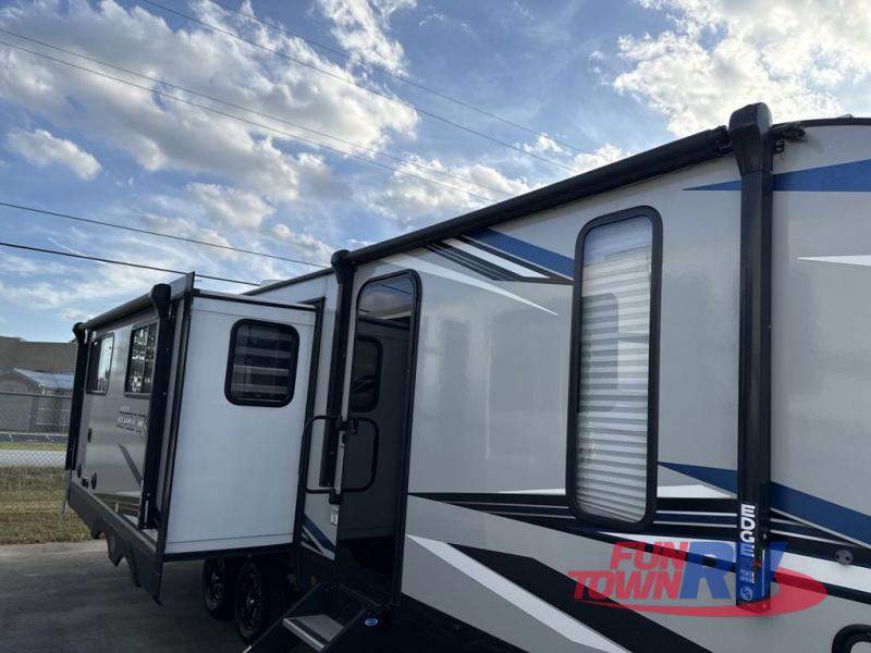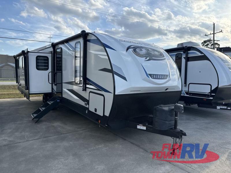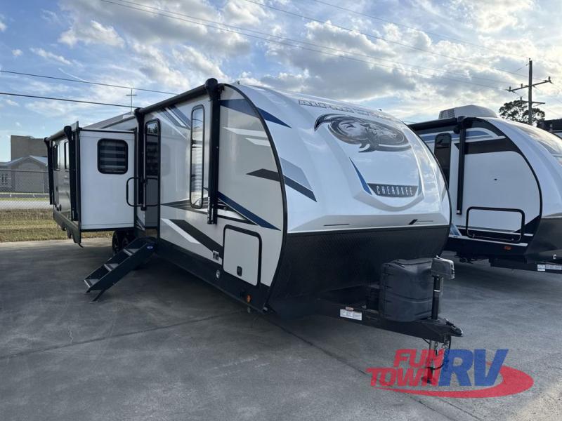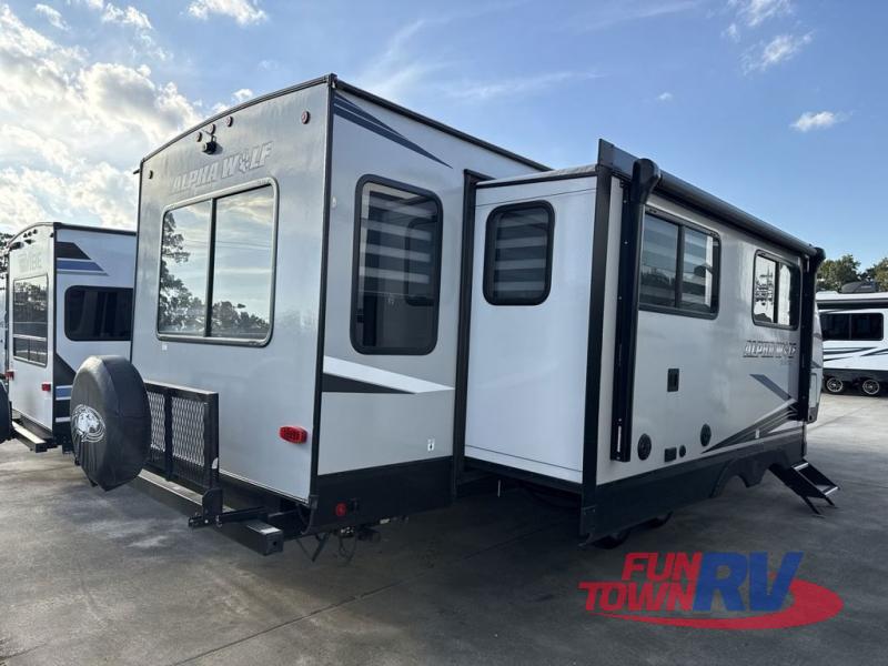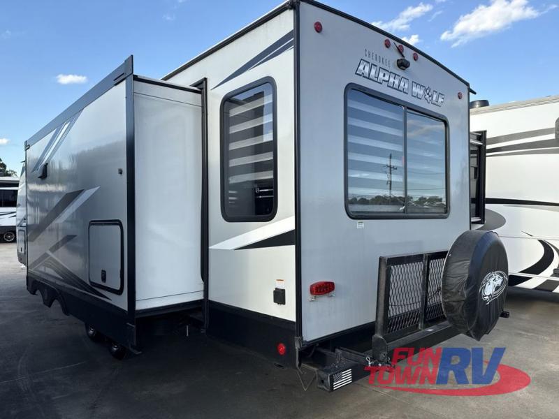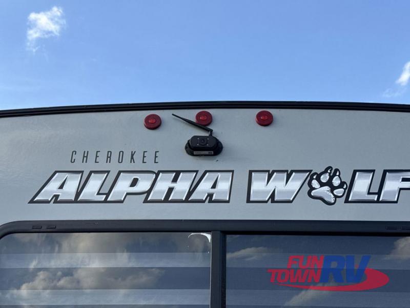 You will be one happy camper with any one of these Forest River Cherokee Alpha Wolf travel trailers! You will not only find top shelf amenities, but also a tougher, lighter, and better insulated shell with the engineered wood SuperTruss roof structure with 3/8" fully walkable decking. The LED interior and exterior lighting packages make it possible to see whether day or night, and the unobstructed pass-through storage area lets you easily access your camping gear. A few other features you will love having are the aluminum rims with tire pressure monitors, the Alpha bath fixtures, the power tongue jack, and the super-plush Evergreen mattress with a deluxe bedding package. You won't be disappointed with any one of these travel trailers!
