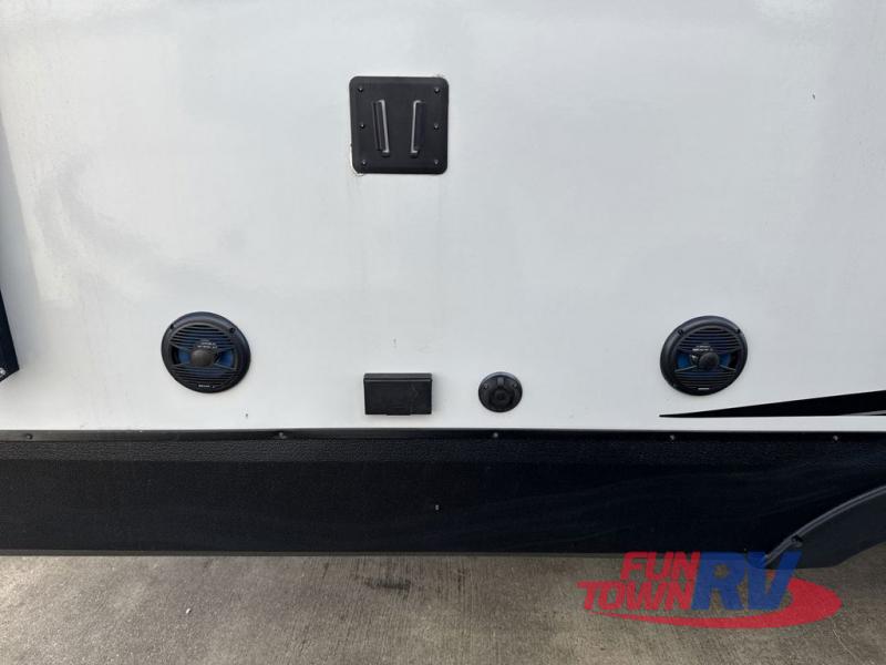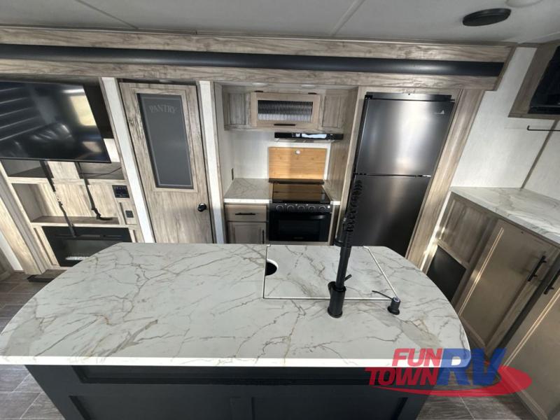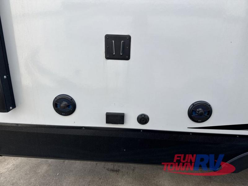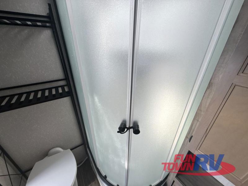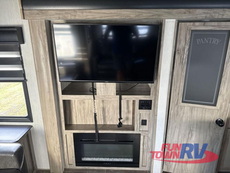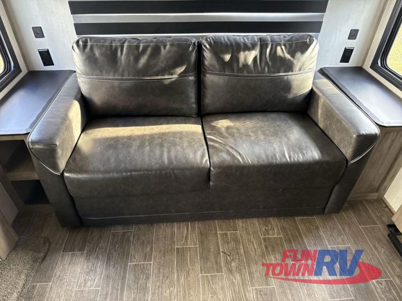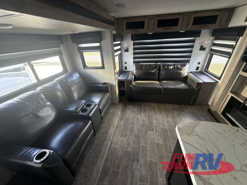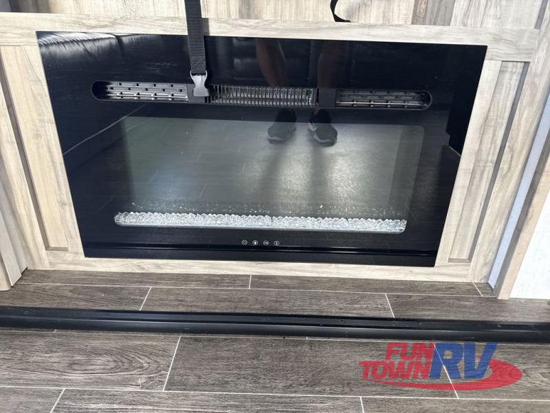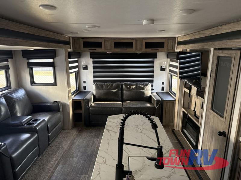 Come see how popular and spacious this couples travel trailer is! An extra guest or two can join in on the fun too with the rear tri-fold hide-a-bed sofa to convert into a sleeping space. The chef of your group will have an easy time preparing dinner with the kitchen island, and the coffee lover will appreciate the coffee bar. The free standing table comes with four chairs to enjoy your meals at, and after dinner you can relax at the home theatre seating for a relaxing, heated massage with a cozy fire roaring in the electric fireplace. Everyone can easily access the dual entry bathroom and take a hot shower in the radius shower with a skylight above to let in some natural lighting, plus you can head right into the front private bedroom from the bathroom. Grab your pajamas from one of the shirt closets on either side of the queen bed, and if you choose to add the optional TV then you can watch your favorite movie in true relaxation!