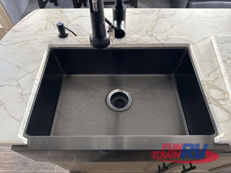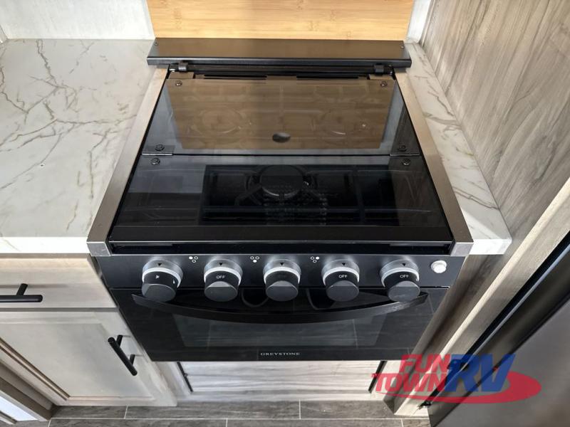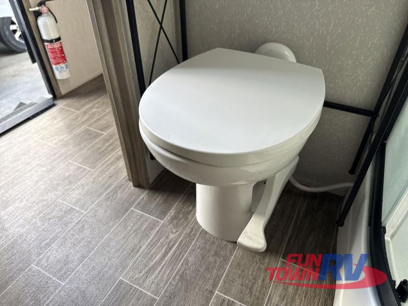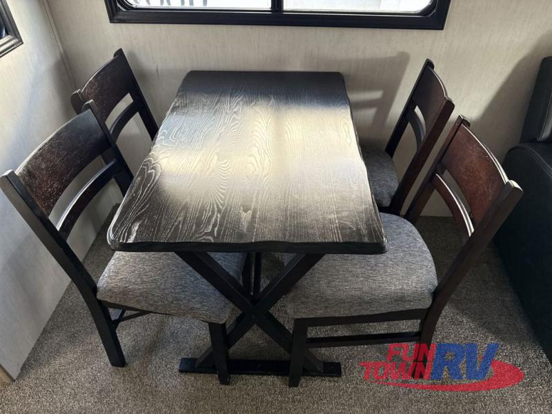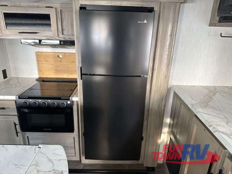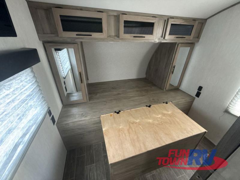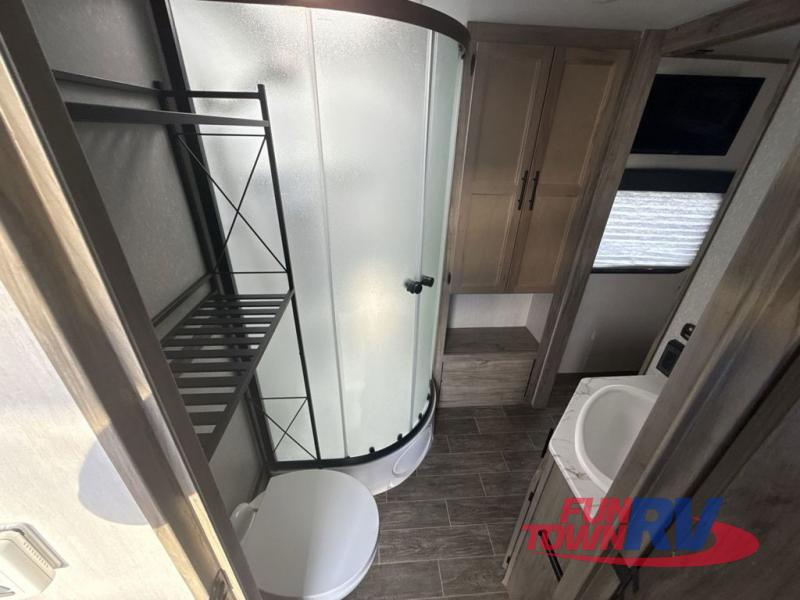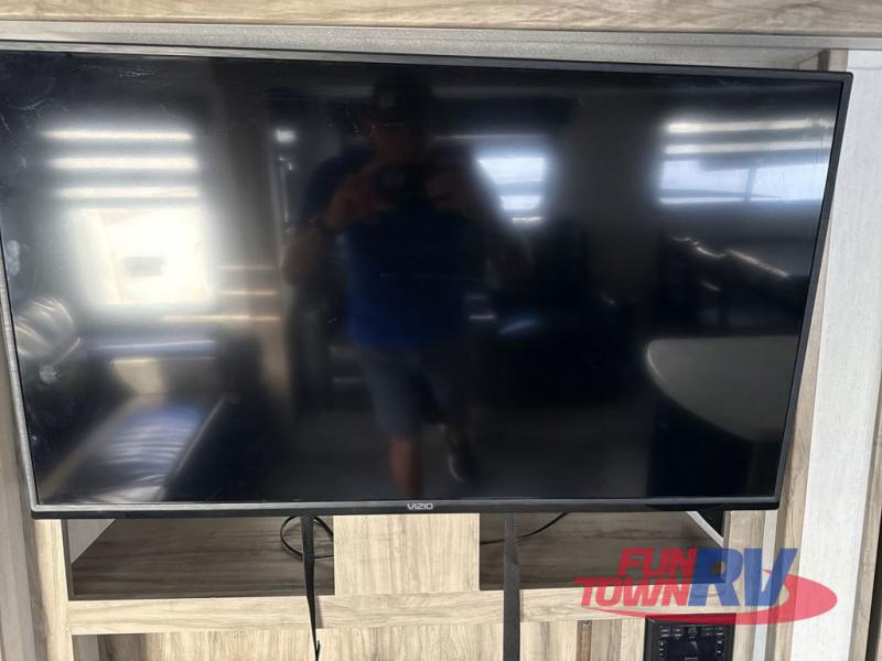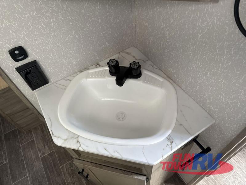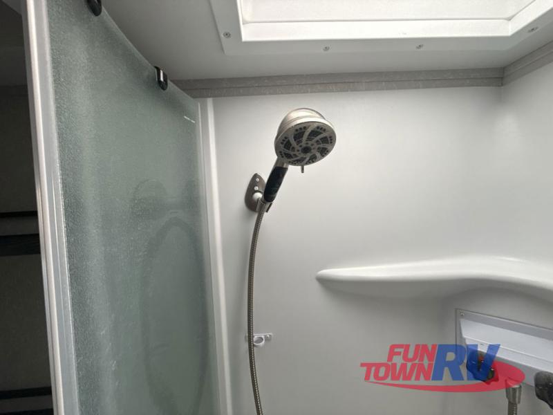 Come see how popular and spacious this couples travel trailer is! An extra guest or two can join in on the fun too with the rear tri-fold hide-a-bed sofa to convert into a sleeping space. The chef of your group will have an easy time preparing dinner with the kitchen island, and the coffee lover will appreciate the coffee bar. The free standing table comes with four chairs to enjoy your meals at, and after dinner you can relax at the home theatre seating for a relaxing, heated massage with a cozy fire roaring in the electric fireplace. Everyone can easily access the dual entry bathroom and take a hot shower in the radius shower with a skylight above to let in some natural lighting, plus you can head right into the front private bedroom from the bathroom. Grab your pajamas from one of the shirt closets on either side of the queen bed, and if you choose to add the optional TV then you can watch your favorite movie in true relaxation!