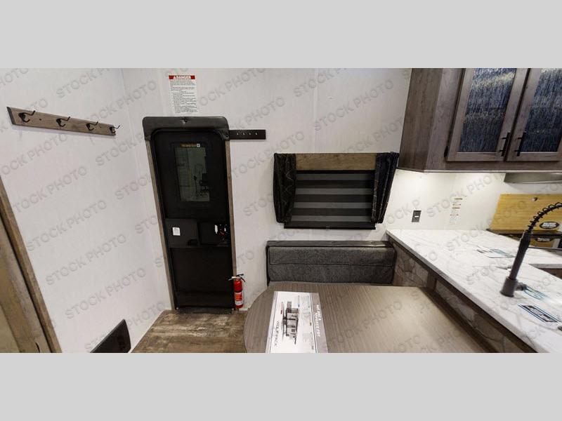 Inside, the main living area is designed for gathering after a full day of adventure. Relax on the party recliner sofa in the wide slide-out while the fireplace sets the mood. The dinette with bench seating gives you room for meals, game nights, or planning tomorrow’s ride. When the weather is perfect, the outdoor kitchen and dual power awnings make it easy to spend the whole day outside. Plus, the rear ramp converts into an elevated "Party Patio"—your private deck with a view.
