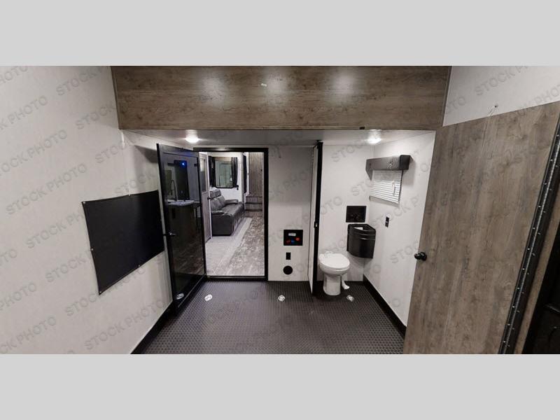 The massive 15' 10" garage handles ATVs, dirt bikes, kayaks, or anything else you bring along. Folding walls make loading easy, and the built-in half bath keeps the crew from tracking mud through the main living space. A loft above the garage gives the kids their own hideout, and the power bed system means you can transform the garage from cargo bay to bunk room in minutes.