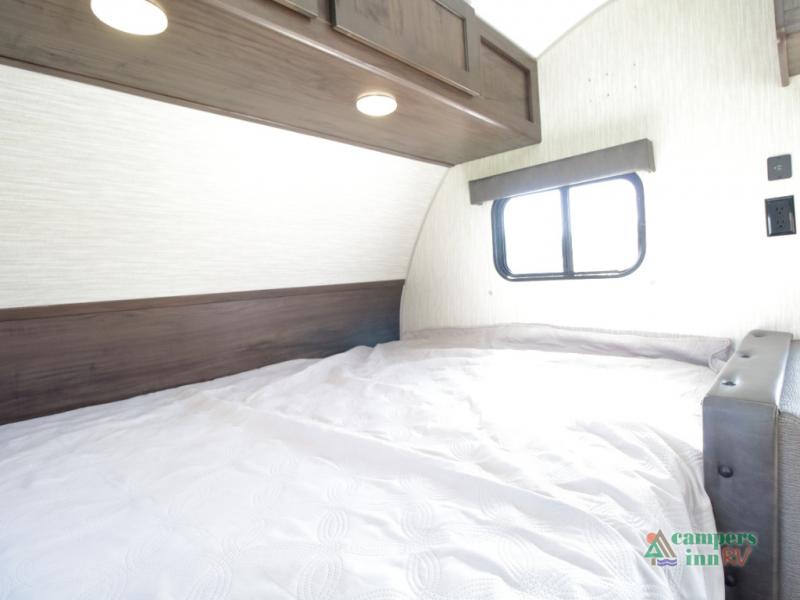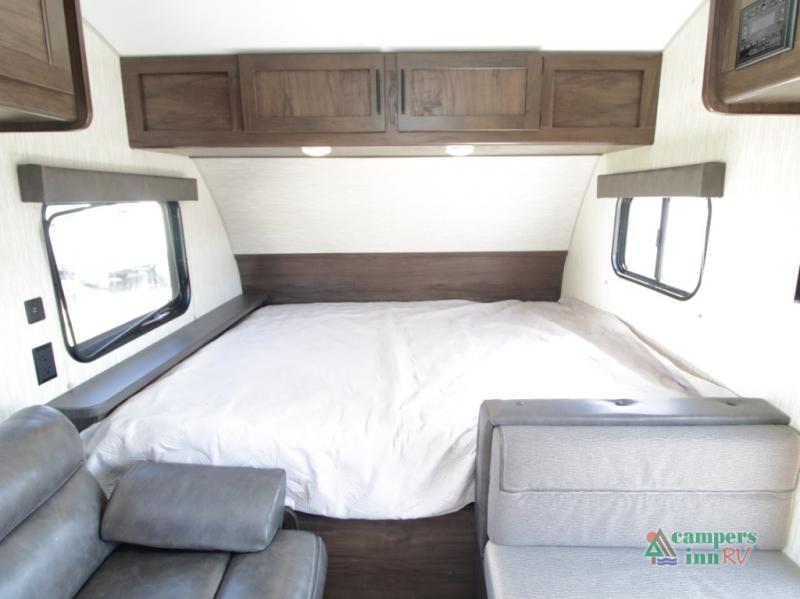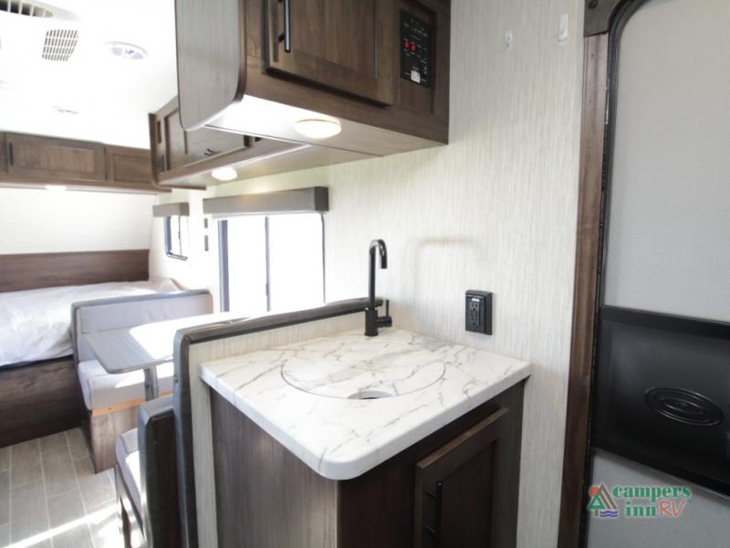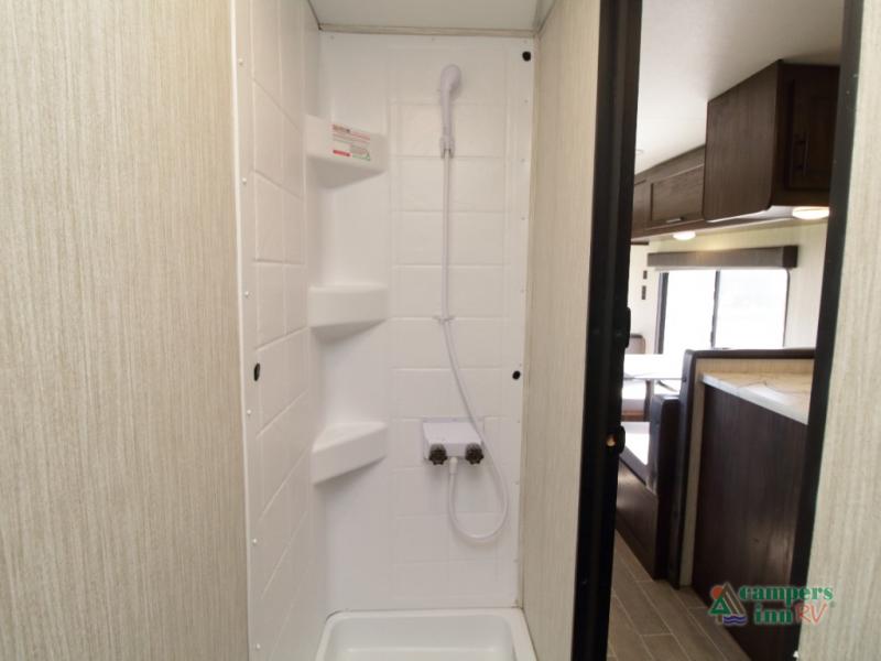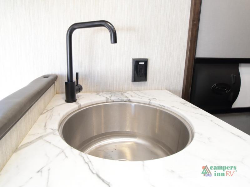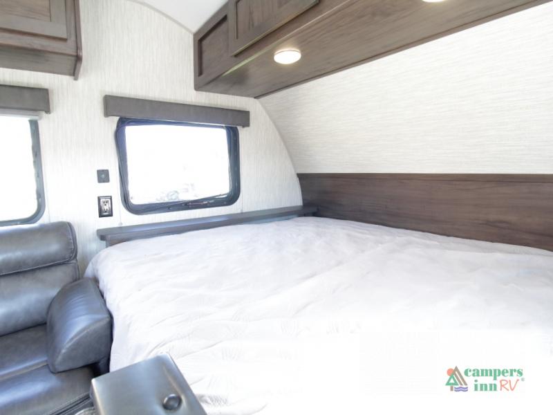 Inside, you’ll find everything you need for a comfortable getaway. The queen-size bed ensures restful nights, while the booth dinette is perfect for meals, games, or conversation. Freshen up in the radius shower, and take advantage of the overhead cabinets for organized storage throughout your trip. The integrated stereo system with interior and exterior speakers lets you set the mood wherever you are.