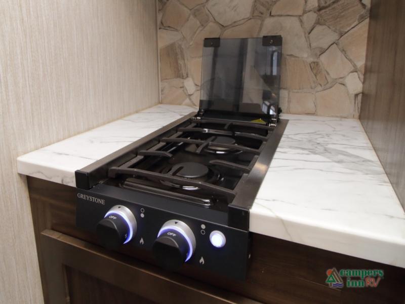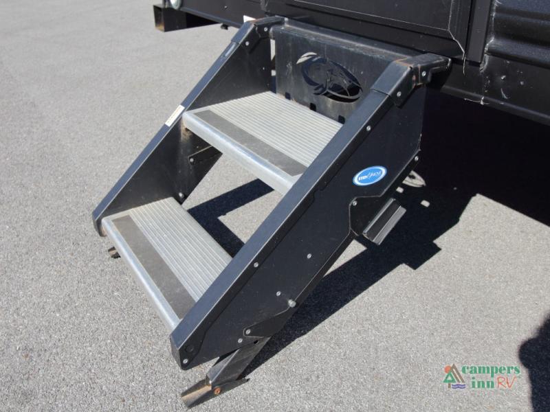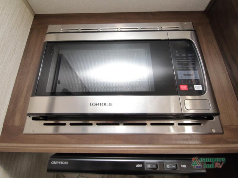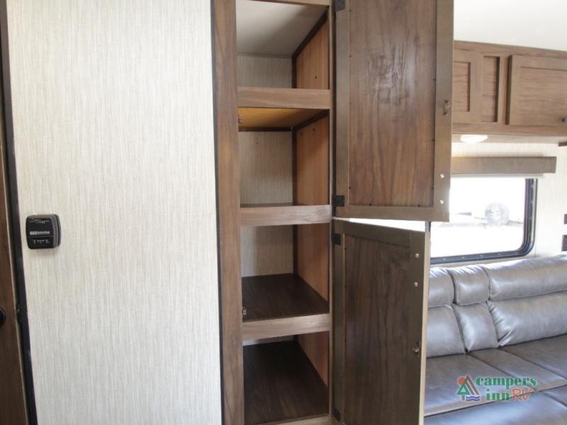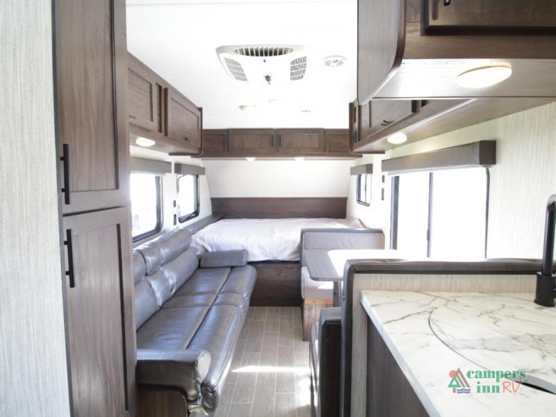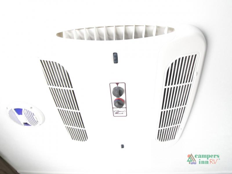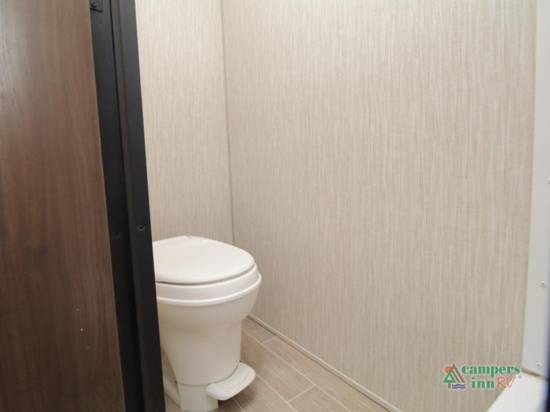 Inside, you’ll find everything you need for a comfortable getaway. The queen-size bed ensures restful nights, while the booth dinette is perfect for meals, games, or conversation. Freshen up in the radius shower, and take advantage of the overhead cabinets for organized storage throughout your trip. The integrated stereo system with interior and exterior speakers lets you set the mood wherever you are.
