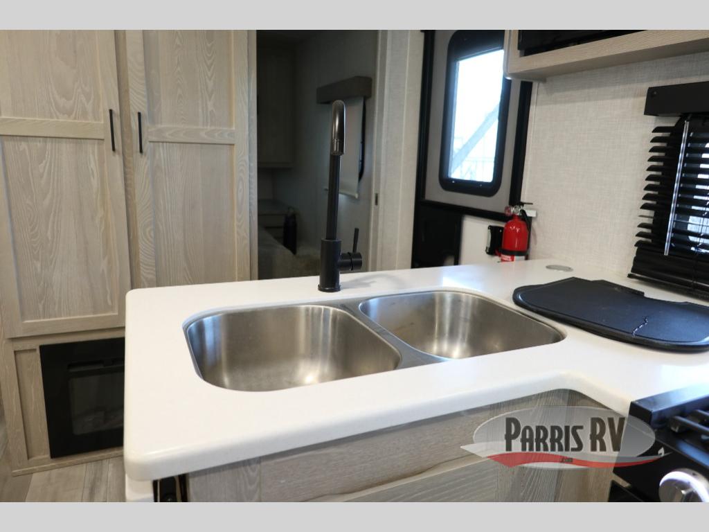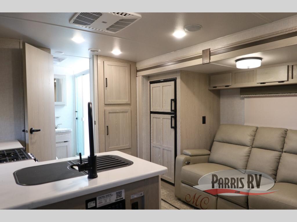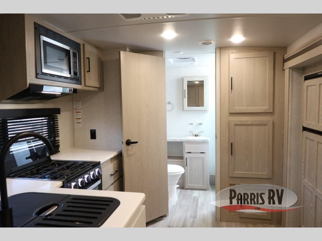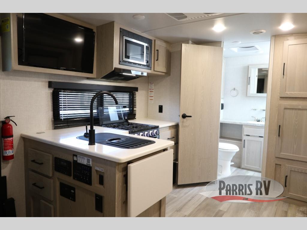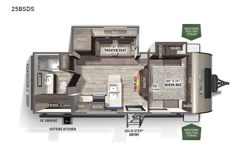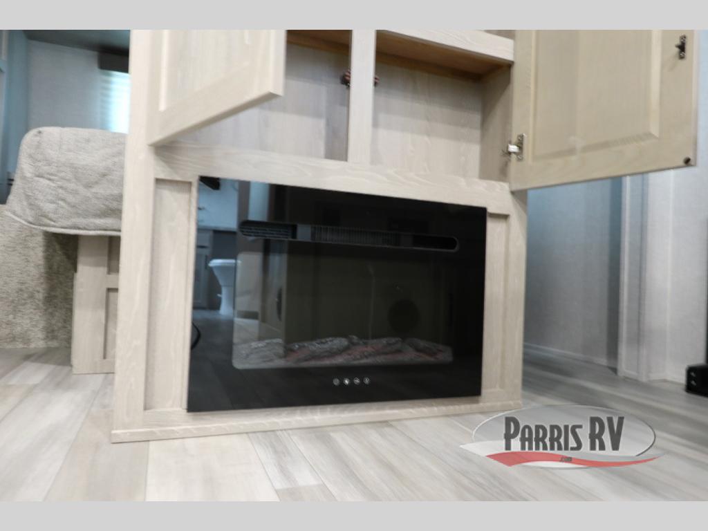 This excellent Flagstaff Micro Lite travel trailer has just what you want! There is a private bedroom with an RV queen bed and wardrobe slide, and the kitchen provides you with a three-burner range, gas oven, double-bowl sink, and countertop extension. The 67" theater seating is perfectly placed to enjoy the warmth of the fireplace, and there are also two pantries so that you can grab a snack before sitting down to relax. The rear bathroom is full of all of the essentials, and there is also an outdoor kitchen on this model so that you can stay outside even while you are preparing dinner.