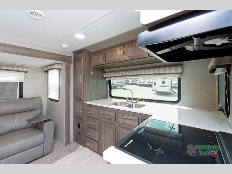 The front kitchen layout offers generous counter space and a pantry, making meal prep easy and enjoyable. The slide-out U-shaped dinette creates a roomy living area perfect for dining, lounging, or sleeping additional guests. At the rear, the private bedroom ensures restful nights with an RV queen bed and plenty of storage.