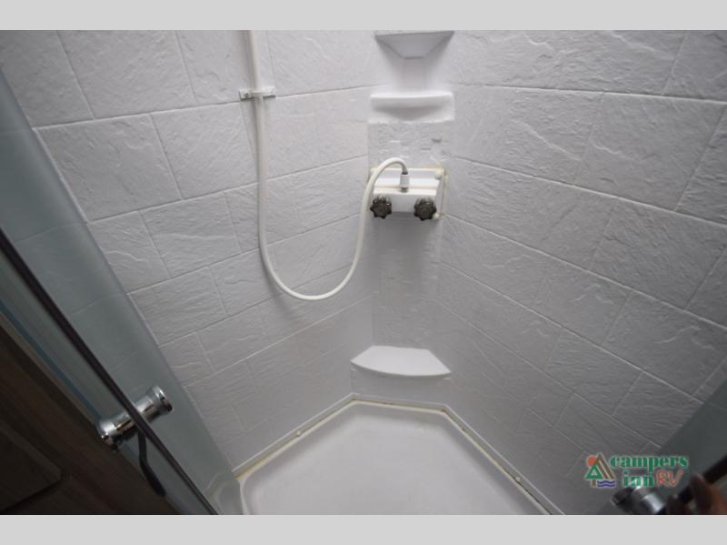 Rear corner full bathroom with shower, toilet, and vanity – compact and convenient
