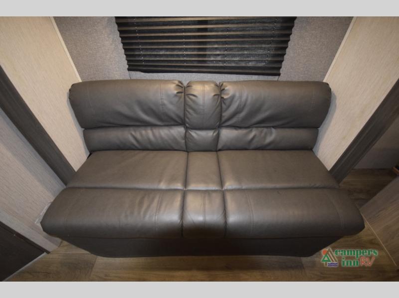 Spacious single slide-out with sofa and free-standing table – lounge, dine, or work in style