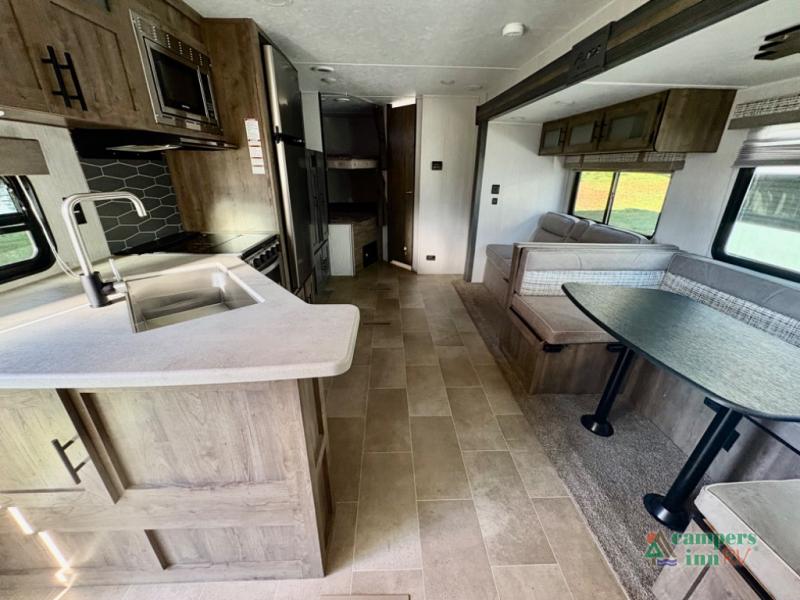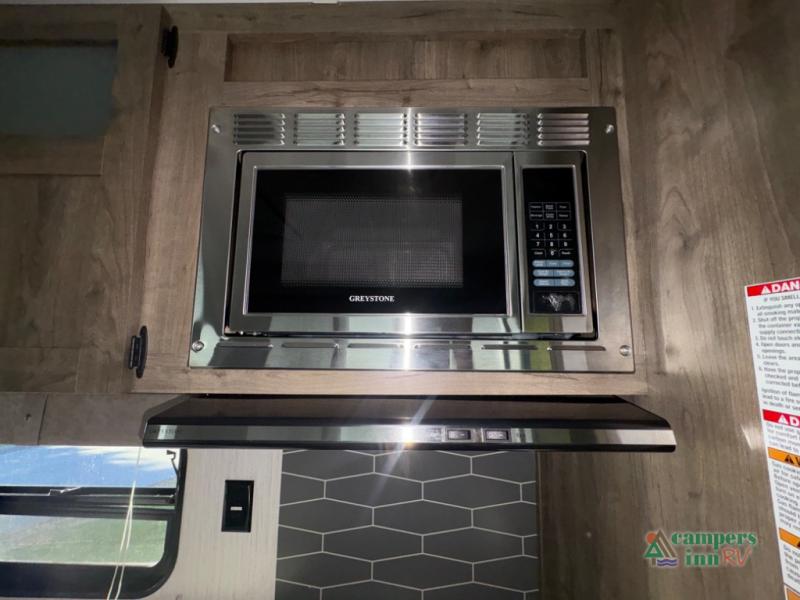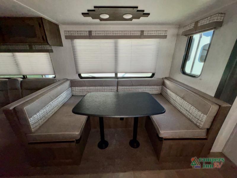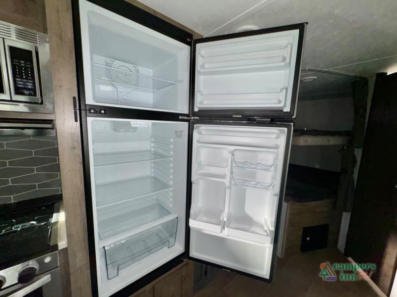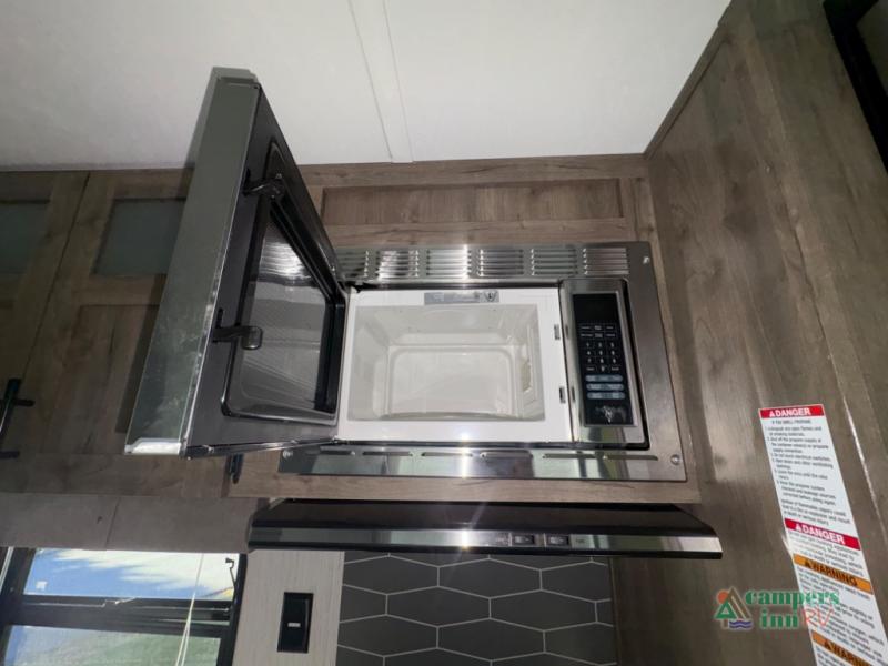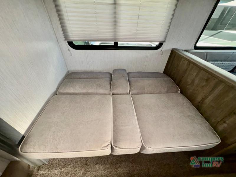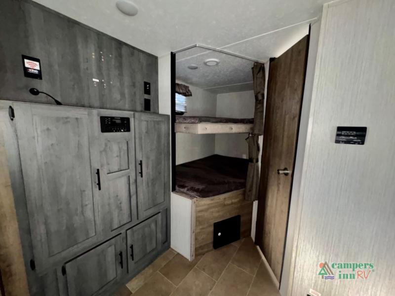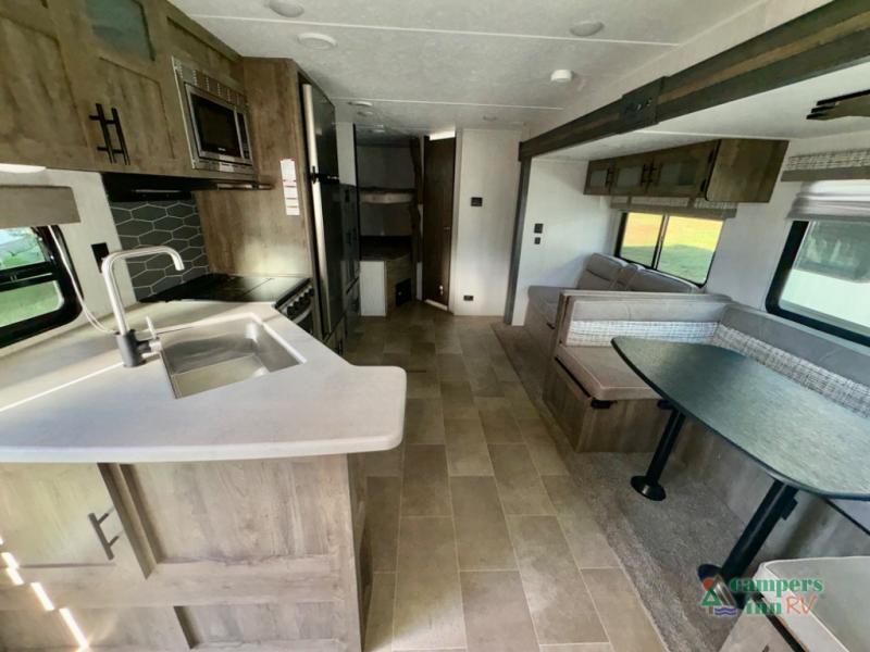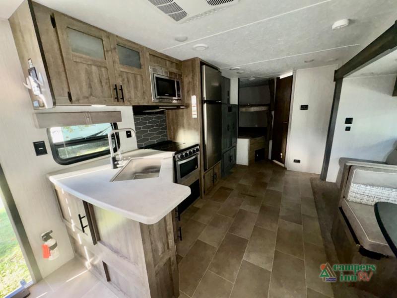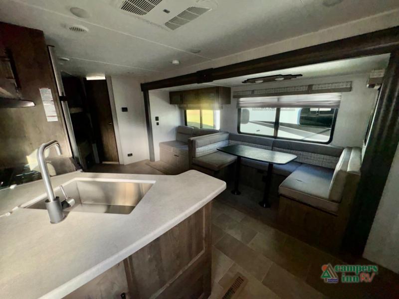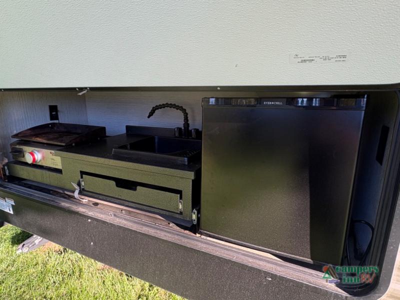 Now the whole family or group of friends can come along in this travel trailer that can sleep up to ten people each night. You'll find plenty of storage space for all your belongings, including storage under the double-size bunks, a wardrobe and pantry in the kitchen, plus an exterior pass-through storage for tackle boxes and lawn chairs. Within the large slide out you'll find the sofa and U-shaped dinette that will be perfect for relaxing, meal times, and additional sleeping space. The chef of the family can prepare meals on the three burner cooktop or use the stainless steel microwave for quick lunches. If you're wanting to cook in the fresh air, just choose the optional mini camp kitchen that will go perfect with the electric awning and outside speakers.