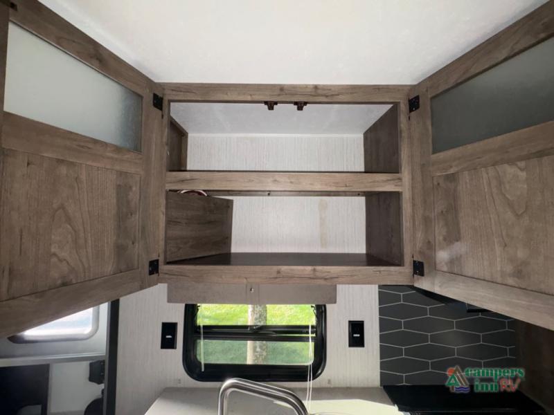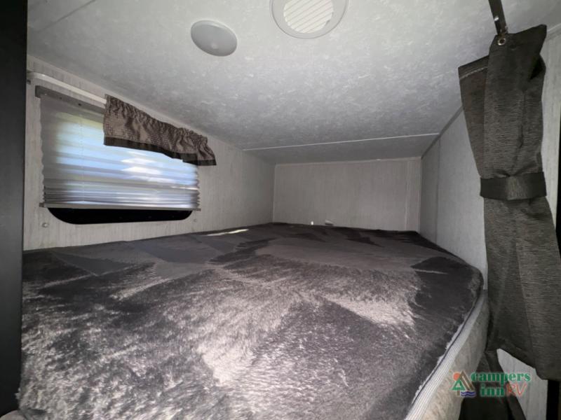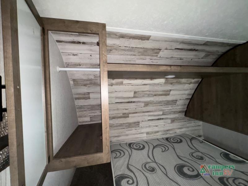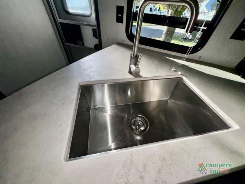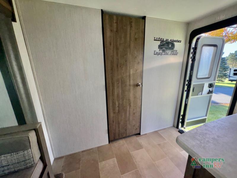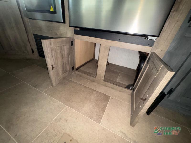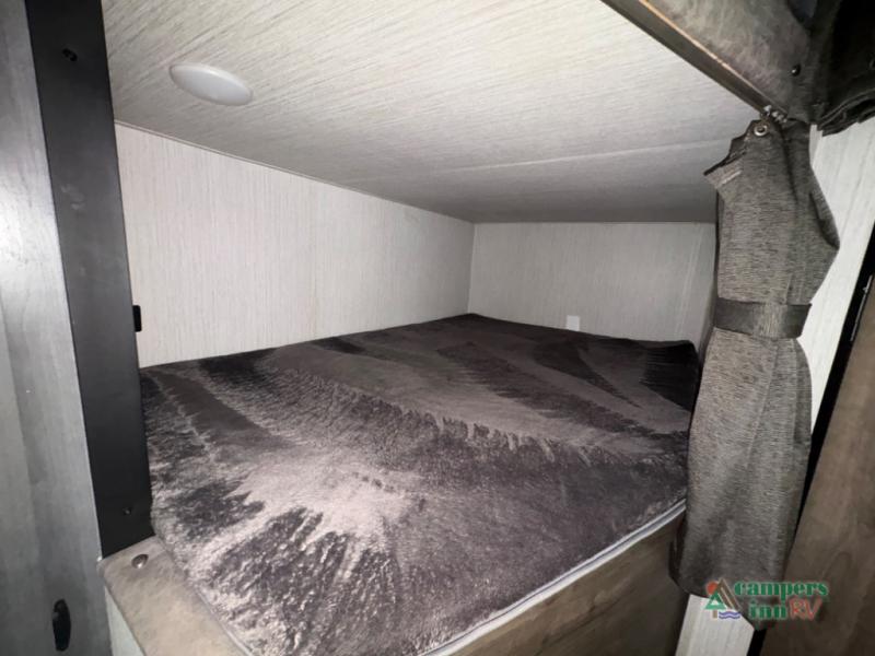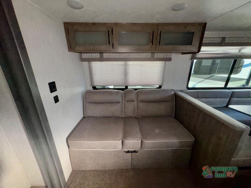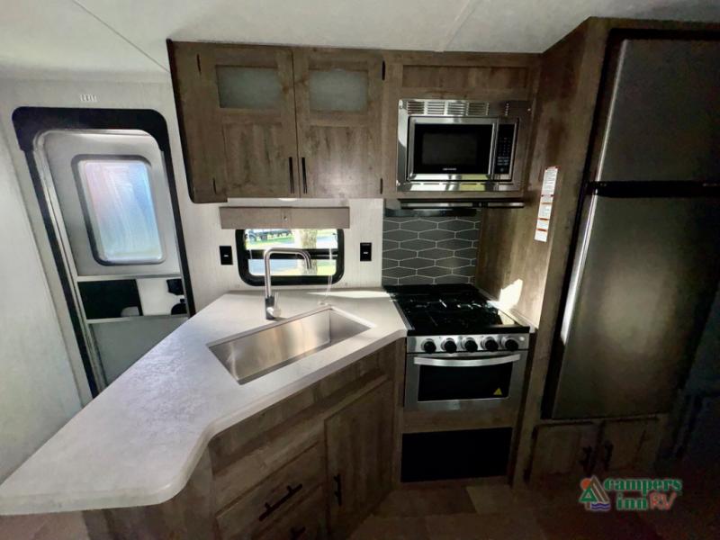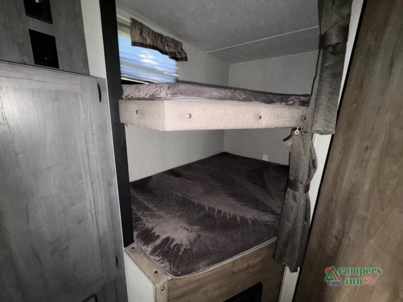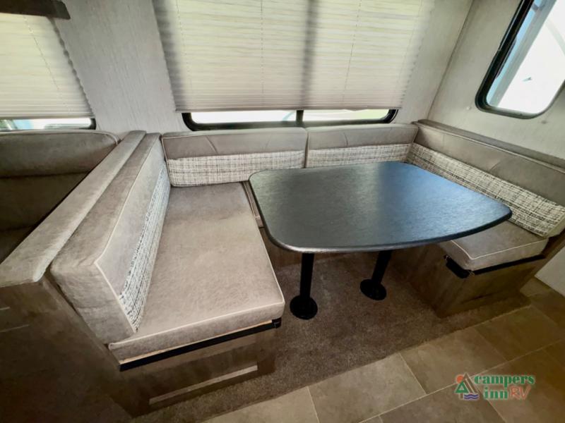 Now the whole family or group of friends can come along in this travel trailer that can sleep up to ten people each night. You'll find plenty of storage space for all your belongings, including storage under the double-size bunks, a wardrobe and pantry in the kitchen, plus an exterior pass-through storage for tackle boxes and lawn chairs. Within the large slide out you'll find the sofa and U-shaped dinette that will be perfect for relaxing, meal times, and additional sleeping space. The chef of the family can prepare meals on the three burner cooktop or use the stainless steel microwave for quick lunches. If you're wanting to cook in the fresh air, just choose the optional mini camp kitchen that will go perfect with the electric awning and outside speakers.