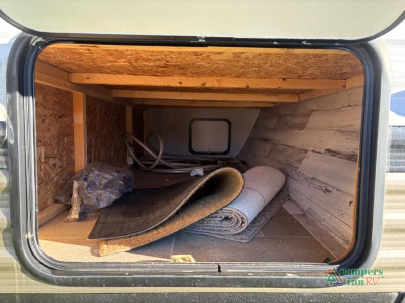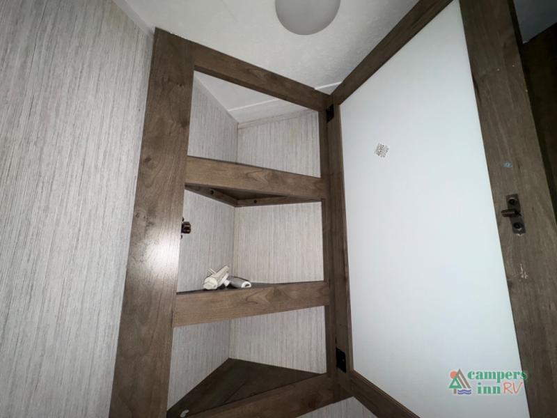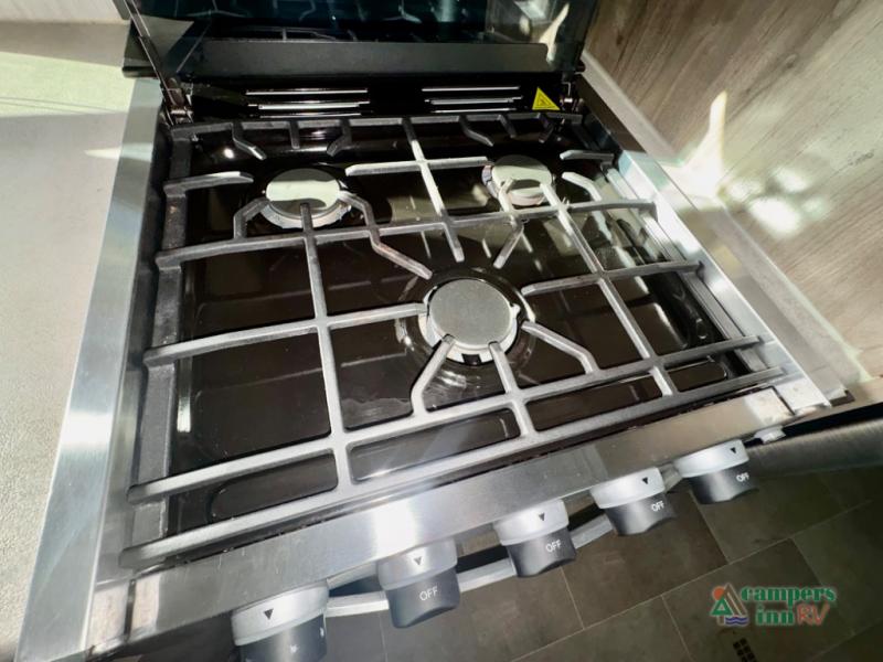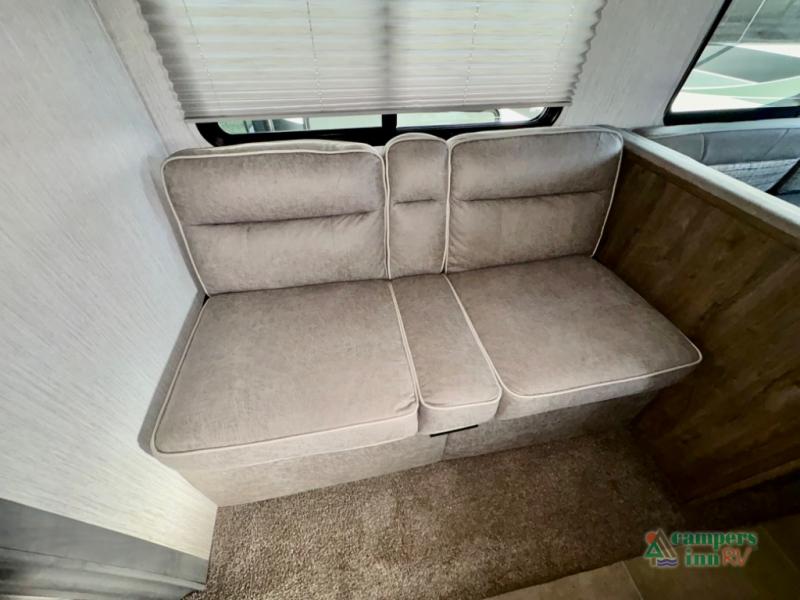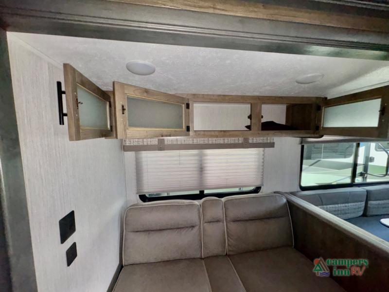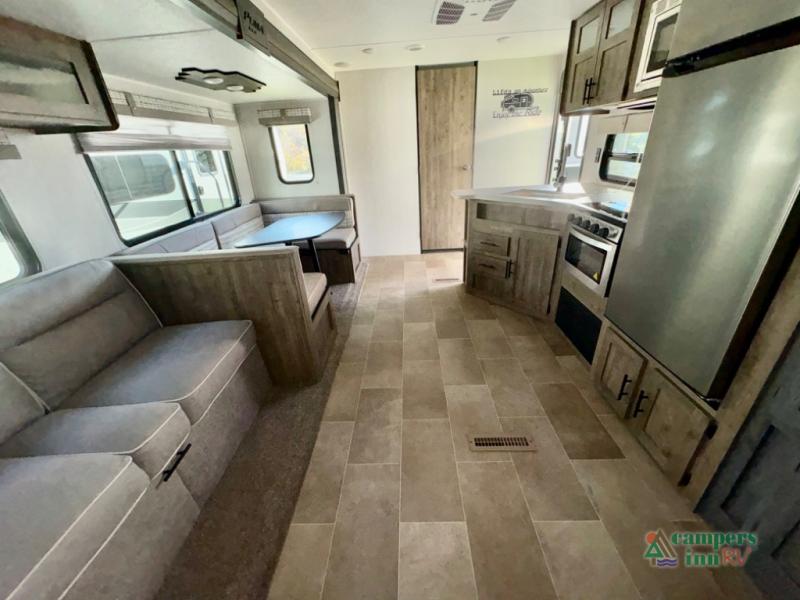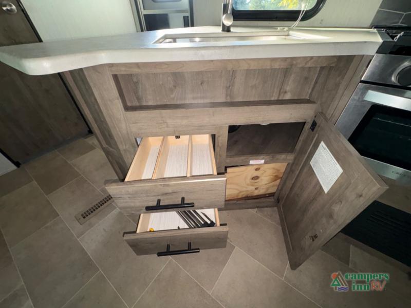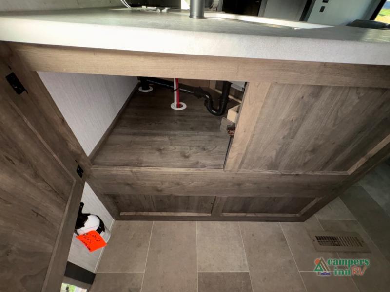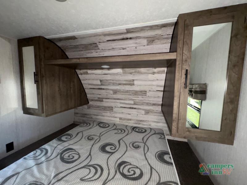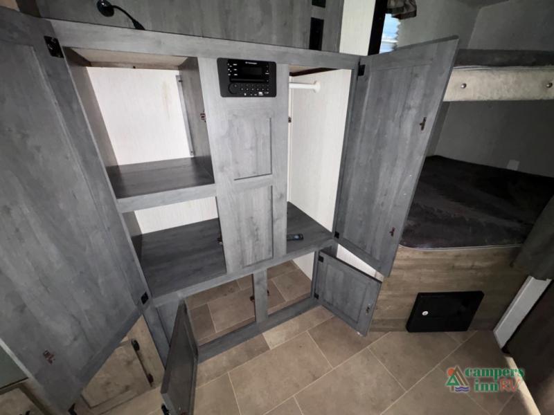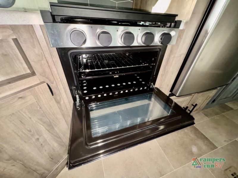 Now the whole family or group of friends can come along in this travel trailer that can sleep up to ten people each night. You'll find plenty of storage space for all your belongings, including storage under the double-size bunks, a wardrobe and pantry in the kitchen, plus an exterior pass-through storage for tackle boxes and lawn chairs. Within the large slide out you'll find the sofa and U-shaped dinette that will be perfect for relaxing, meal times, and additional sleeping space. The chef of the family can prepare meals on the three burner cooktop or use the stainless steel microwave for quick lunches. If you're wanting to cook in the fresh air, just choose the optional mini camp kitchen that will go perfect with the electric awning and outside speakers.