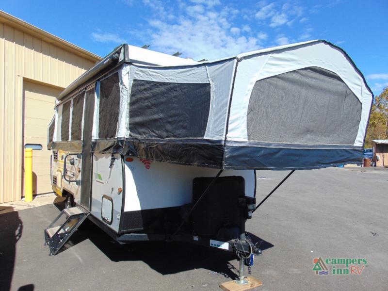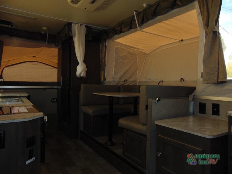 With any Forest River Rockwood High Wall folding pop-up camper, you will start with a powder coated tubular steel frame with five-piece Vinolon Supreme tenting, plus a power roof lift and four EZ crank down stabilizer jacks with sand pads for an easy and sturdy setup. The comfortable interior provides conveniences such as heated mattress bunk ends, a water filtration system, two bed end lights with a fan, and a hot water package including an outside shower. Choose a High Wall today for the travel trailer type amenities and the easy storage and towing capabilities!