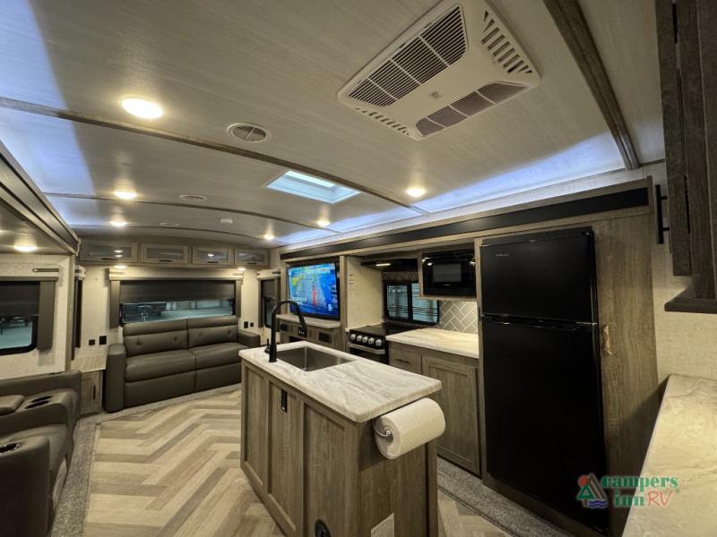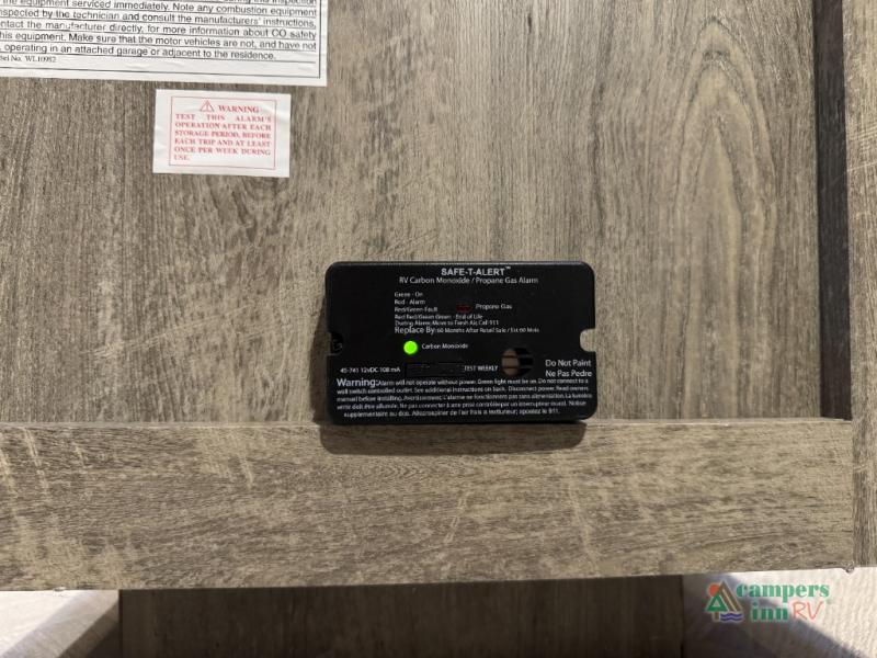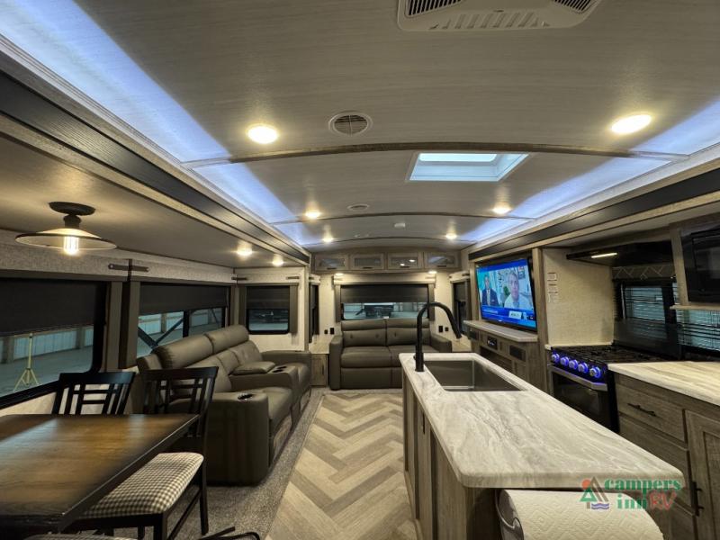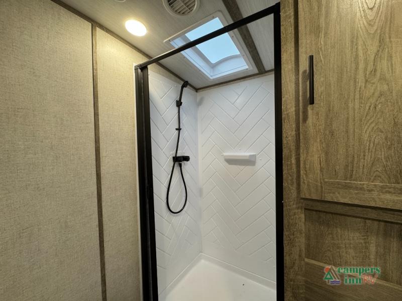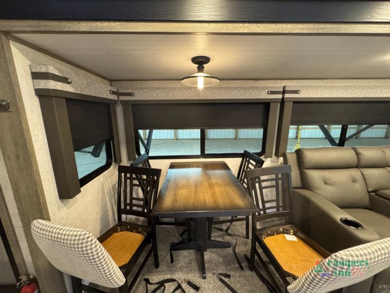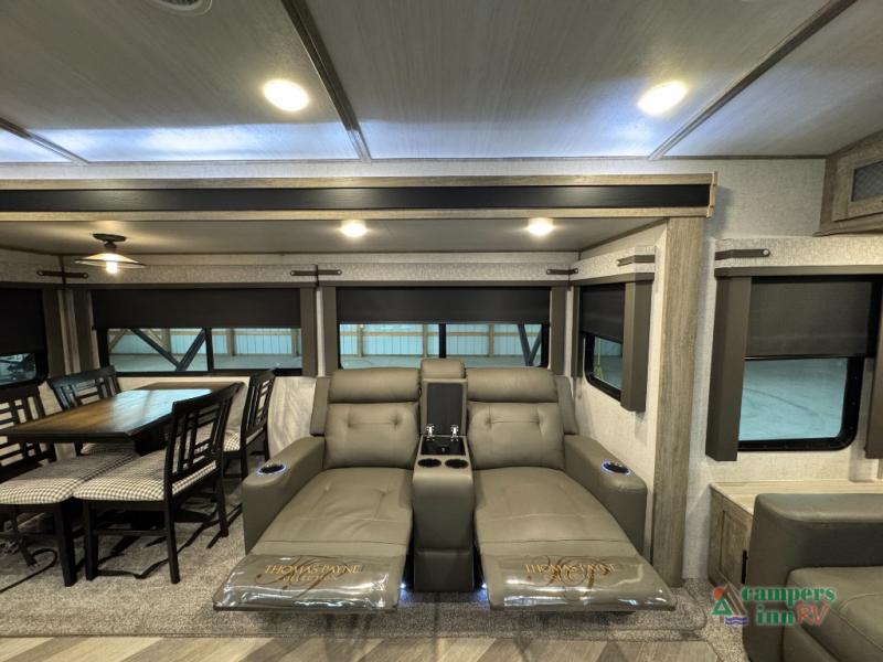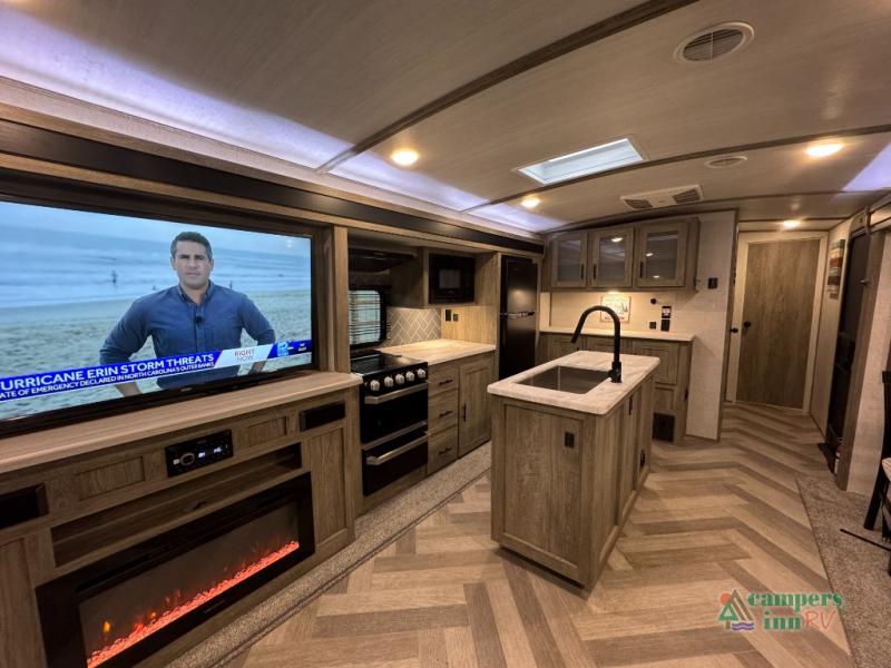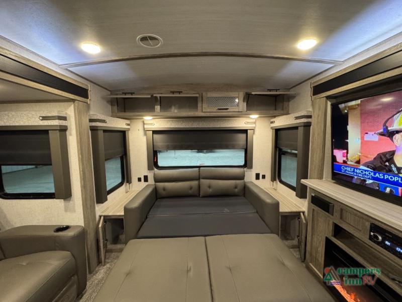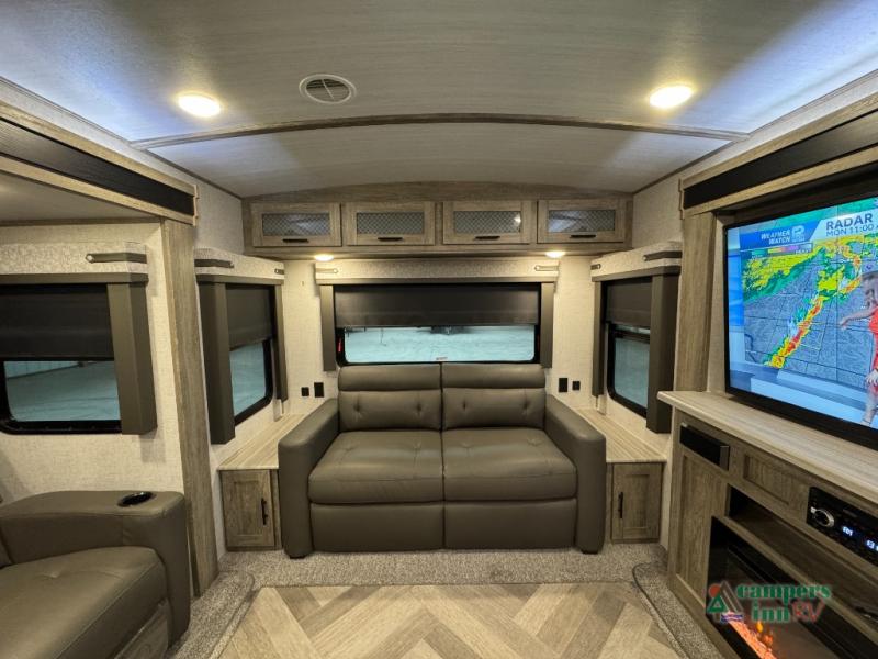 Step inside this luxurious travel trailer and see all that it has to offer! You will enjoy a good night's rest each night on the queen bed with wardrobes on either side to keep your hanging clothes wrinkle free, and if you have a couple of guests then you can convert the rear tri-fold sofa or the booth dinette into a sleeping space. The 30" x 36" walk-in shower with a skylight above invites you to take a hot, steamy shower after a fun-filled day outdoors. Once you're cleaned up, you can grab some leftovers from the 10.7 cu. ft. residential refrigerator and warm it up in the microwave then head to the theatre seating and watch your favorite movie on the 50" LED TV with a 32" glass front electric fireplace below!