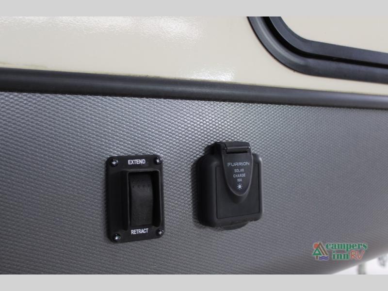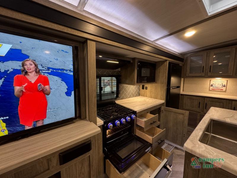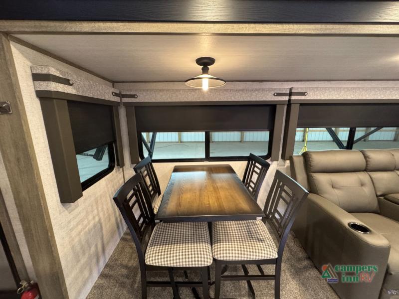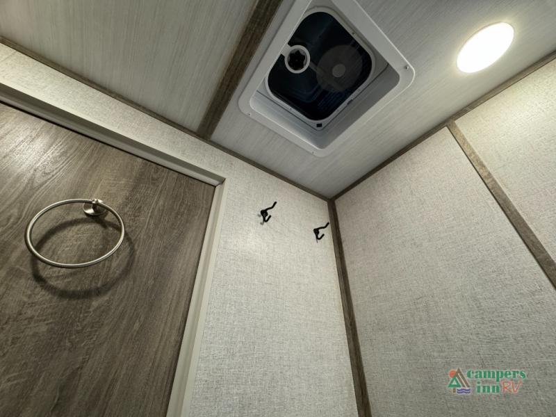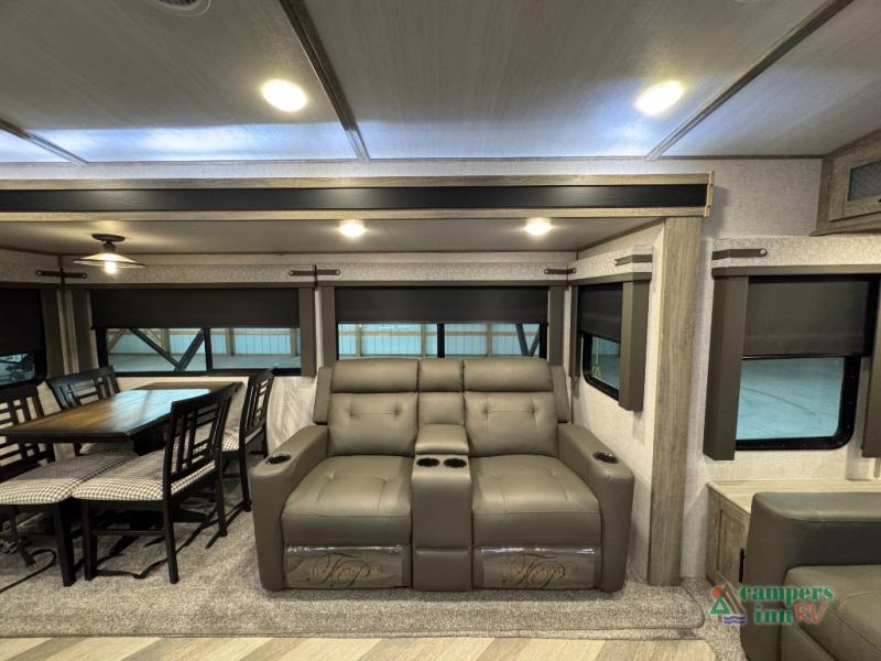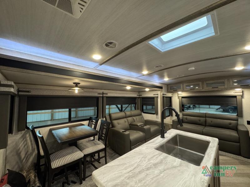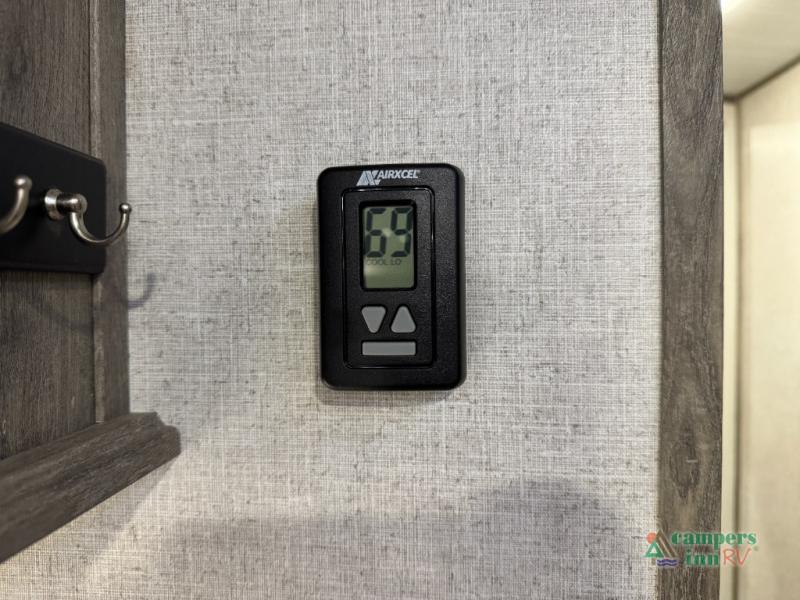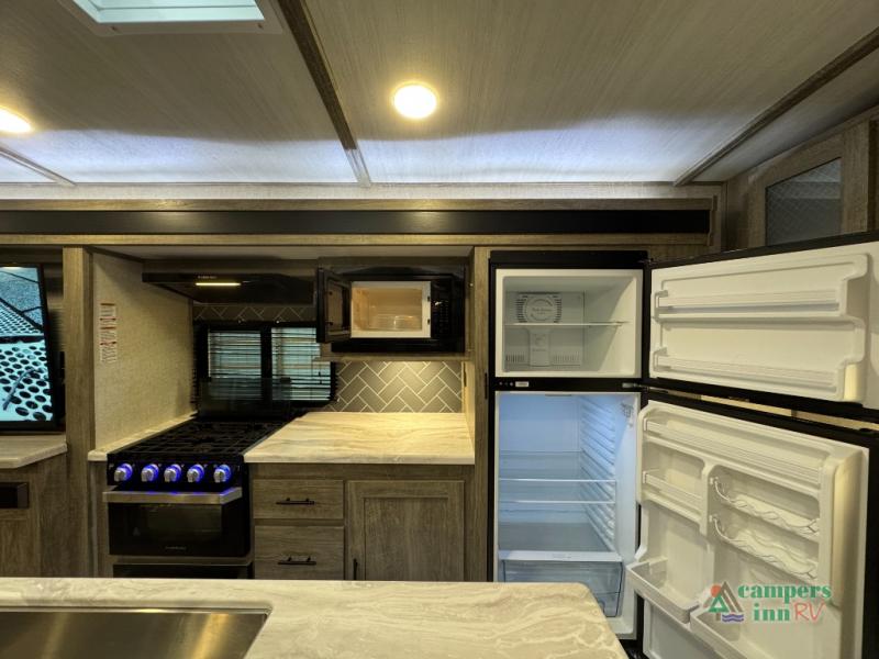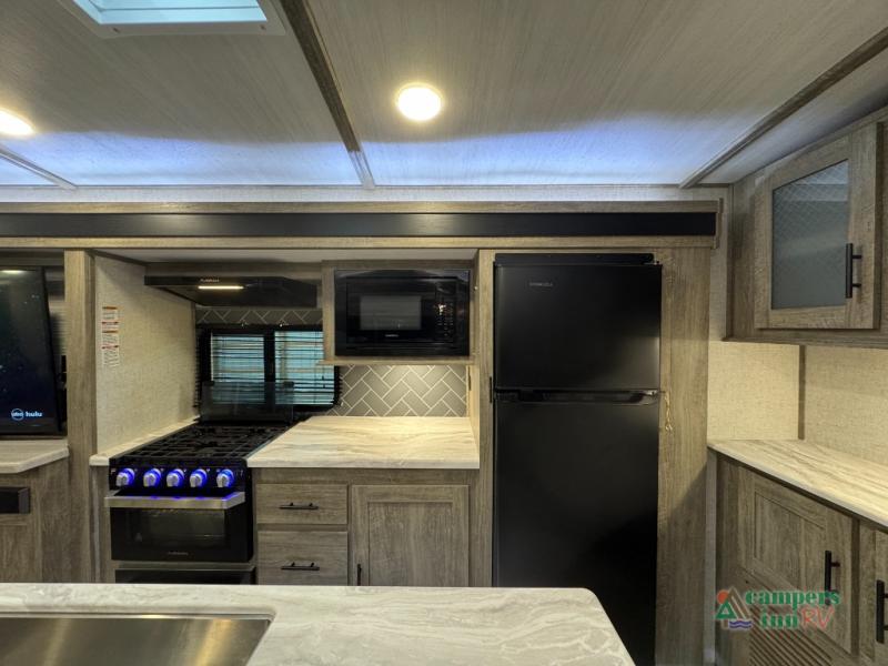 Step inside this luxurious travel trailer and see all that it has to offer! You will enjoy a good night's rest each night on the queen bed with wardrobes on either side to keep your hanging clothes wrinkle free, and if you have a couple of guests then you can convert the rear tri-fold sofa or the booth dinette into a sleeping space. The 30" x 36" walk-in shower with a skylight above invites you to take a hot, steamy shower after a fun-filled day outdoors. Once you're cleaned up, you can grab some leftovers from the 10.7 cu. ft. residential refrigerator and warm it up in the microwave then head to the theatre seating and watch your favorite movie on the 50" LED TV with a 32" glass front electric fireplace below!