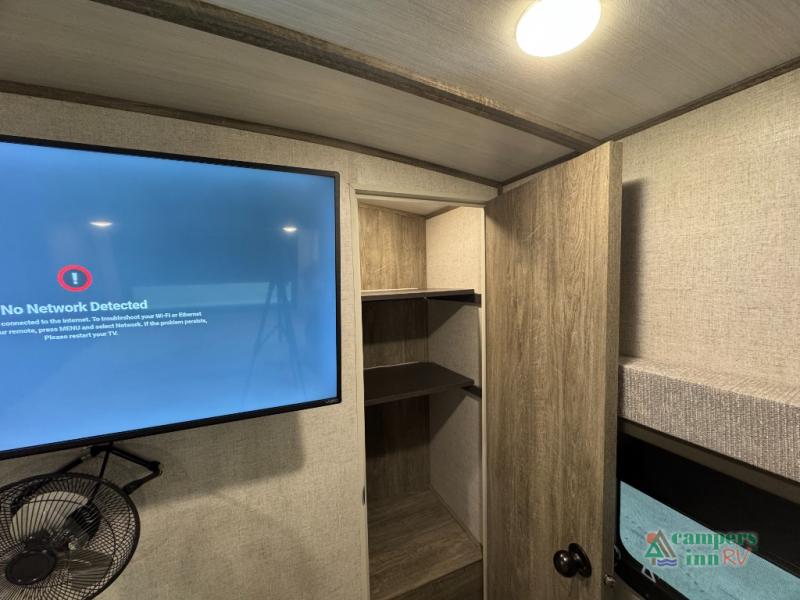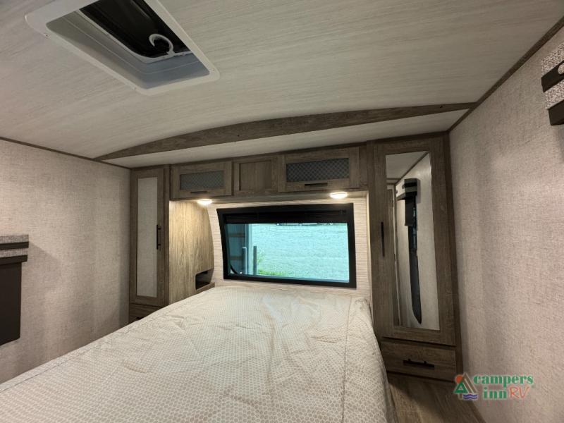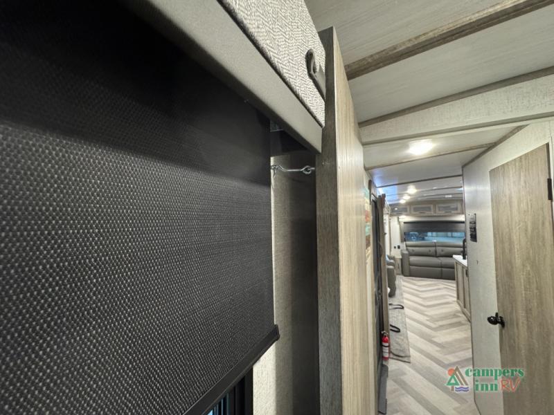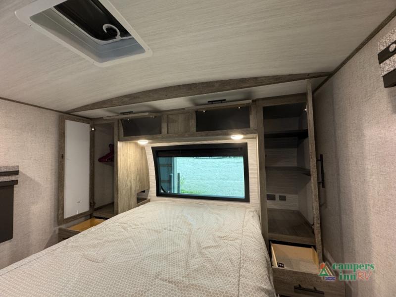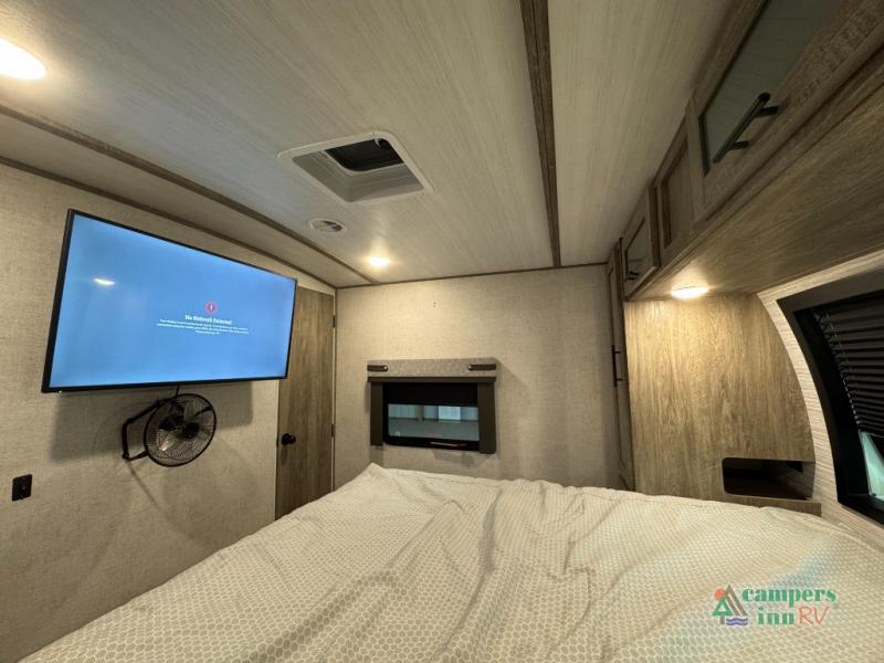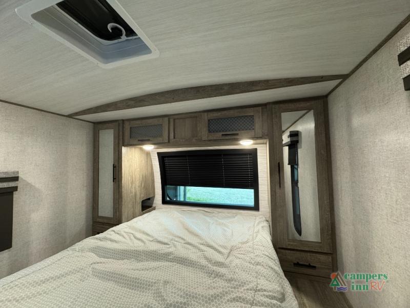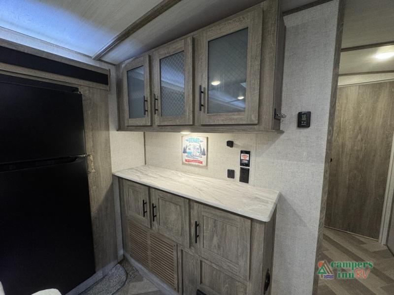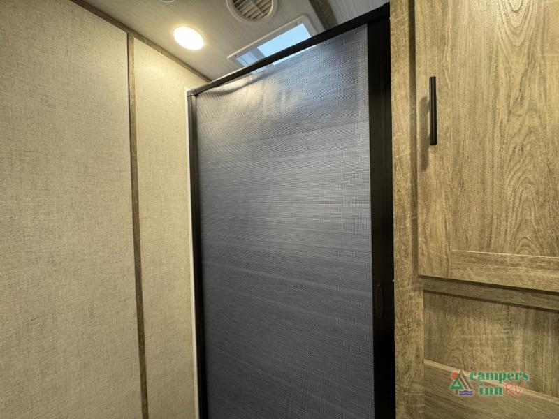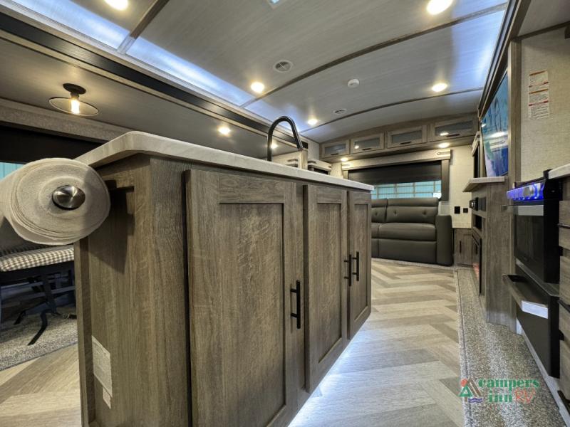 Step inside this luxurious travel trailer and see all that it has to offer! You will enjoy a good night's rest each night on the queen bed with wardrobes on either side to keep your hanging clothes wrinkle free, and if you have a couple of guests then you can convert the rear tri-fold sofa or the booth dinette into a sleeping space. The 30" x 36" walk-in shower with a skylight above invites you to take a hot, steamy shower after a fun-filled day outdoors. Once you're cleaned up, you can grab some leftovers from the 10.7 cu. ft. residential refrigerator and warm it up in the microwave then head to the theatre seating and watch your favorite movie on the 50" LED TV with a 32" glass front electric fireplace below!