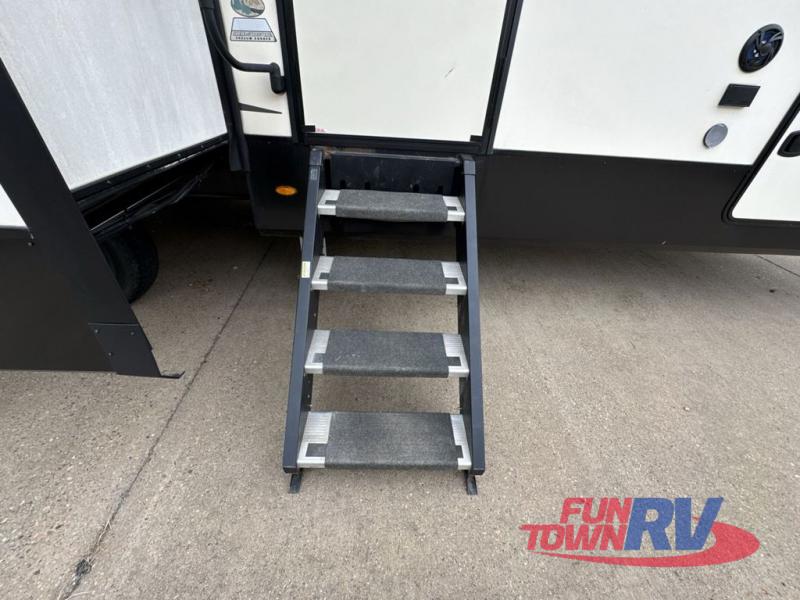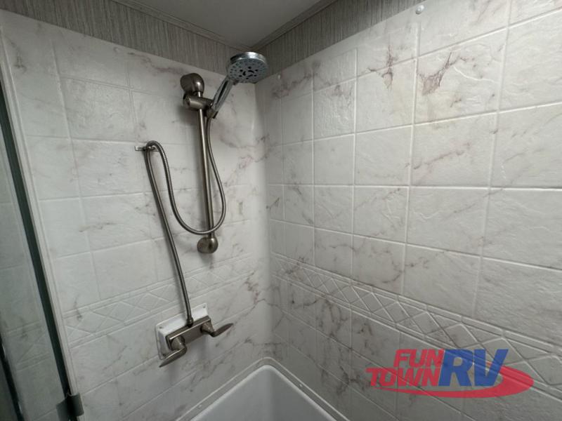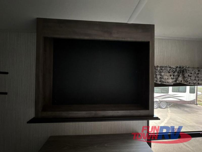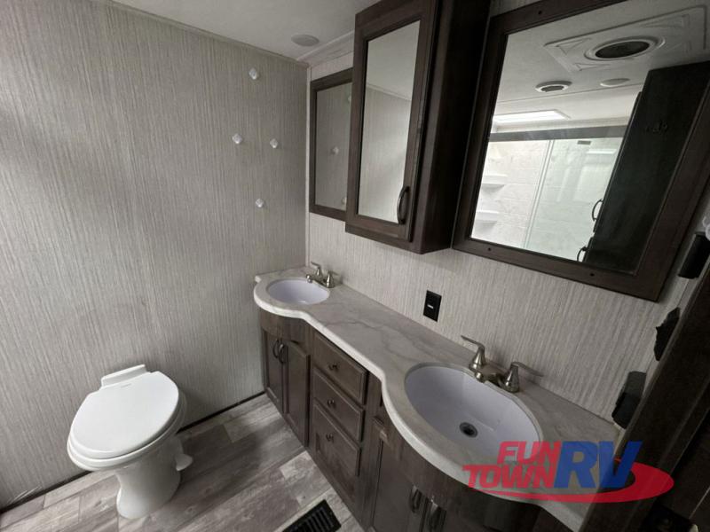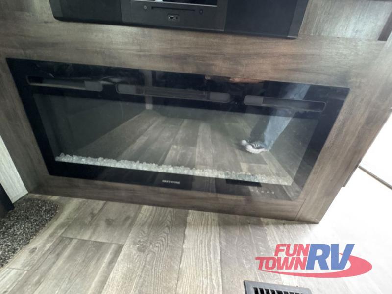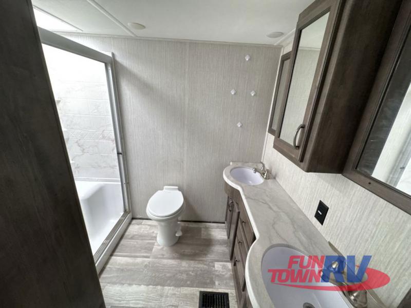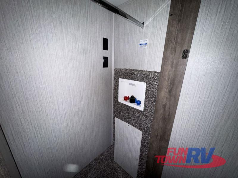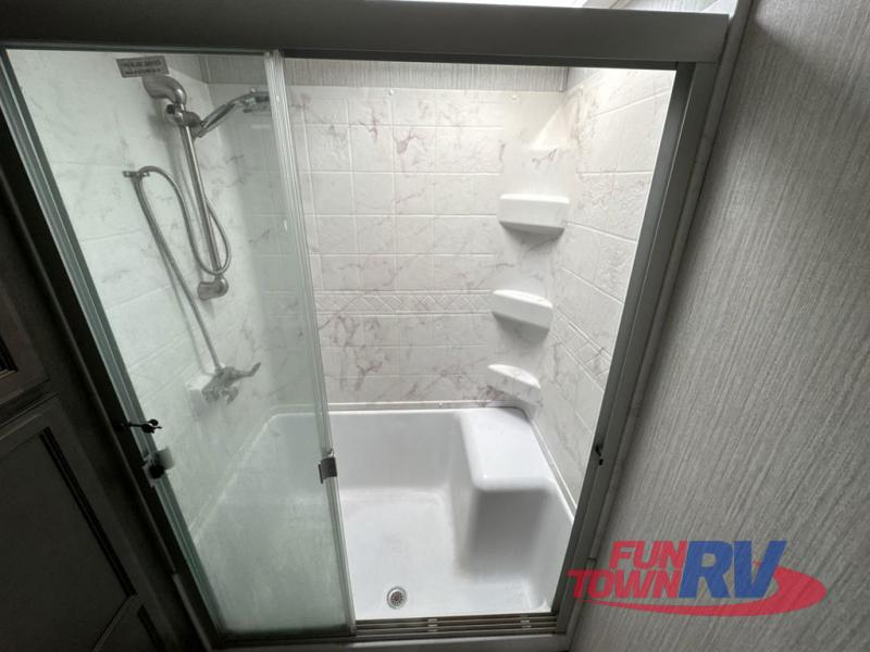 This open concept kitchen gives the cook plenty of space to prepare and serve meals for gatherings for friends and family, plus six people can visit while relaxing on the separate living room furniture which includes dual tri-fold hide-a-bed sofas that double as sleeping space, and a 50" LED HDTV with fireplace below. Some friends might be playing games at the free-standing dinette while they wait for the meal. The large pantry and 20 cu. ft. refrigerator give you even more space for snacks, dry goods and leftovers. You will enjoy having a walk-around king bed slide that gives you plenty of space in the bedroom to get to the full wall wardrobe with shelves, plus there is a space prepped for a washer/dryer option if you would like to add those appliances. And the full bathroom includes a walk-in shower with a seat, plus dual bath sinks so you and your spouse can freshen up at once!