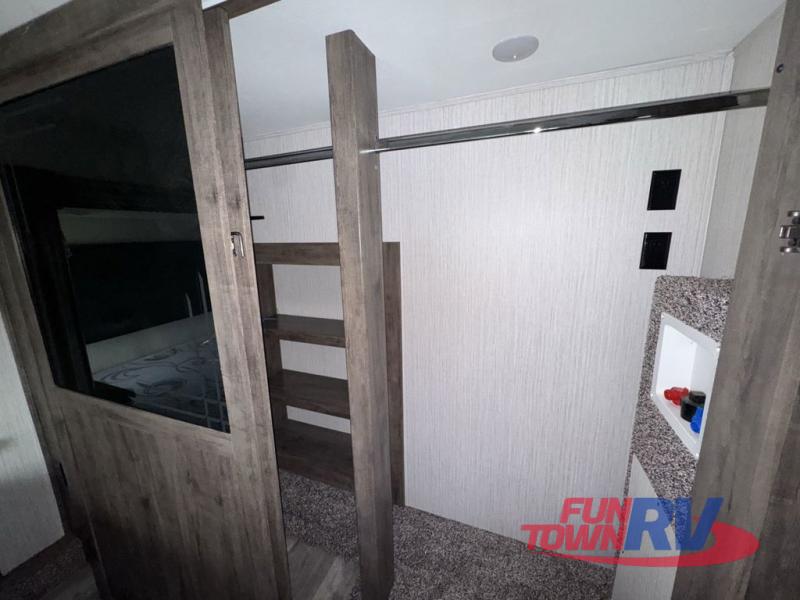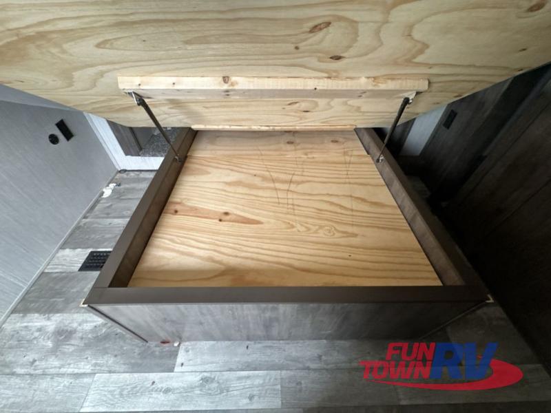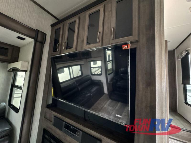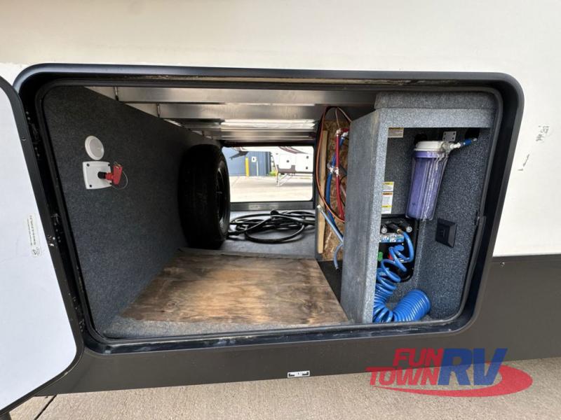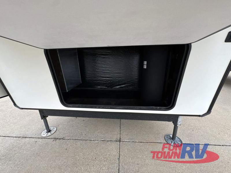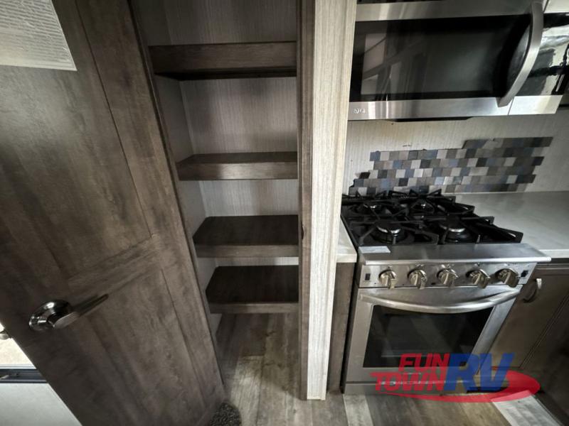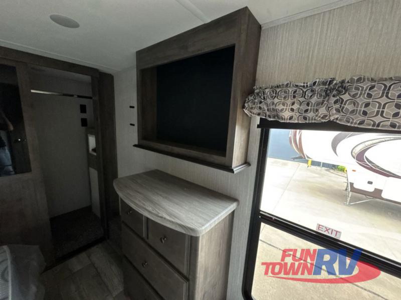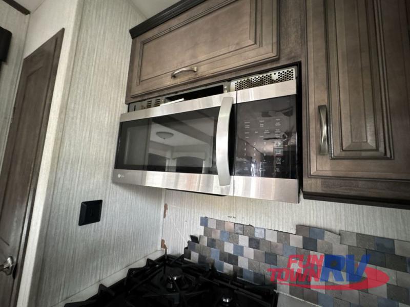 This open concept kitchen gives the cook plenty of space to prepare and serve meals for gatherings for friends and family, plus six people can visit while relaxing on the separate living room furniture which includes dual tri-fold hide-a-bed sofas that double as sleeping space, and a 50" LED HDTV with fireplace below. Some friends might be playing games at the free-standing dinette while they wait for the meal. The large pantry and 20 cu. ft. refrigerator give you even more space for snacks, dry goods and leftovers. You will enjoy having a walk-around king bed slide that gives you plenty of space in the bedroom to get to the full wall wardrobe with shelves, plus there is a space prepped for a washer/dryer option if you would like to add those appliances. And the full bathroom includes a walk-in shower with a seat, plus dual bath sinks so you and your spouse can freshen up at once!