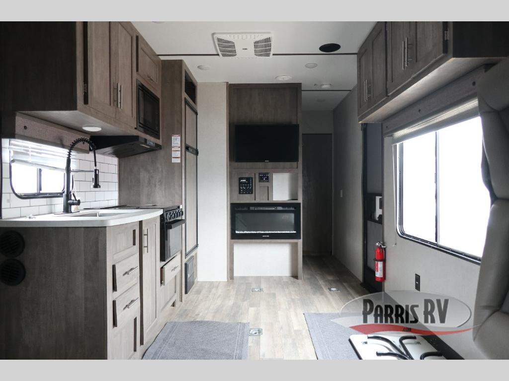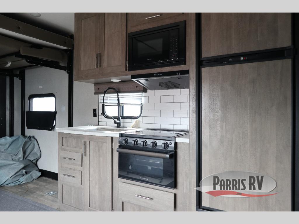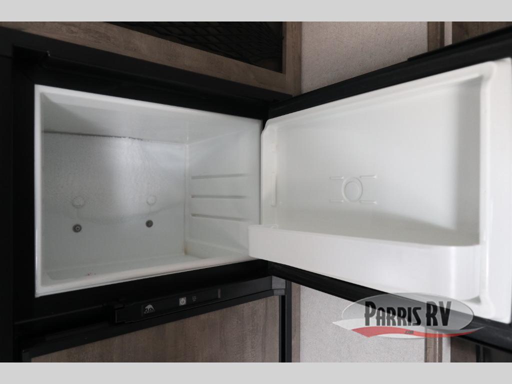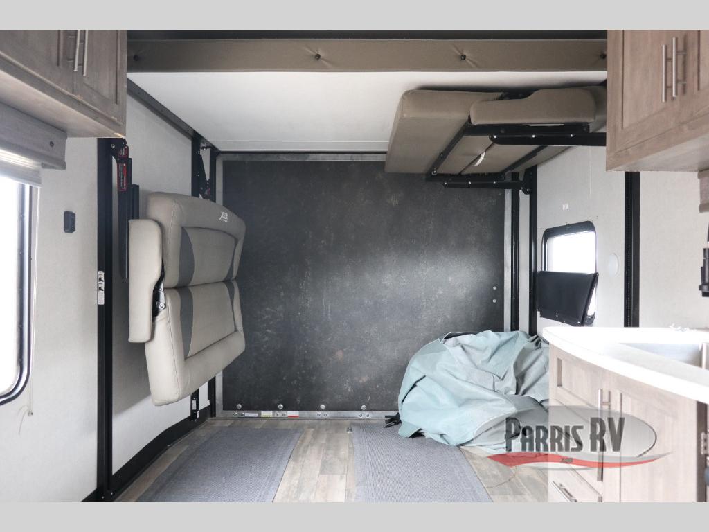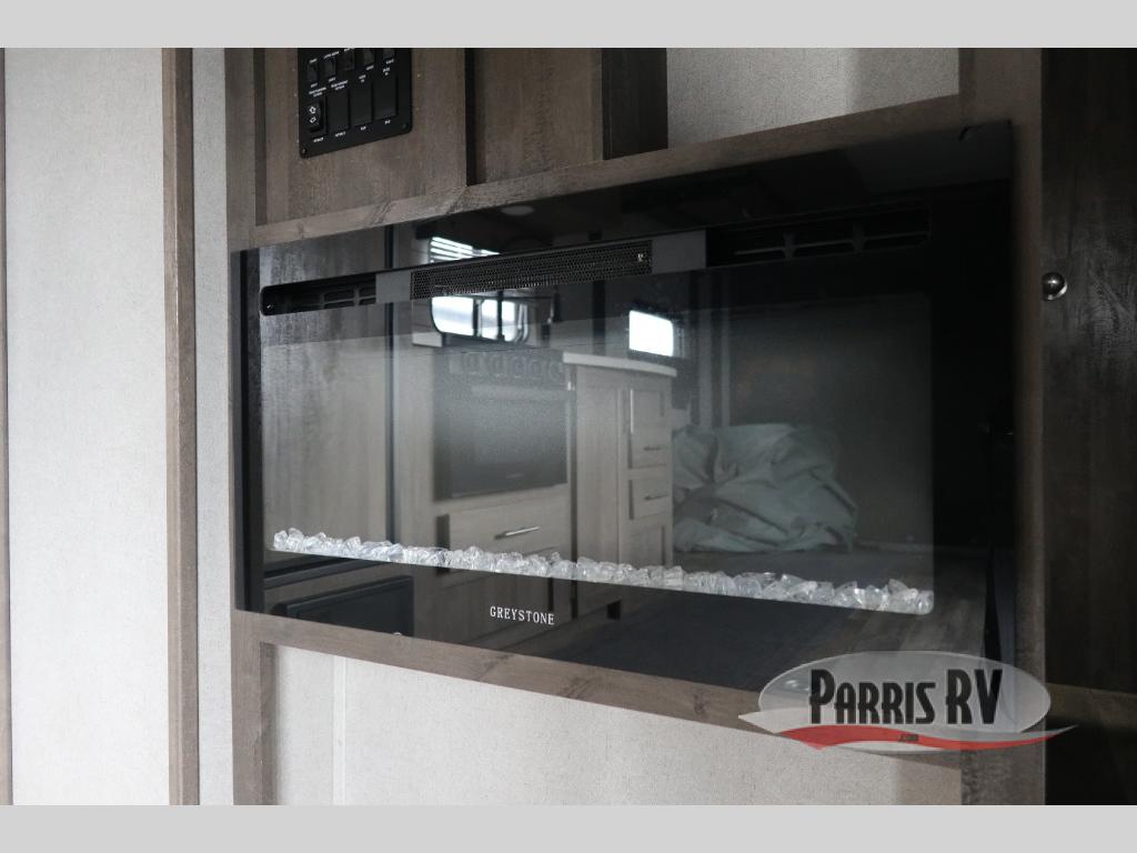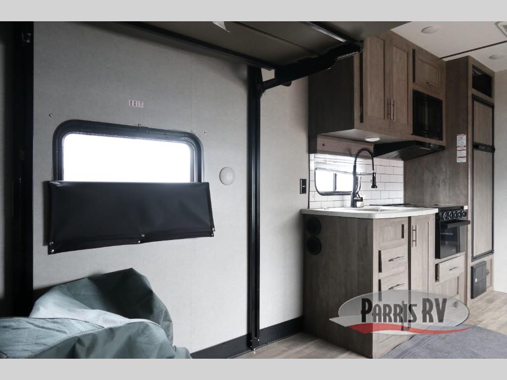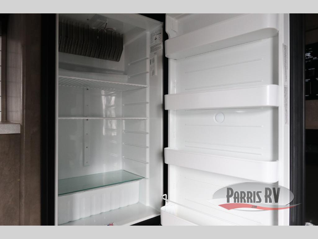 You will love how easy it is to access the dual entry bathroom from the front private bedroom in this toy hauler! Maximize your camping experience with friends and family by adding the optional electric bed and max clearance dinette to the rear and the optional Euro chairs near the fireplace in the living/kitchen area. The kitchen has a three burner cooktop so you can enjoy home cooked meals while camping and a 10 cu. ft. black stainless steel refrigerator to keep your beverages nice and cold!