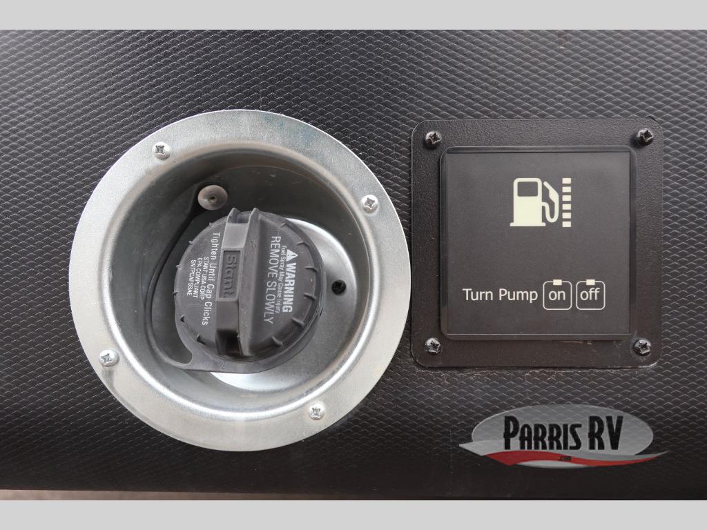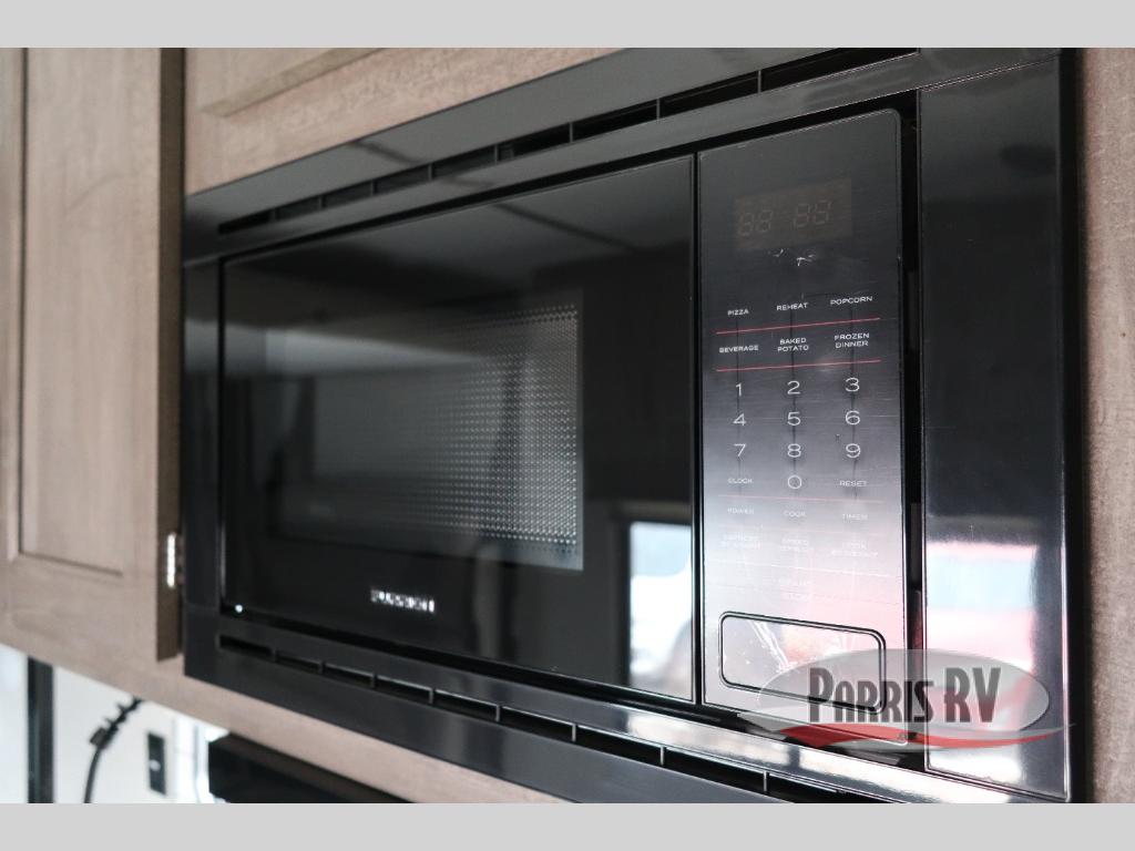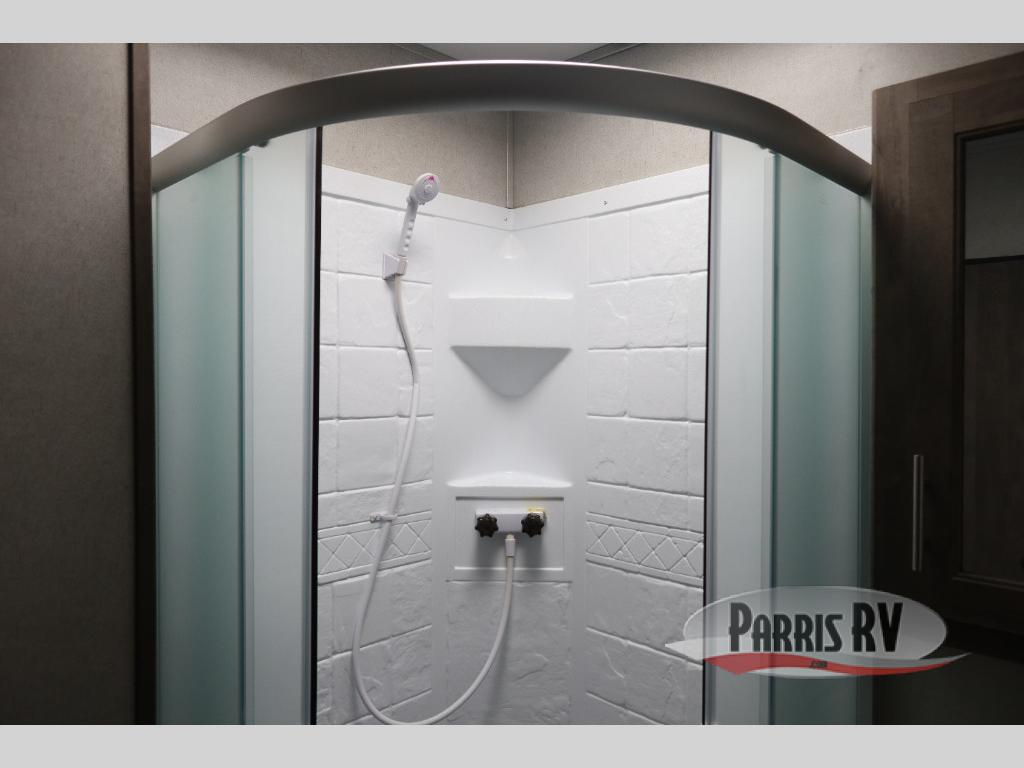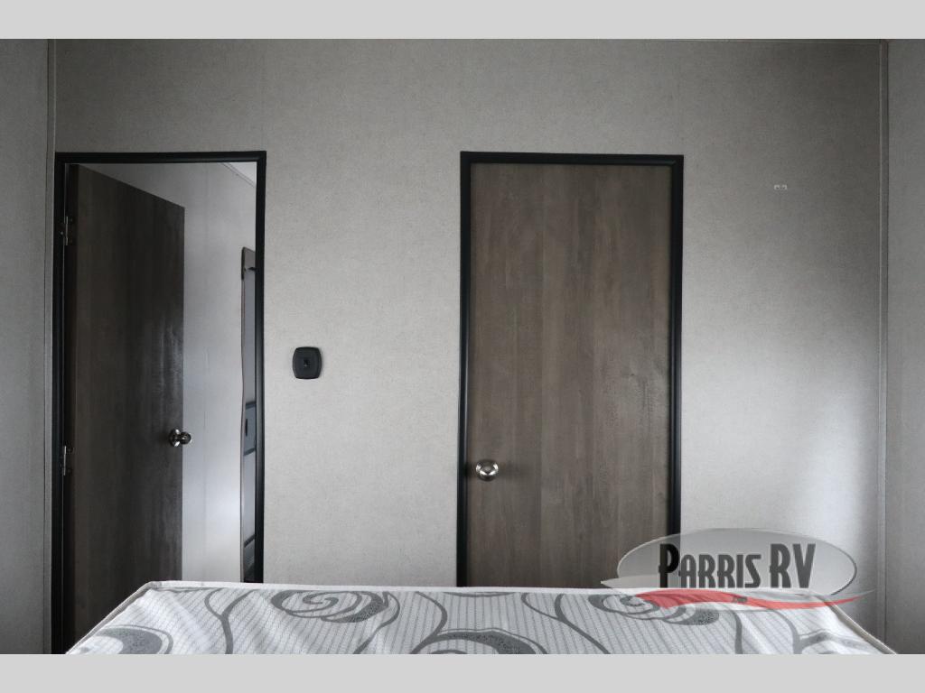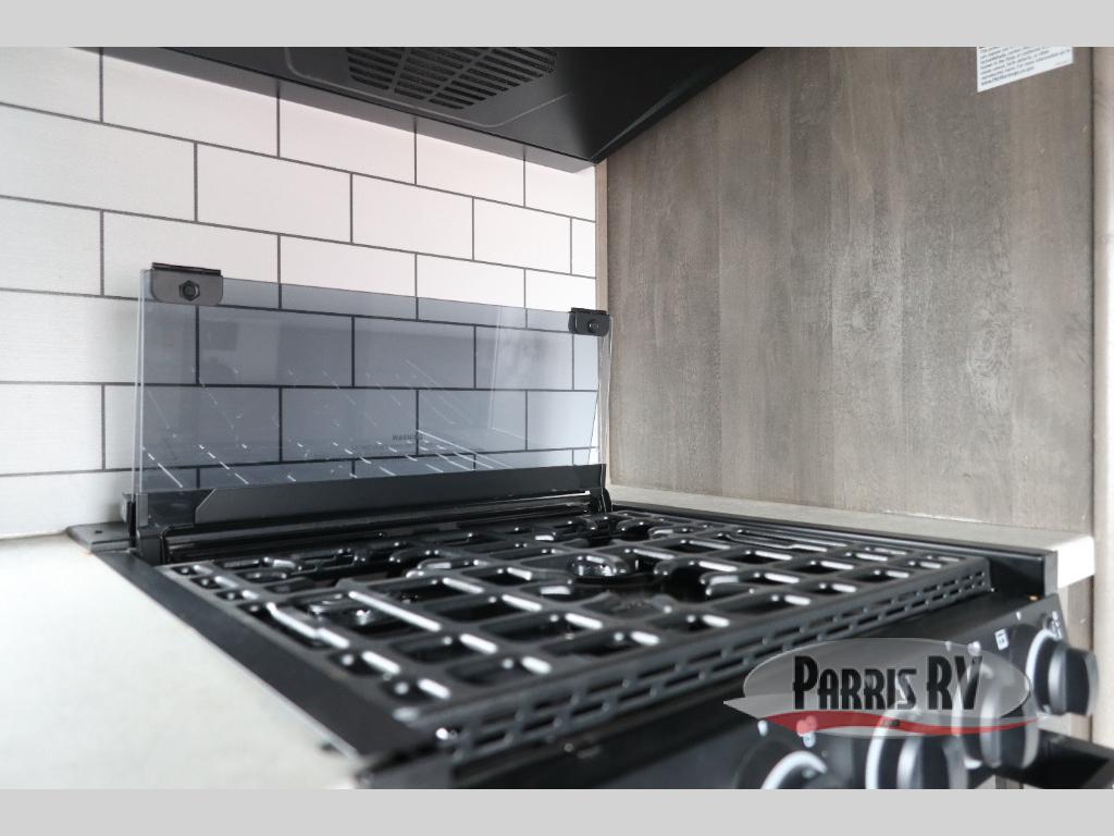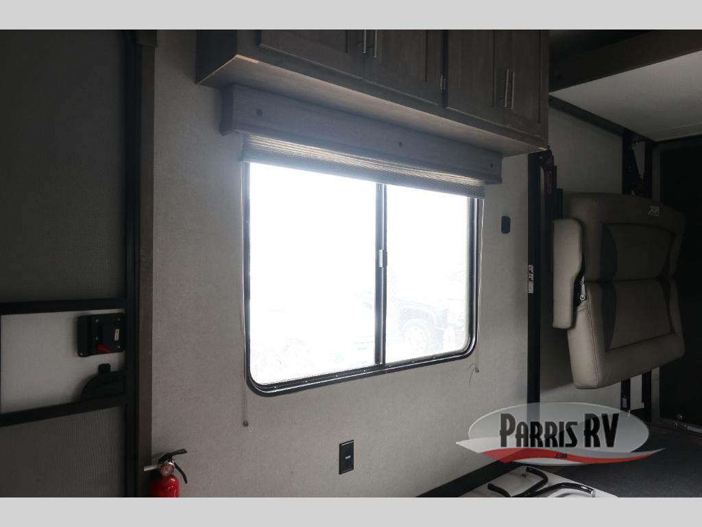 You will love how easy it is to access the dual entry bathroom from the front private bedroom in this toy hauler! Maximize your camping experience with friends and family by adding the optional electric bed and max clearance dinette to the rear and the optional Euro chairs near the fireplace in the living/kitchen area. The kitchen has a three burner cooktop so you can enjoy home cooked meals while camping and a 10 cu. ft. black stainless steel refrigerator to keep your beverages nice and cold!